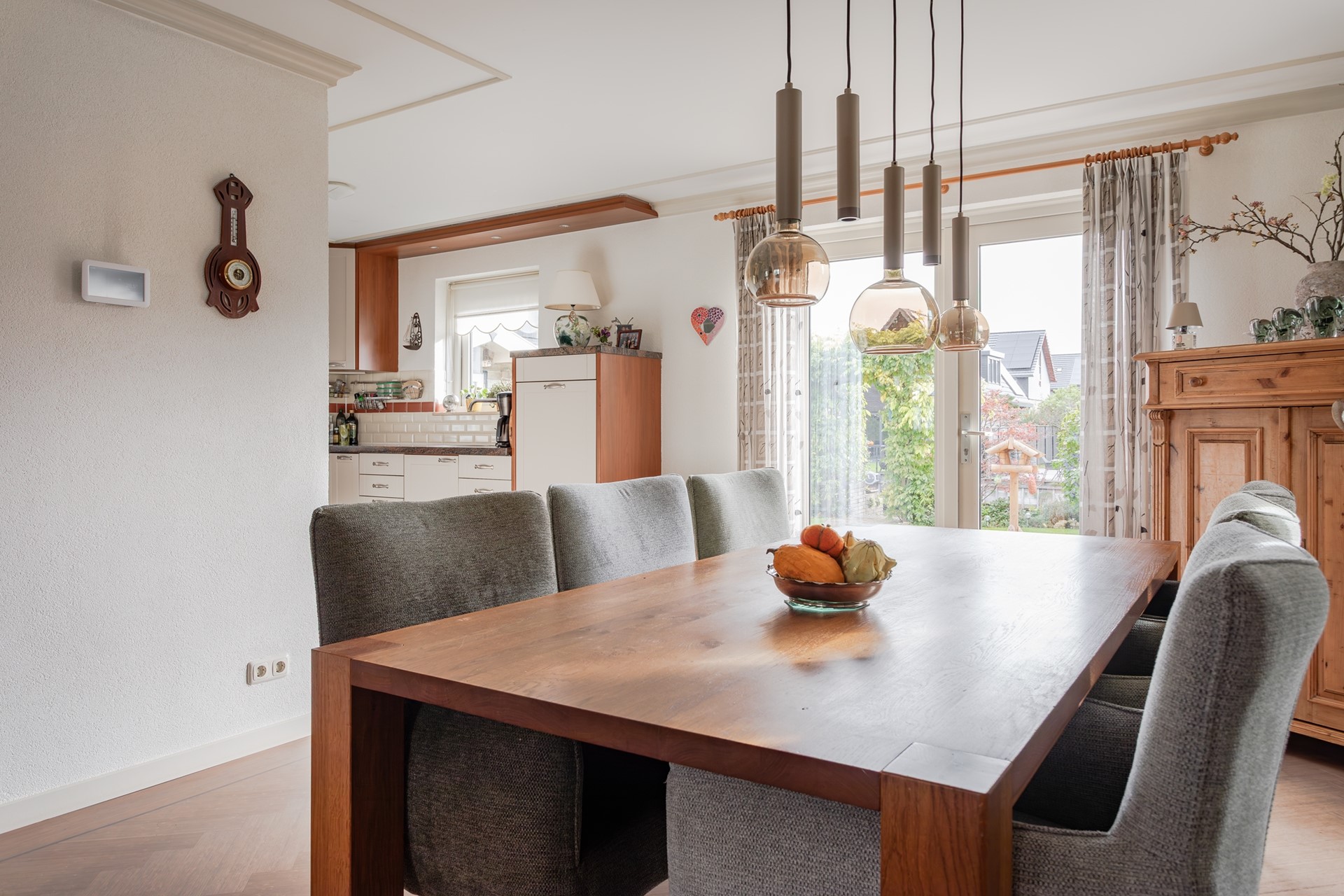 Bij de eethoek waar een grote tafel geplaatst kan worden geven openslaande deuren toegang tot de tuin.