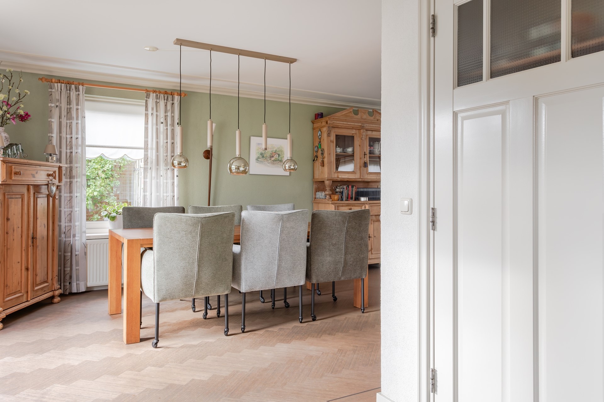 Vanuit de hal geeft een paneeldeur met glas-in-lood en sierlijke deurpost toegang tot de ruime living met een erker voorzien van inbouwspots en vooral veel lichtinval. Op de vloer ligt een sfeervolle bamboe visgraatvloer met een sierrand, de wanden zijn spachtelputz gestuukt en het plafond is strak gestuukt met een sierrand. De living wordt verwarmd door radiatoren, meerdere ramen kunnen open, alle ramen zijn voorzien van HR+ glas en fraaie travertin vensterbanken.