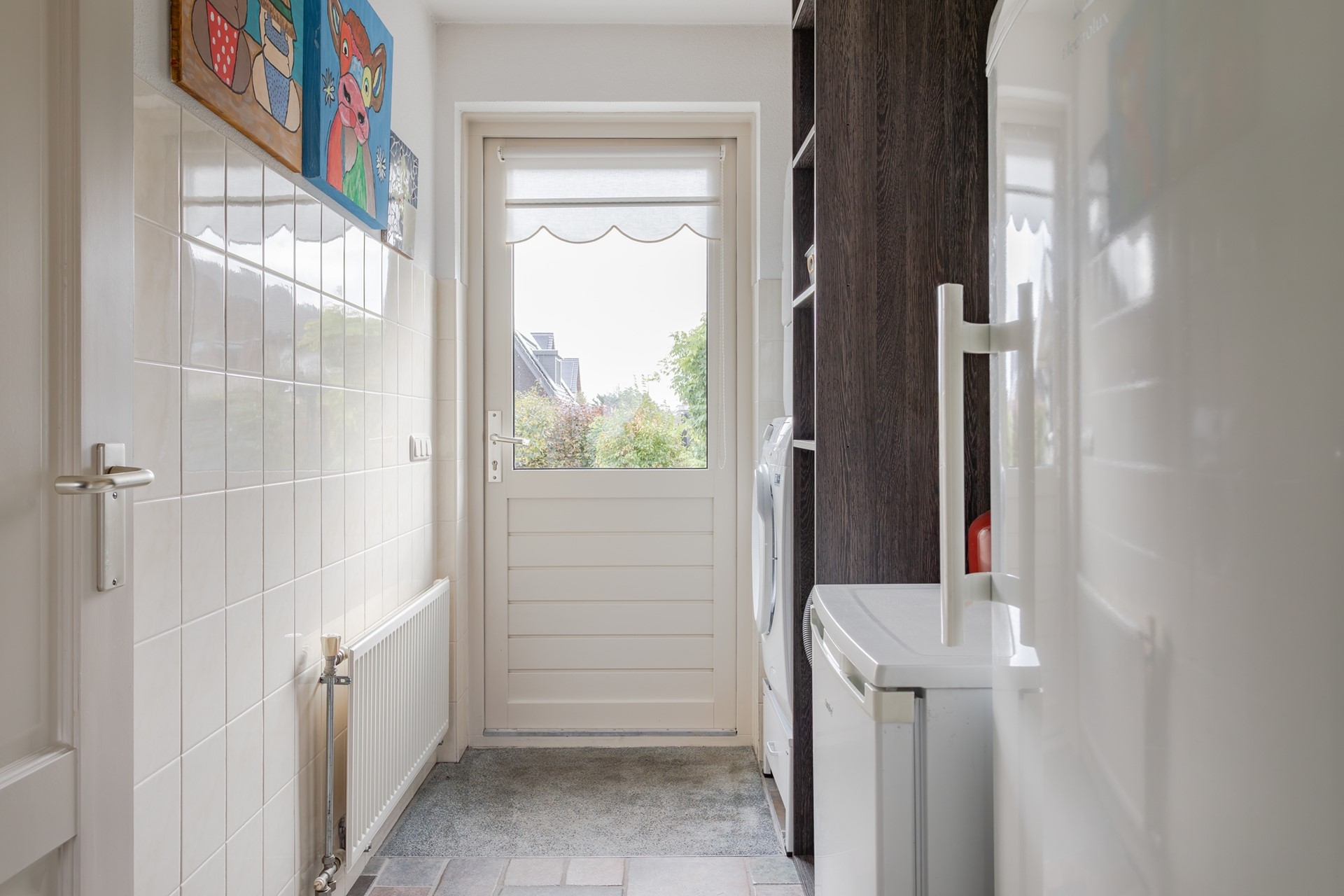 Ideaal, zo’n bijkeuken! U treft hier de wasmachine- en drogeraansluiting, de cv-installatie en plek voor een extra koelkast en/of bergkast. De wanden zijn grotendeels licht betegeld en de vloer vanuit de hal is hier doorgelegd met een afvoerputje.