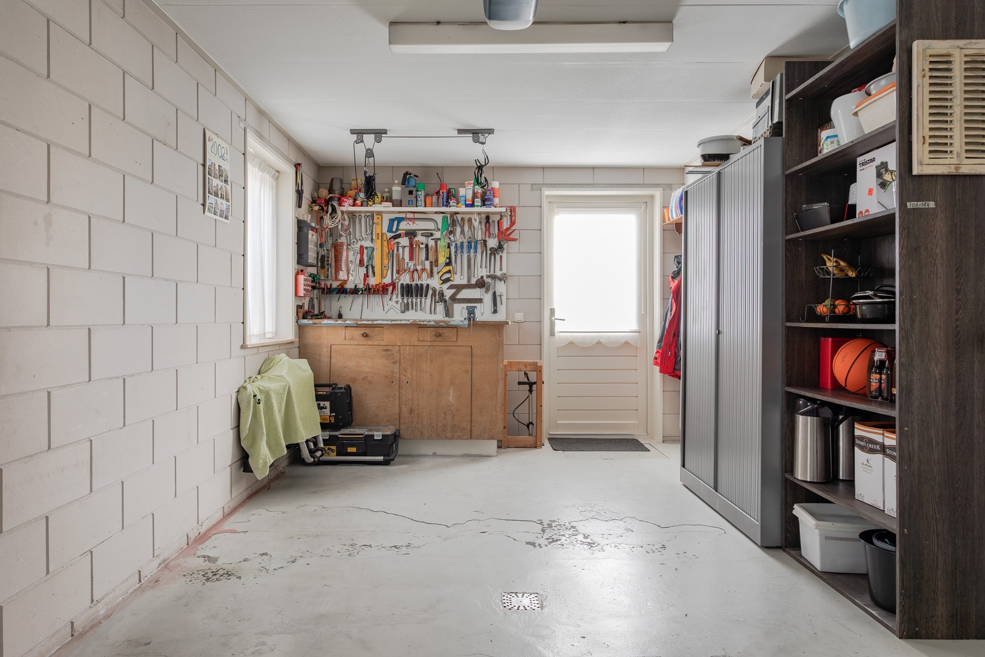 Inpandig te bereiken garage met een elektrisch te bedienen en geïsoleerde segmentendeur. Er ligt een betonnen vloer met een afvoerputje en bij de tuindeur zit een 2e kruipluik. Er is een wasbak met warm en koud watertoevoer, een fijne werkbank, prettig lichtinval vanwege de 2 zijramen met dubbel glas met zelfs hier travertin vensterbanken en een radiator om de garage vorstvrij te houden.