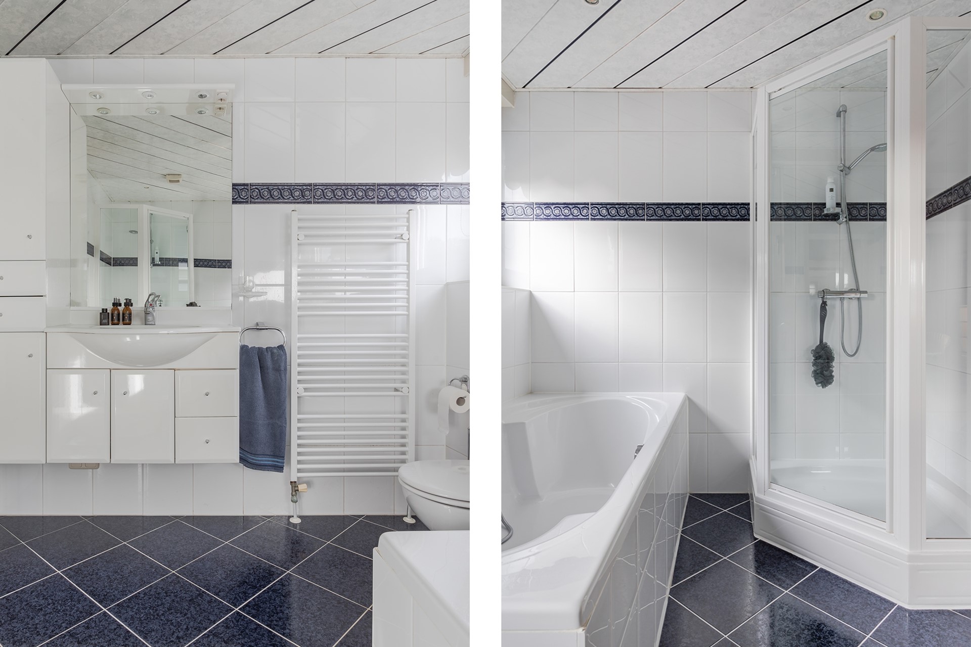 De ruime badkamer heeft recht opgetrokken, licht betegelde wanden en een brede dakkapel met 2 draai/kiepramen. Op de vloer liggen donkere tegels, het plafond is uitgevoerd in kunststof met inbouwspots en de mechanische afzuiger werkt op de lichtknop. Er kan dus goed worden geventileerd. Verder voorziet de badkamer in een duo ligbad met thermostaatkraan en handdouche, een douchecabine met glazen deuren, ook voorzien van een thermostaatkraan, een 2e wandcloset, designradiator en een wastafelmeubel met een grote wandspiegel, kastjes, verlichting en een stopcontact.