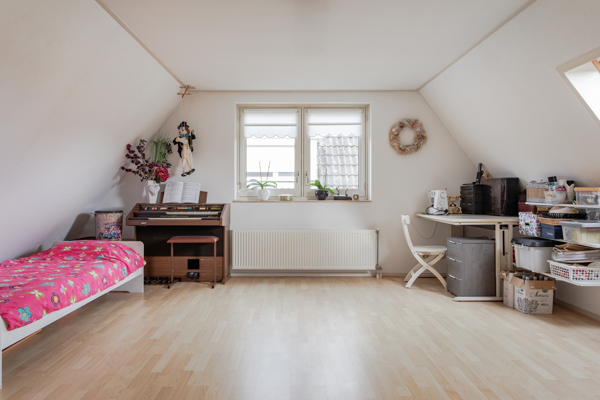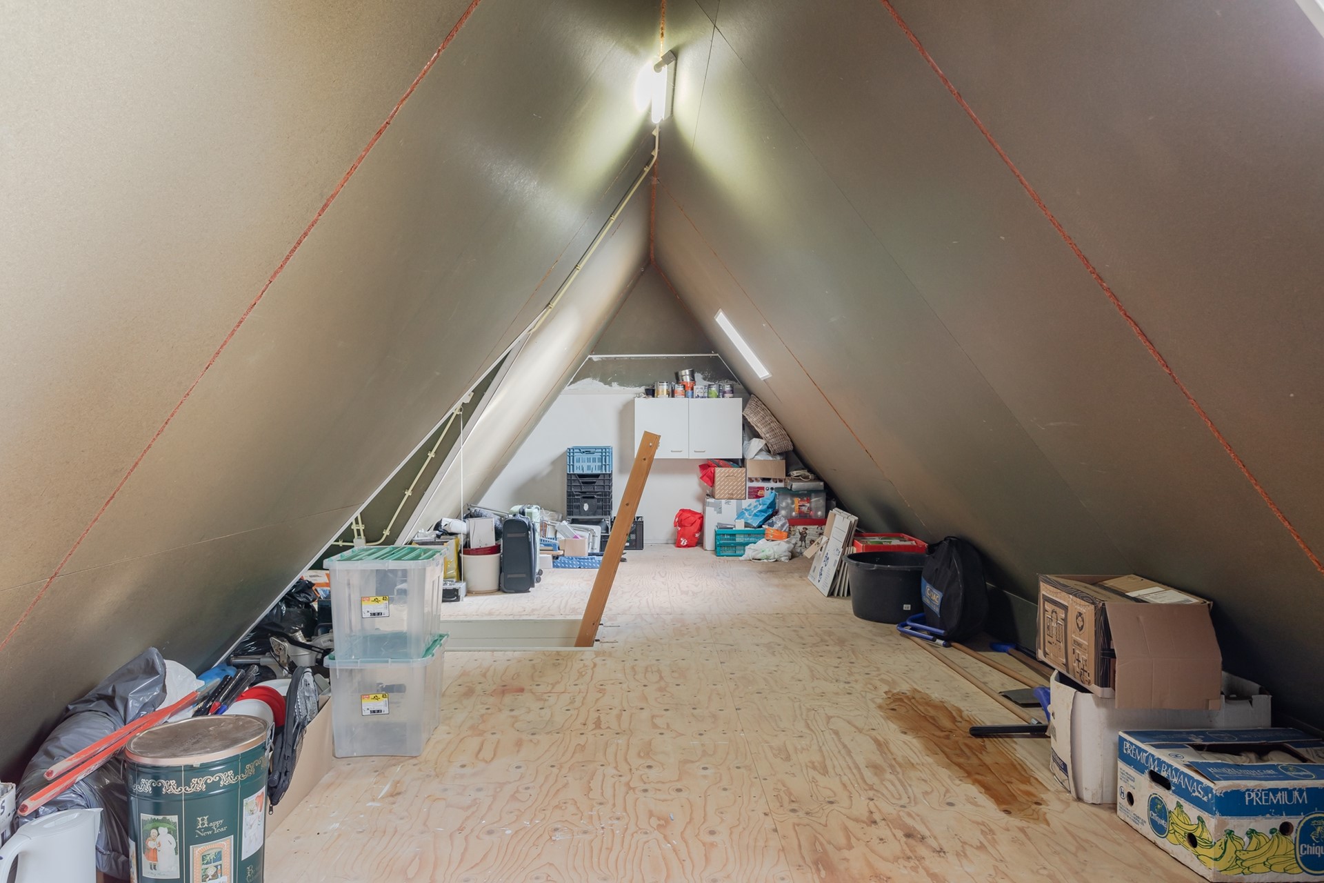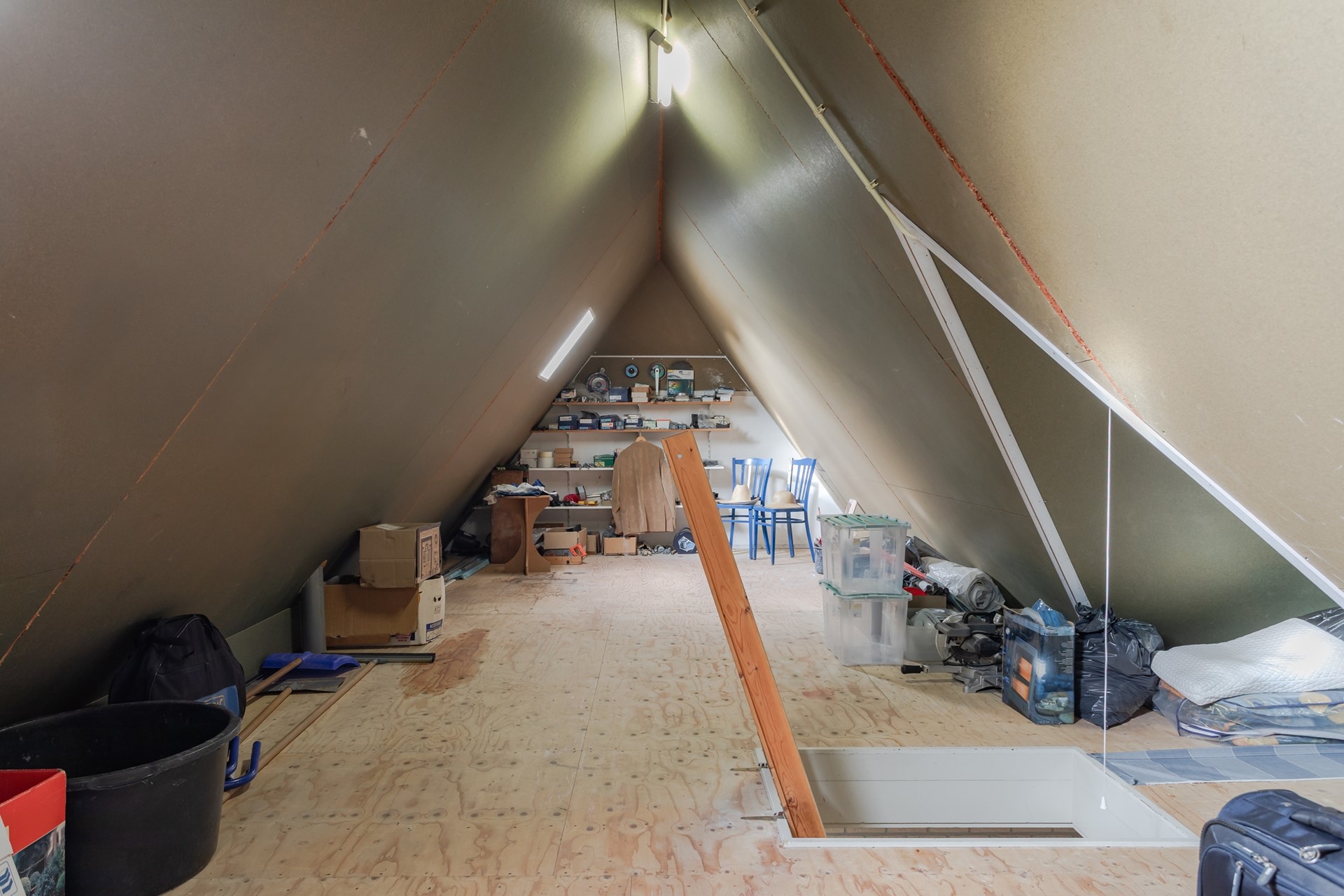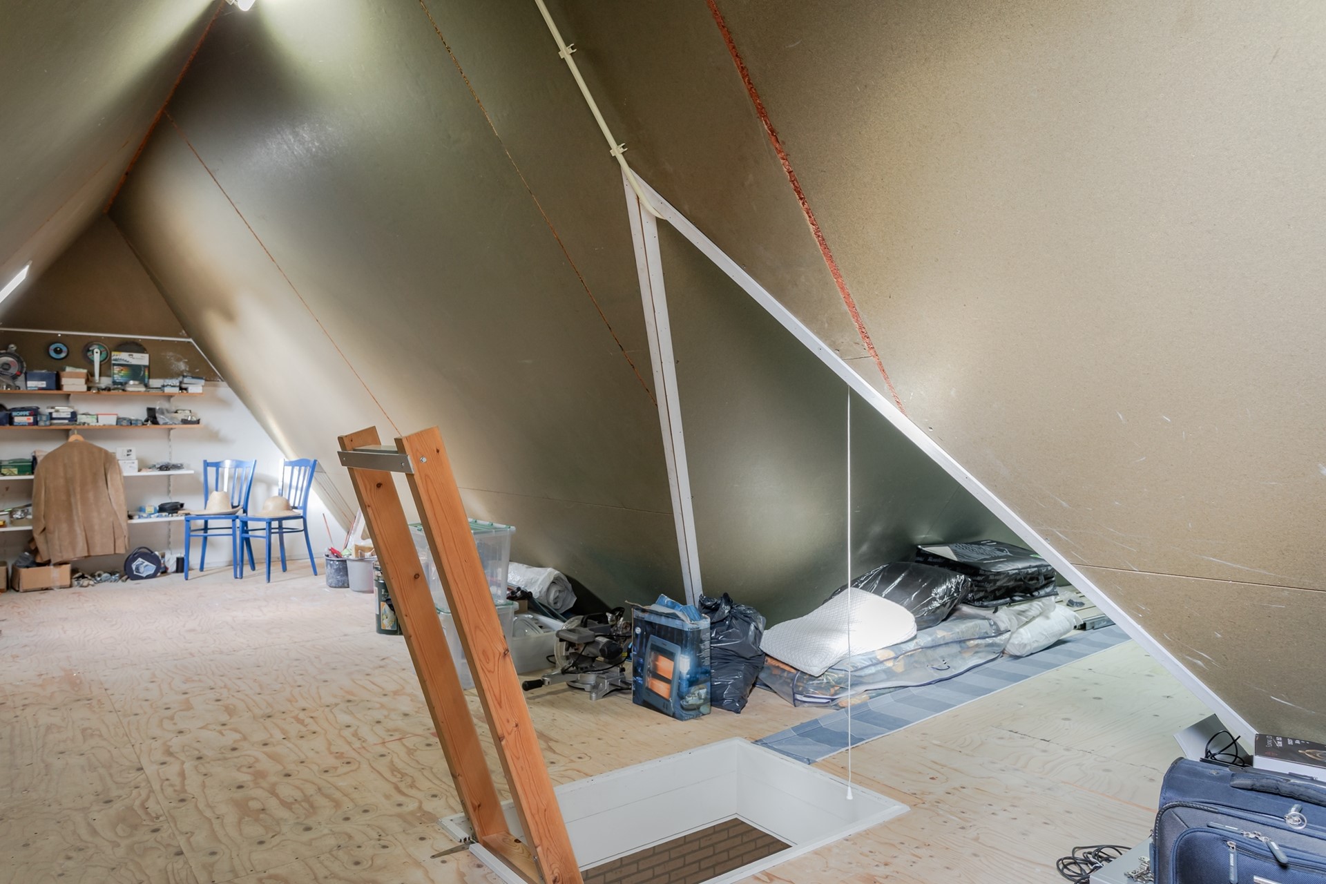 Vanaf de overloop geeft een uitschuiftrap toegang tot de riante zolderverdieping met verlichting. De ruimte is geheel bevloerd, stahoogte, geïsoleerd en er is fijn lichtinval via de 2 ramen die ook open kunnen voor de ventilatie. Het centraal afzuigsysteem is hier geplaatst.