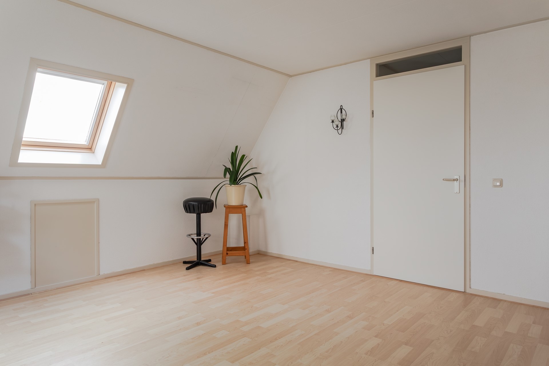3e slaapkamer voorzijde – leuke afmeting kamer met strak gestuukte wanden, vloerbedekking en raam met zicht op de gezellige straat.