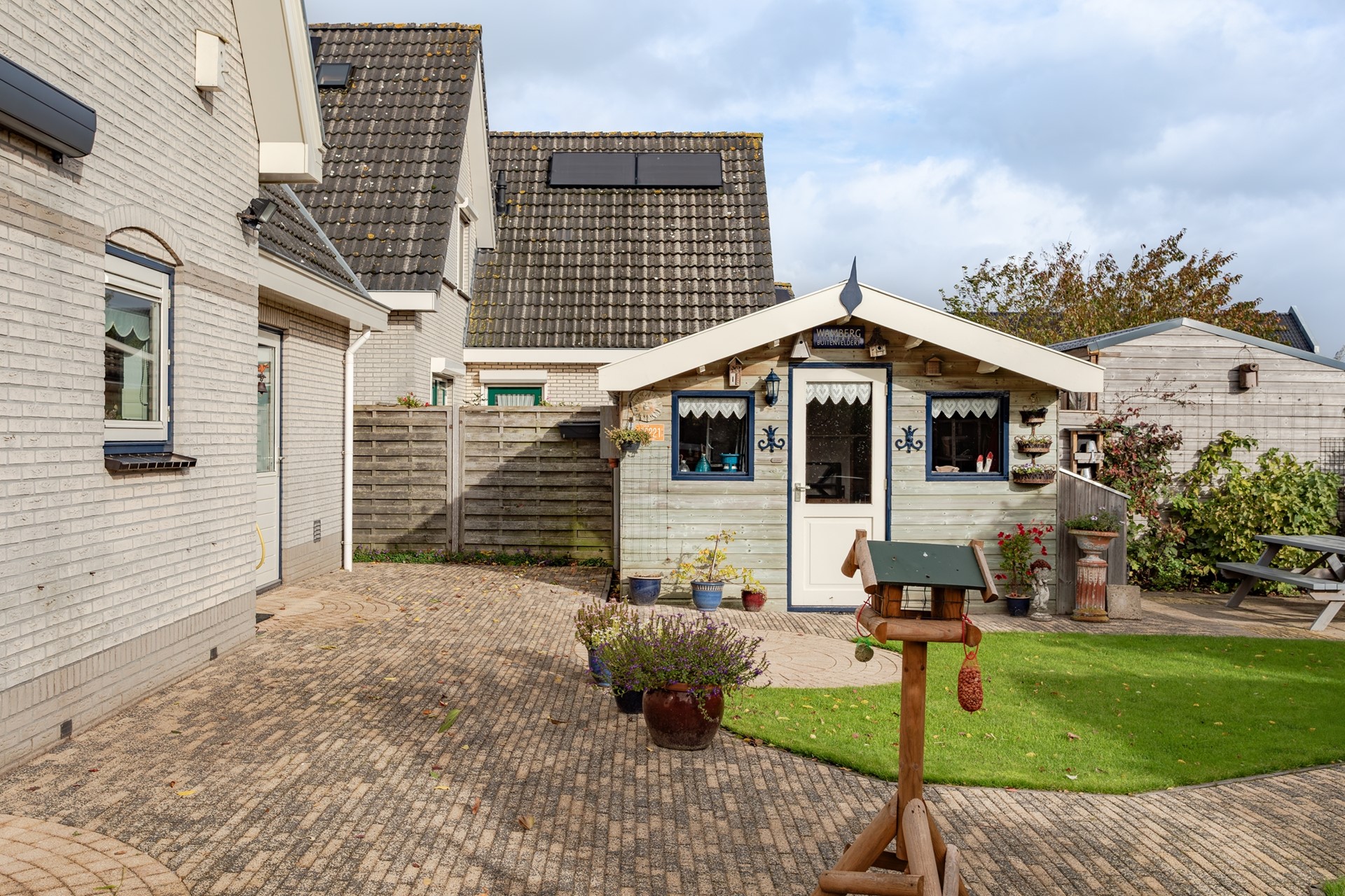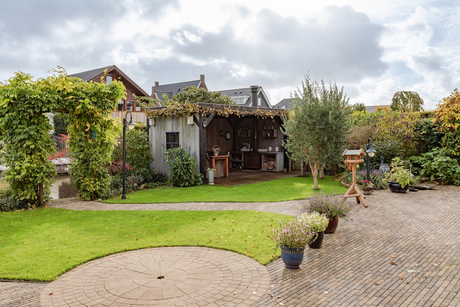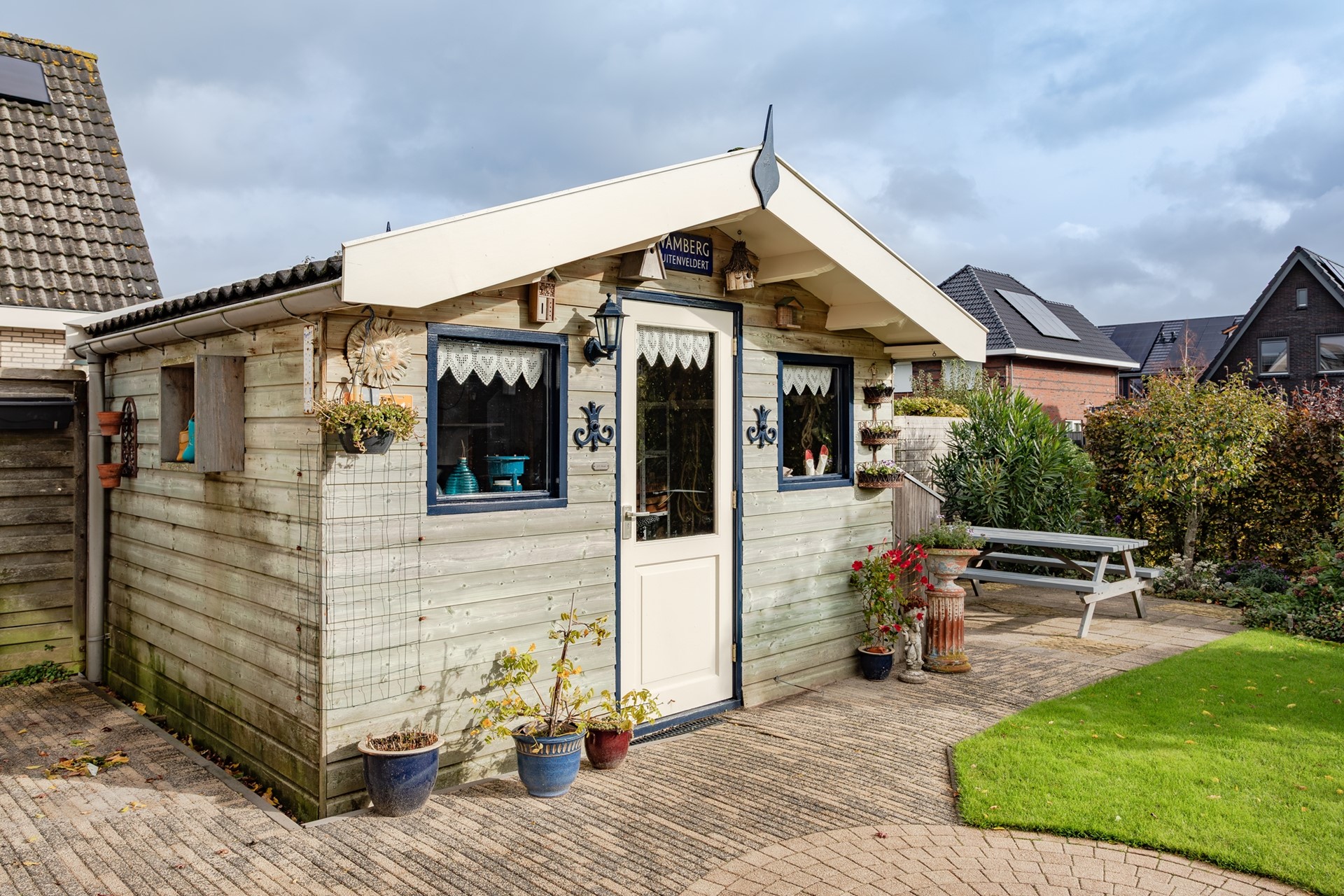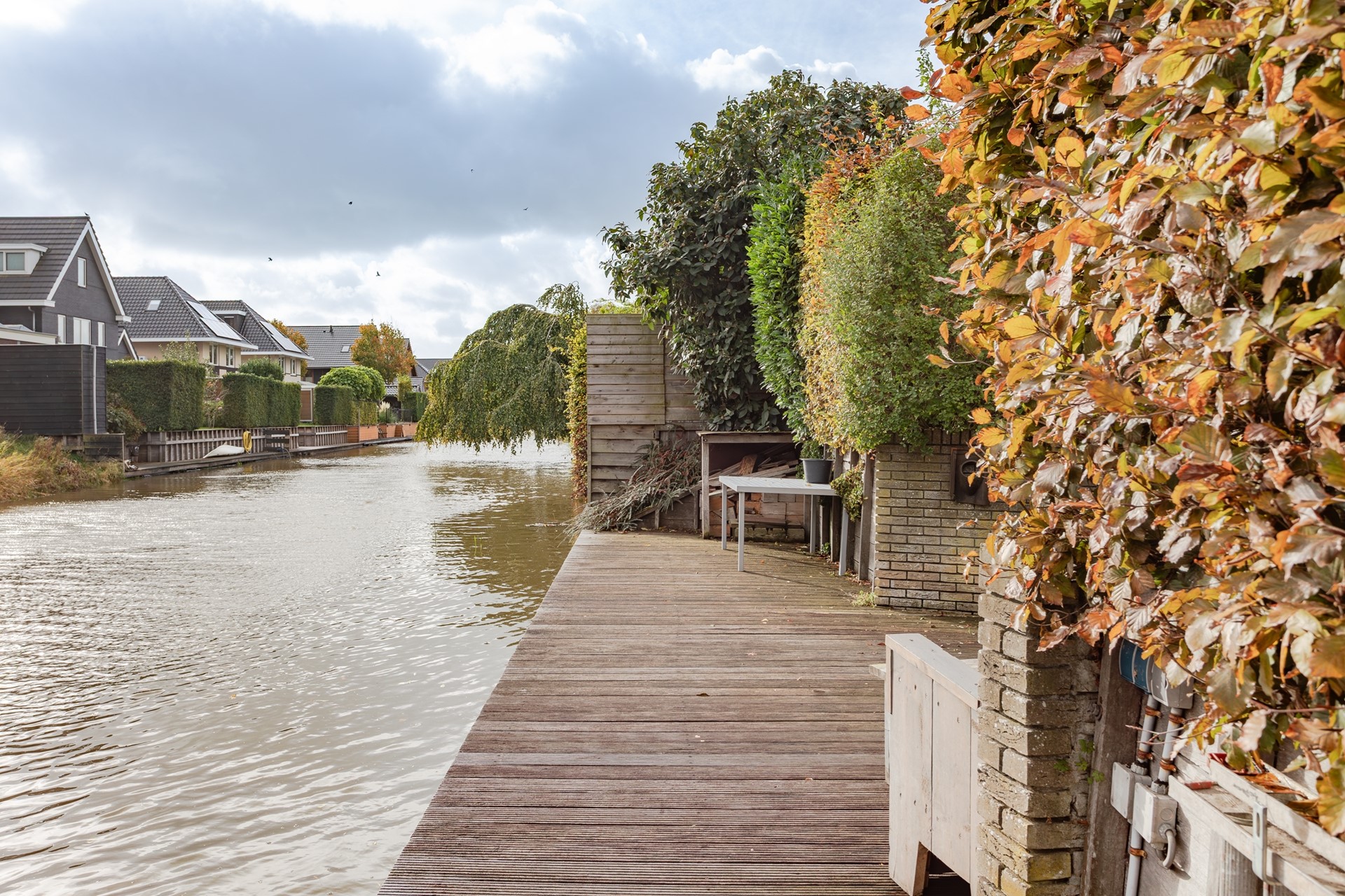 De sfeervolle tuin, gelegen aan een brede sloot met groot waterterras en een gezellige veranda is beslist een “selling-point” bij deze woning. Hoewel de tuinligging anders doet vermoeden kunt u hier volop van zon en op het heetst van de dag van de schaduw genieten. De tuin is aan beide zijden afgesloten door een poort, de bestrating ligt er strak in. Het tuinhuis met verlichting, stopcontacten met een afmeting van 3 x 4 meter en een pannendak geeft plek voor uw tuingereedschap. Bij de achtergevel zit een vorstvrije buitenkraan met haspel.