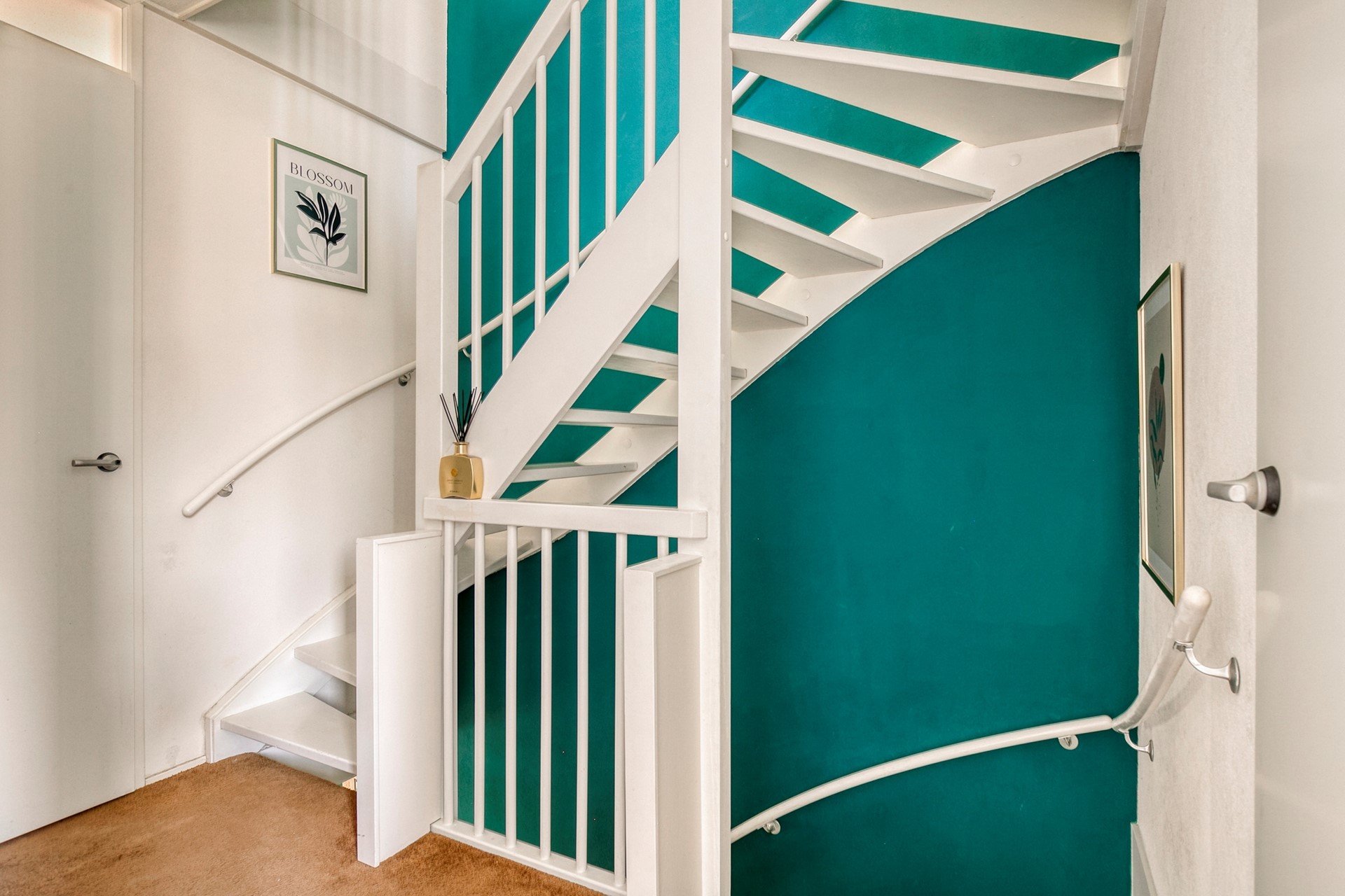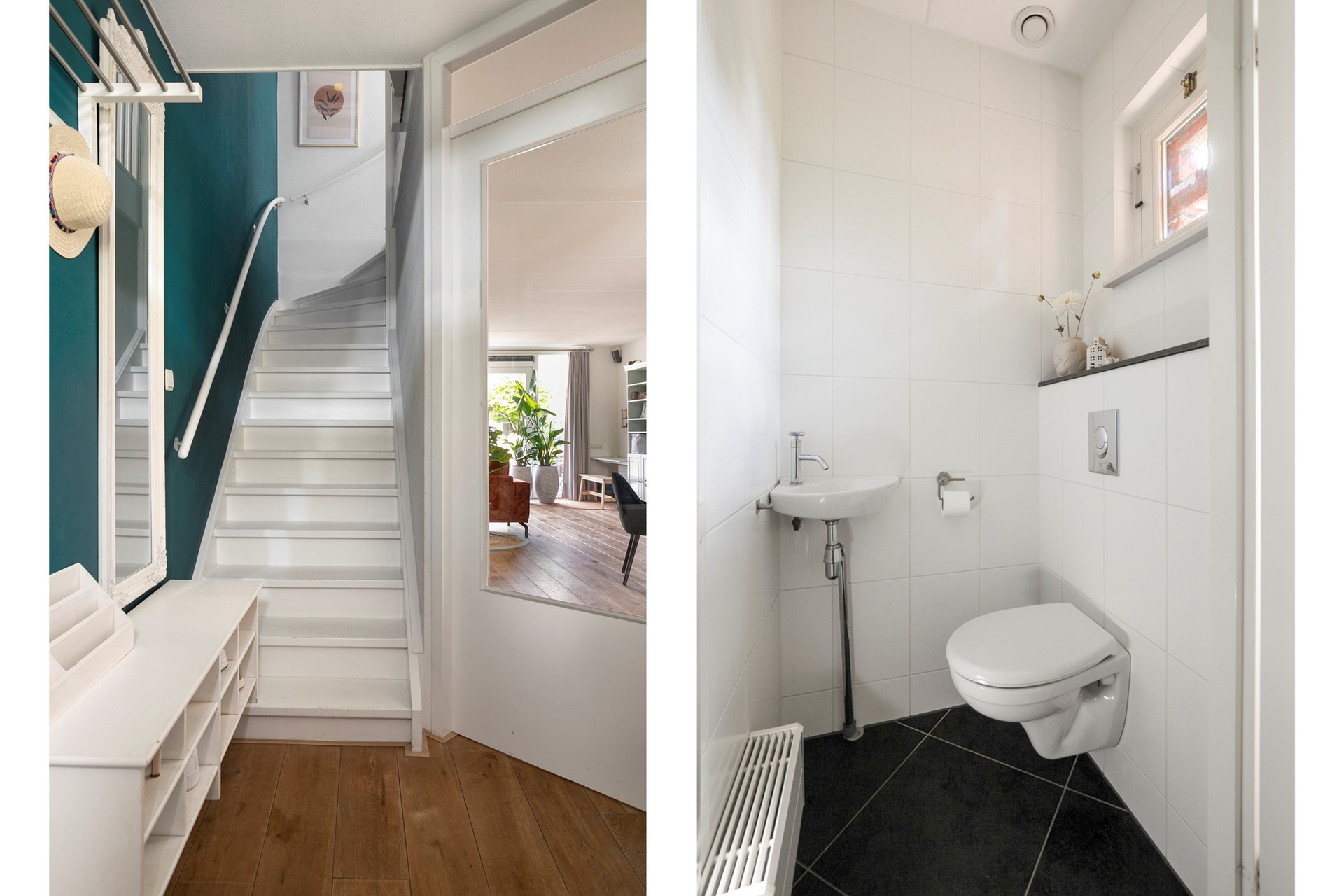 In de voortuin ingericht met hortensia’s en twee bescheiden boompjes zult u zeker, zo nu en dan een kopje koffie drinken in het ochtendzonnetje. Prettige hal, voordeur met driepuntsluiting. Op de wand is voldoende ruimte voor planken en haakjes voor uw jassen en tassen. Grote inloopmat, ideaal voor de ‘vieze schoenen’. Rechts de meterkast (met glasvezelaansluiting) en de toiletruimte, volledig betegeld met diagonaal gelegde zwarte vloertegels en witte hoogglans wandtegels. Verder een net wandcloset en een hoekfonteintje. Plezierig ook, een valraampje voor daglicht en frisse lucht. Rechtdoor de trap naar boven, lekker fris wit geschilderd, en de deur met glas naar de living.