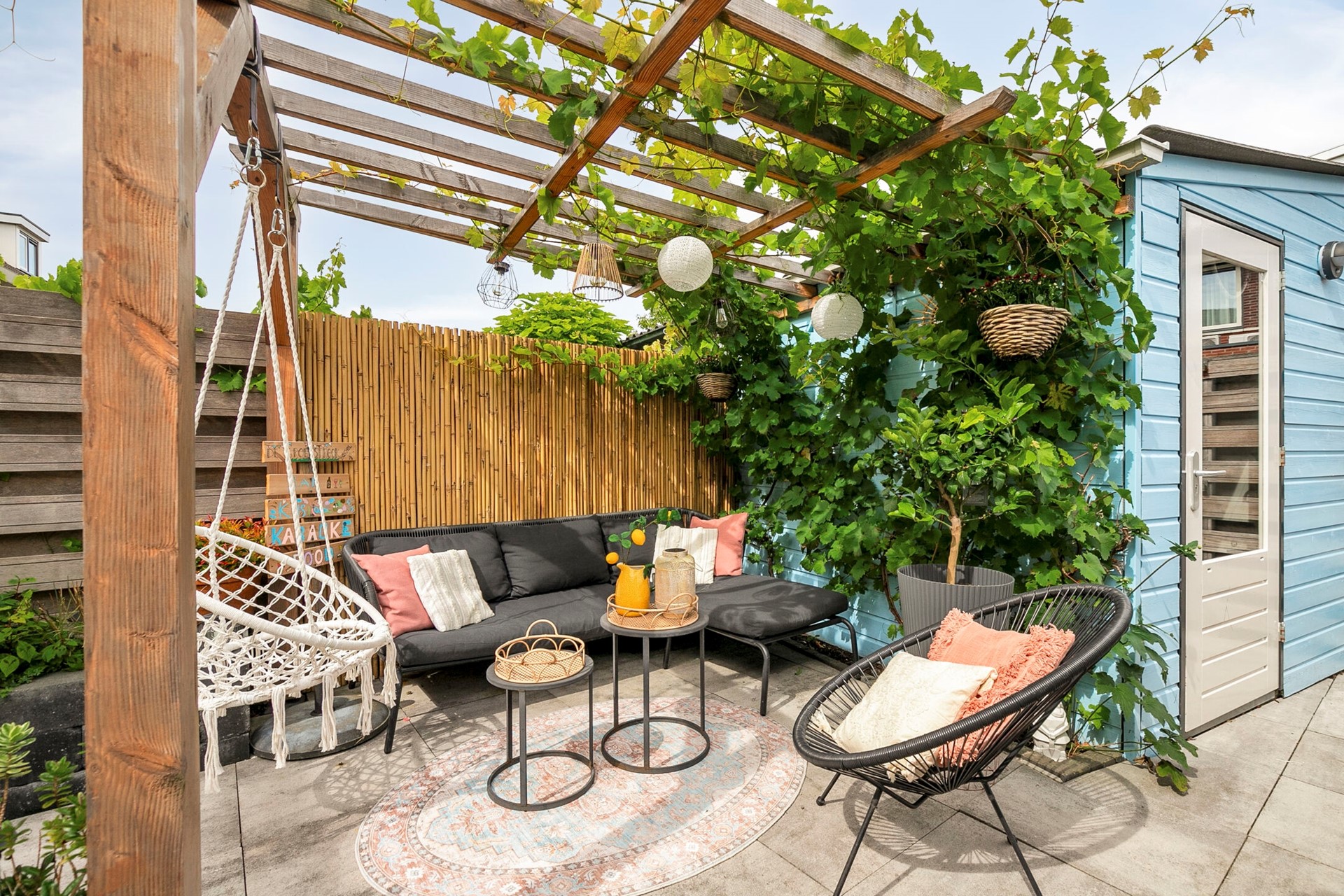 De trots van de eigenaren! Niets aan doen, gewoon meteen genieten van de bijzondere sfeer in deze kleurrijke en groene tuin. U geniet hier van de middag- en avondzon. Het terras is vernieuwd in 2022 en bestaat uit grijsgemêleerde terrastegels. Twee geweldige zits! Eén is op maat gemaakt op, jawel, een bloembak, onder de groenblijvende jasmijn, een hoekbank die nu wordt gecombineerd met een speelse ronde tafel en aan de andere zijde stoelen. Avondeten wordt hier een feestje. Wilt u iets meer schaduw dan geniet u onder de pergola met weelderig groeiende druif op een luie loungebank. Een buitenkraan en elektra voor tuinverlichting is aanwezig, als ook een berging en een achterom.
