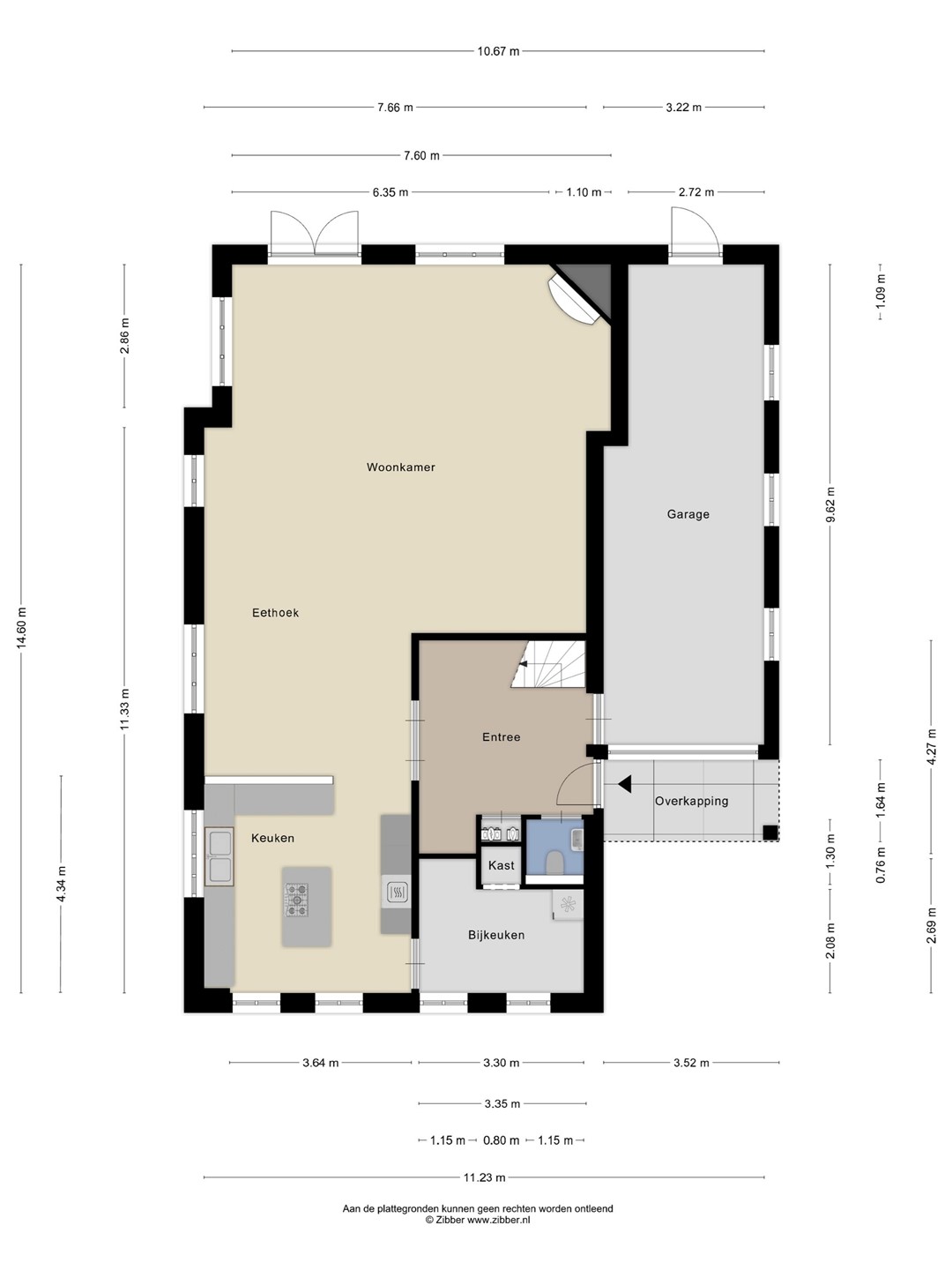 Parkeren kan op eigen terrein en een overdekte entree geeft toegang tot de woning. Achter de voordeur treft u een royale hal met trapopgang naar de vide en veel lichtinval vanwege het daglicht. Onder de trap is een ruime garderobehoek, op de vloer liggen grote lichte natuurstenen vloertegels met vloerverwarming wat in de living, bijkeuken en keuken is doorgelegd. Dit is voor de begane grond ook de hoofdverwarming. Overal zijn massief houten paneeldeuren in houten deurposten geplaatst. Het toilet heeft licht betegelde wanden, een wandcloset, wastafelmeubel met fonteintje, inbouwspots en een centraal afzuigsysteem.