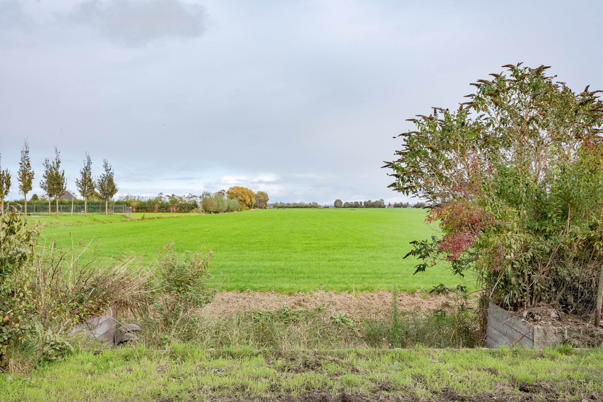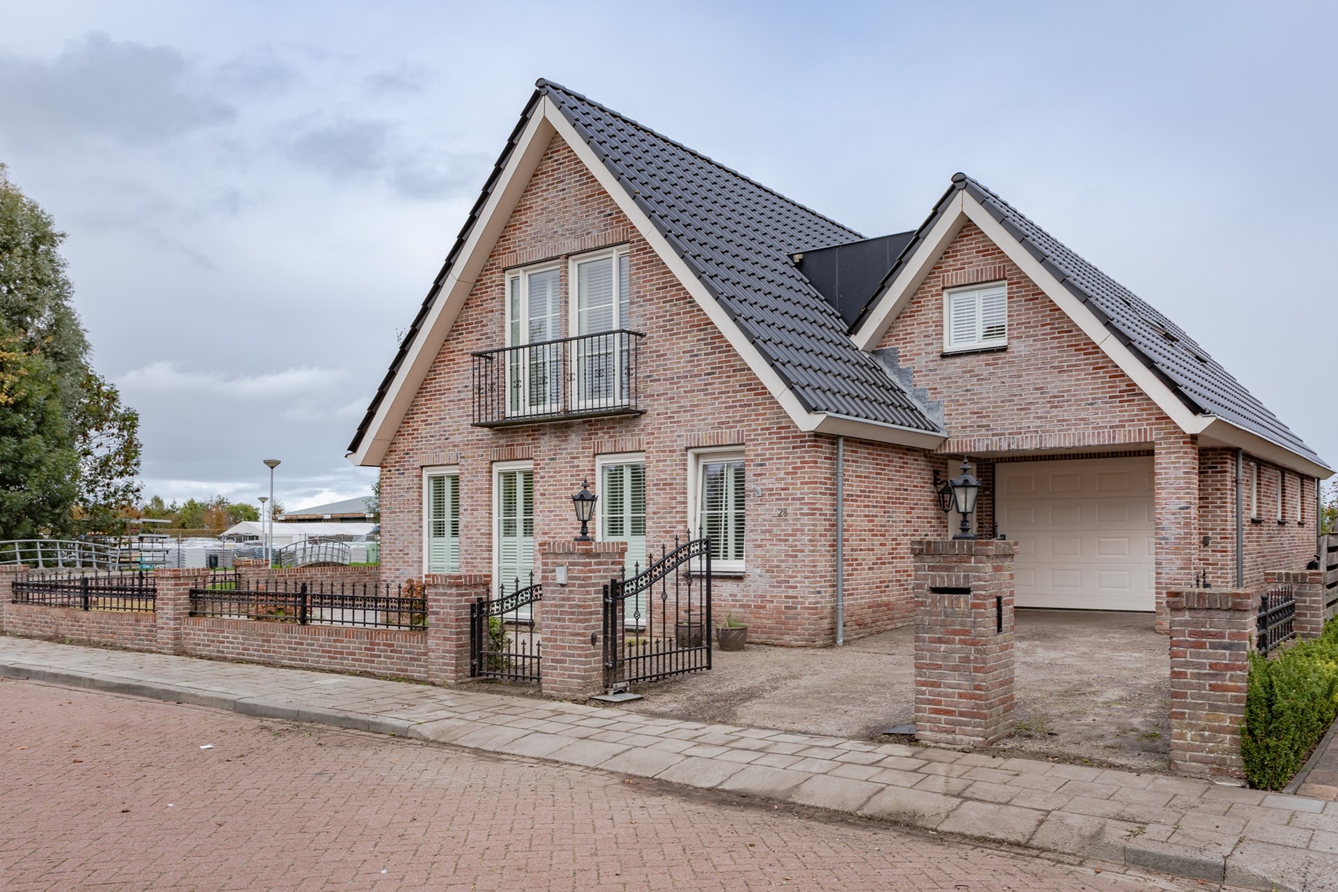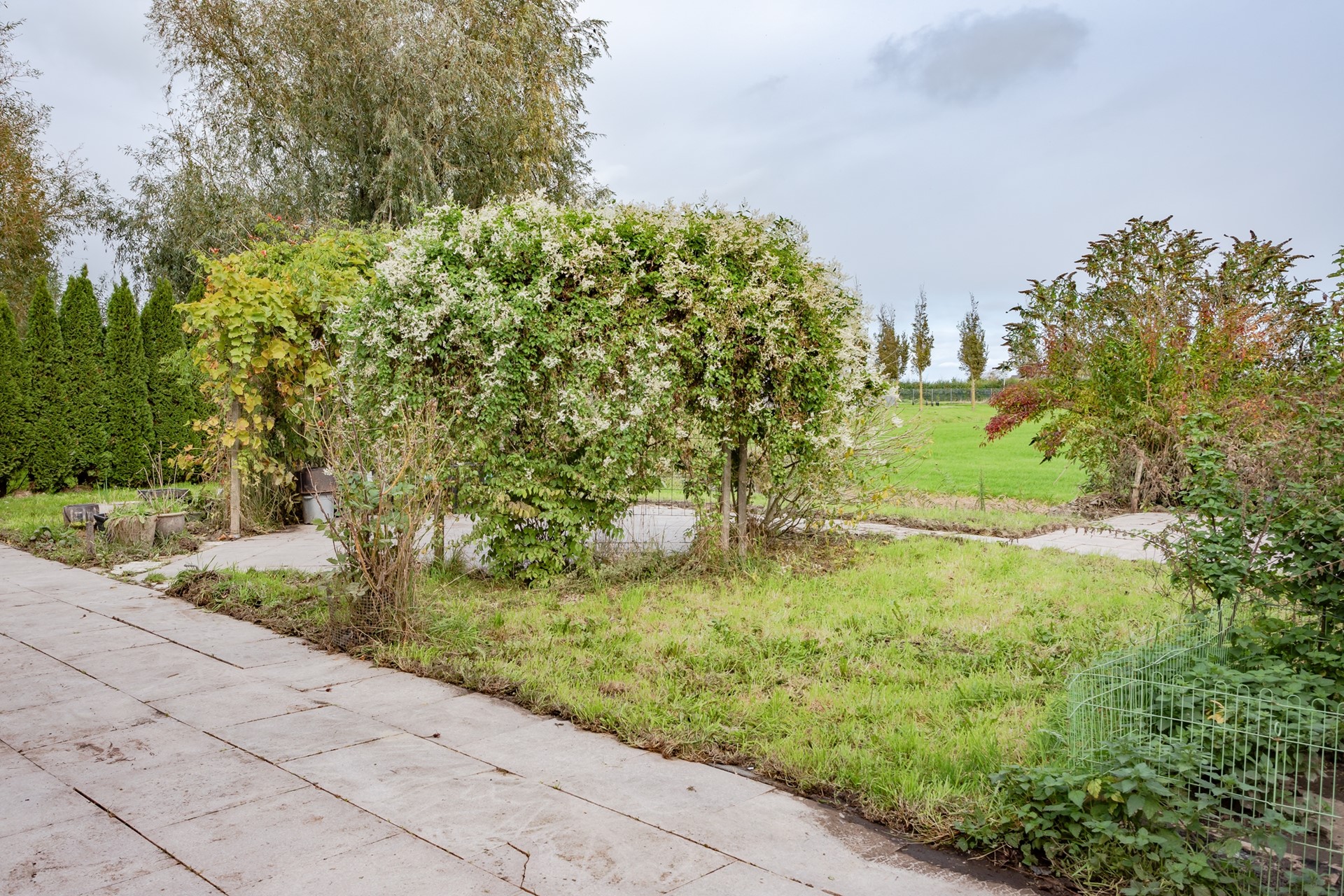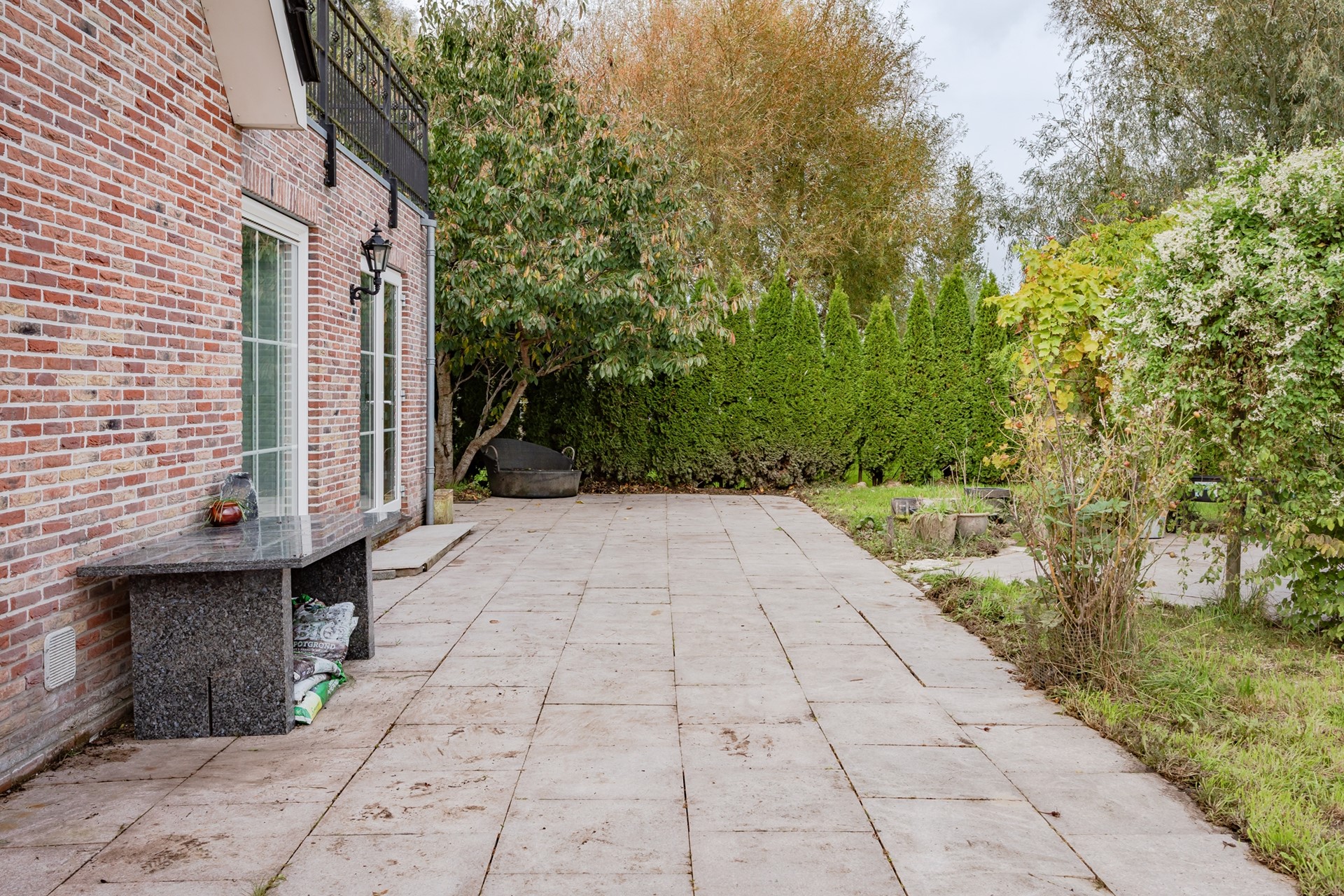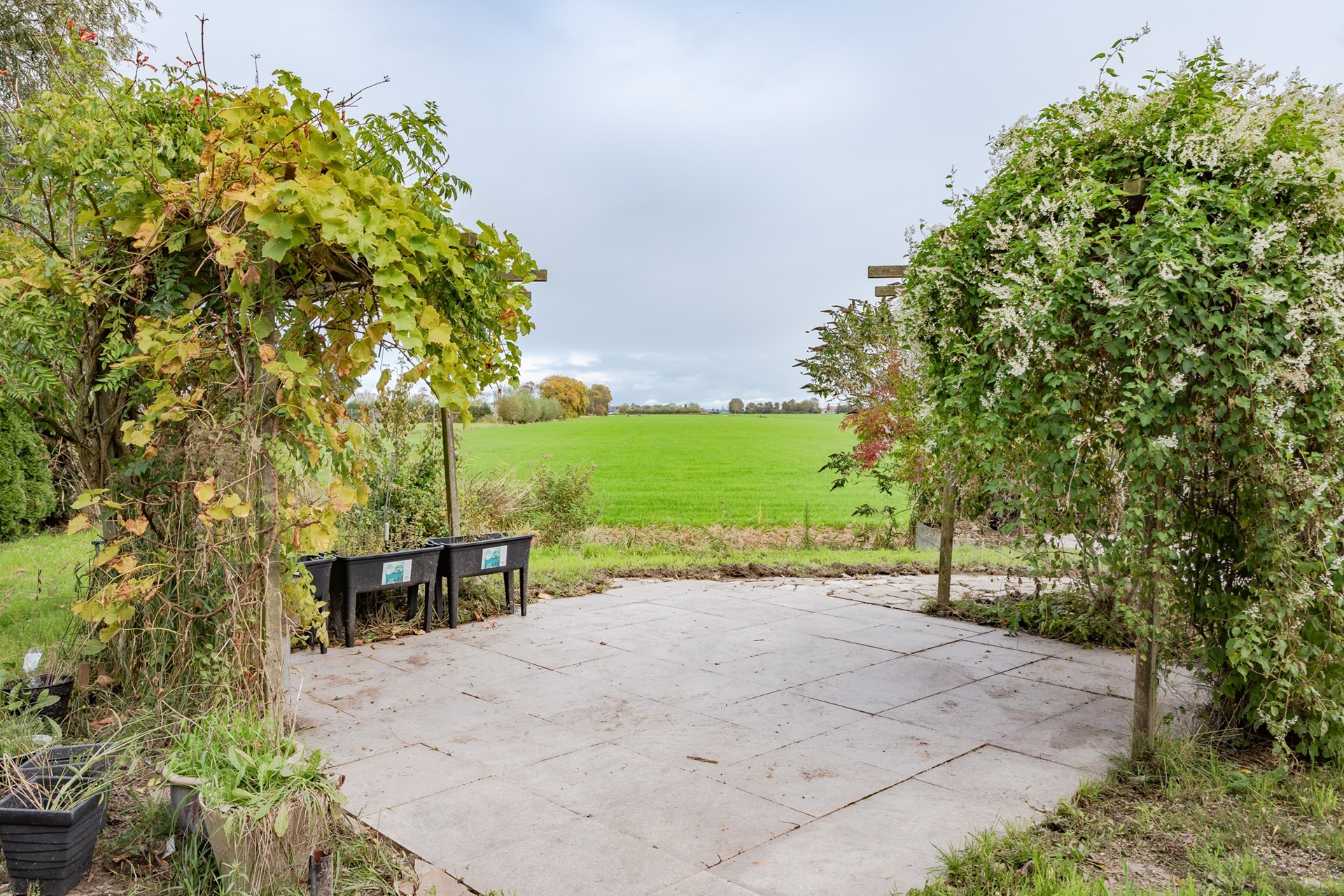 Een voortuin met elektrisch te bedienen hek voor het parkeren van de auto op eigen terrein, ommuurde schutting met sier hekwerk en grotendeels bestraat. Naast de woning staat een halfopen berging voor fietsen en tuinspullen. Rondom de woning is alles bestraat en er zijn nog extra tegels die achterblijven. In de achtertuin is een groot terras met niet alleen een schitterend uitzicht over de weilanden maar ook enorm veel privacy. Er zijn overigens meerdere terrassen, een pergola en een groot waterterras grenzend aan een sloot.