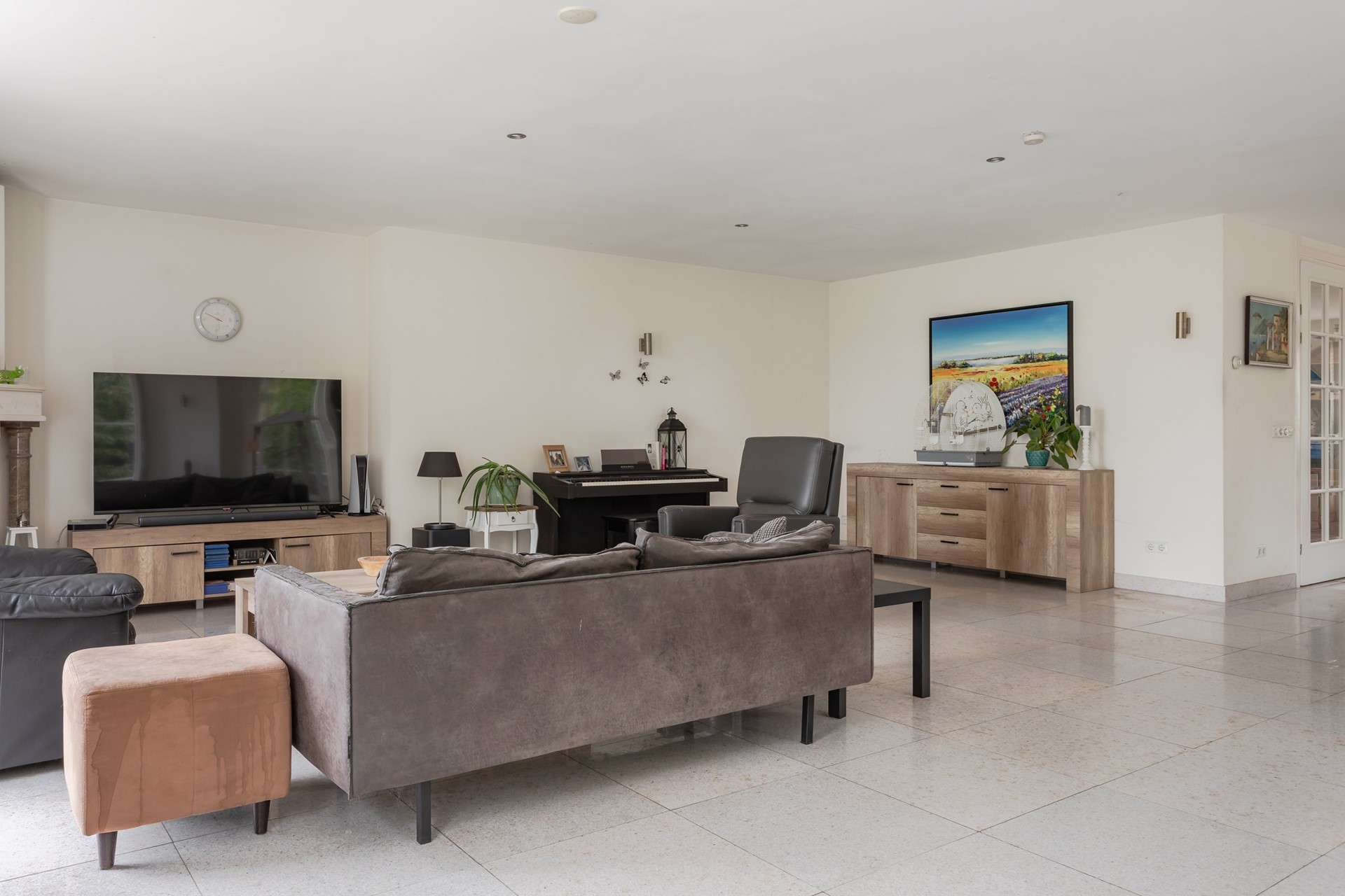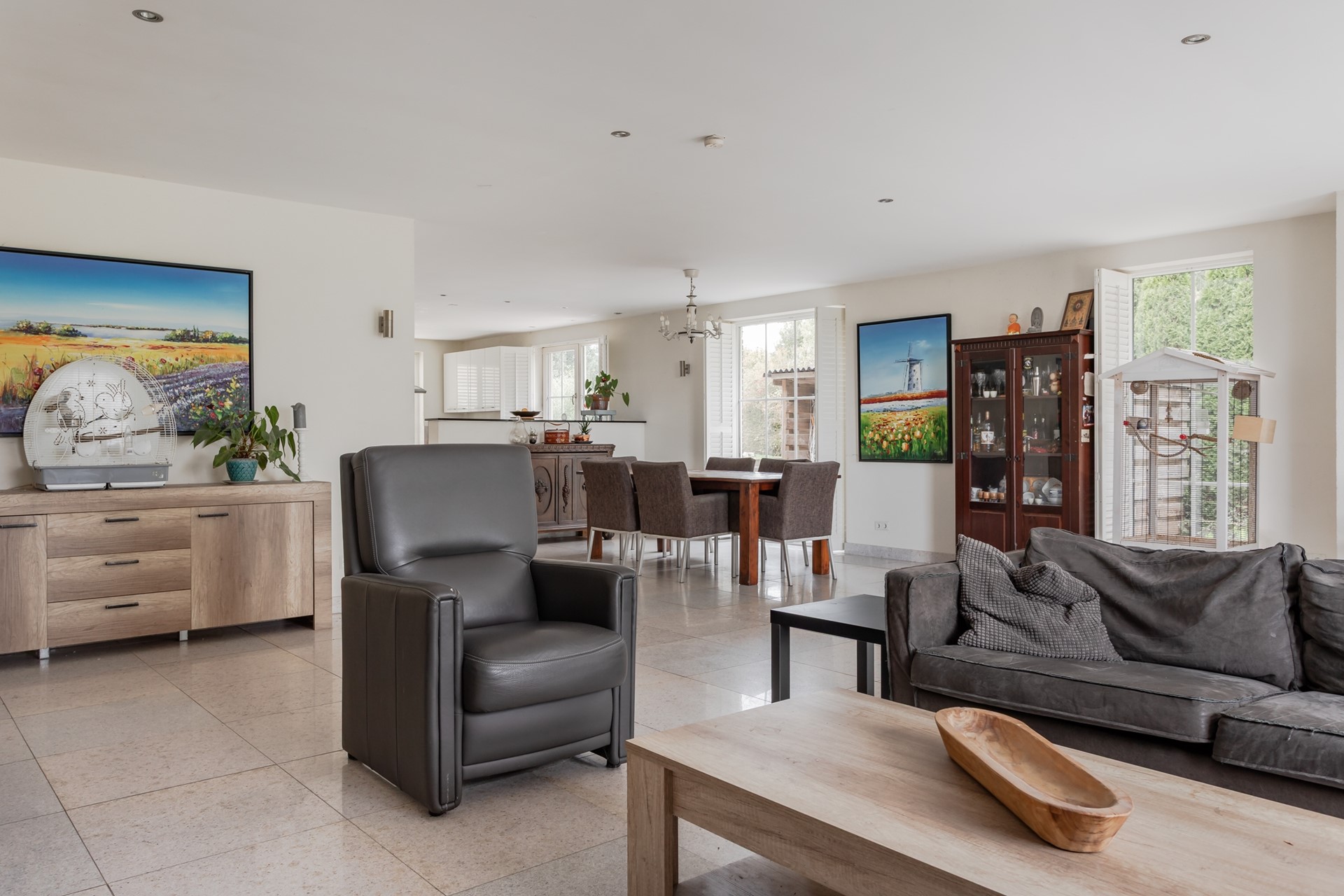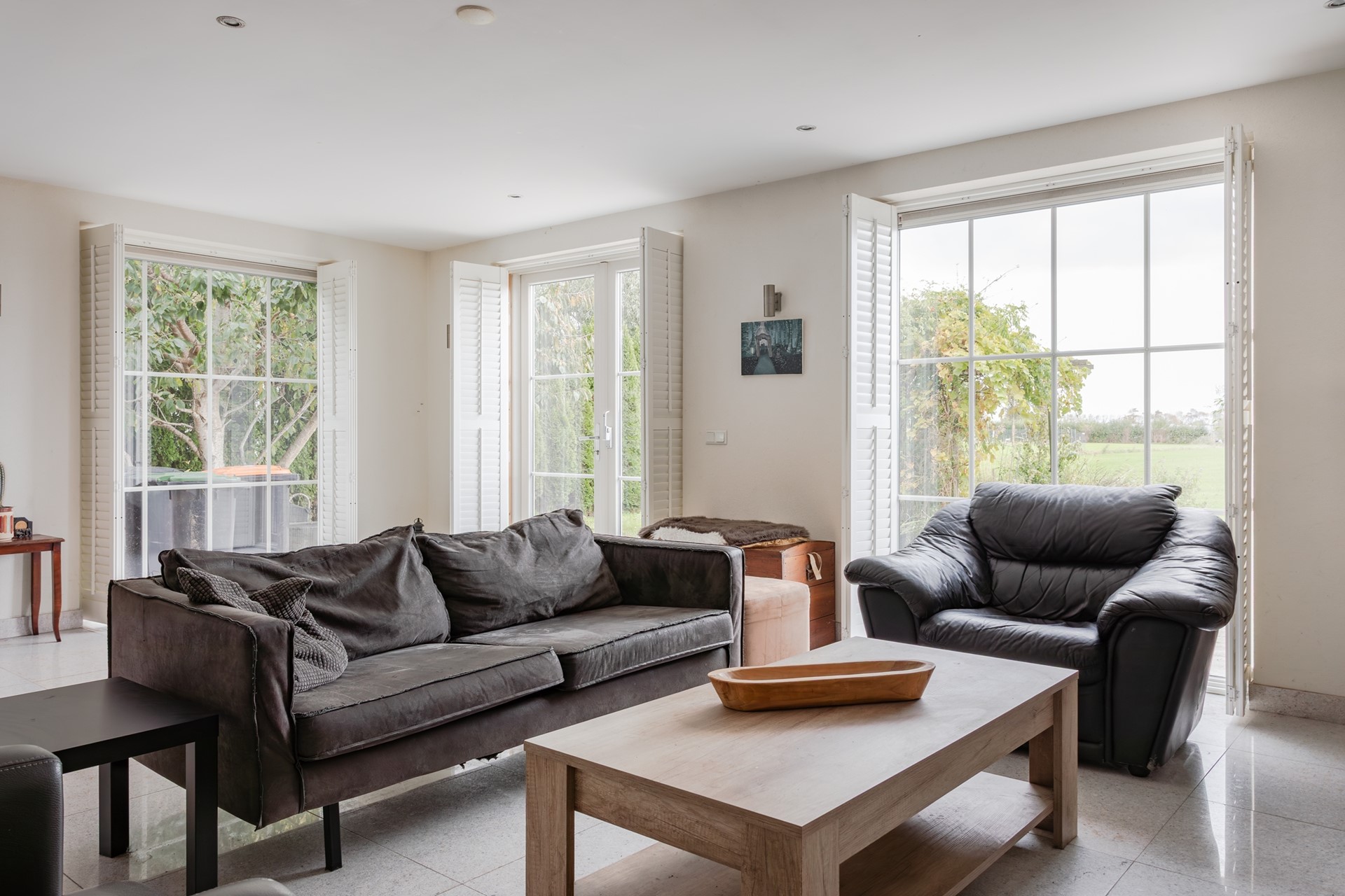 Een royale living met enorm veel lichtinval vanwege de raampartijen tot aan de vloer in kuststof kozijnen en geïntegreerde roeden in het dubbel HR glas met ventilatieroosters en shutters voor alle ramen. Vanuit de living, de eethoek en de keuken heeft u zicht over de weilanden, een uitzicht wat nooit verveeld! Voor de hele koude dagen is er een open haard met een schuifraam dus veilig als u naar bed gaat er het vuur nog niet is gedoofd. De wanden zijn spachtelputz gestuukt en het plafond is strak gestuukt met inbouwspots voor de lokale verlichting. Openslaande deuren, ook met shutters, geven toegang tot de tuin.
