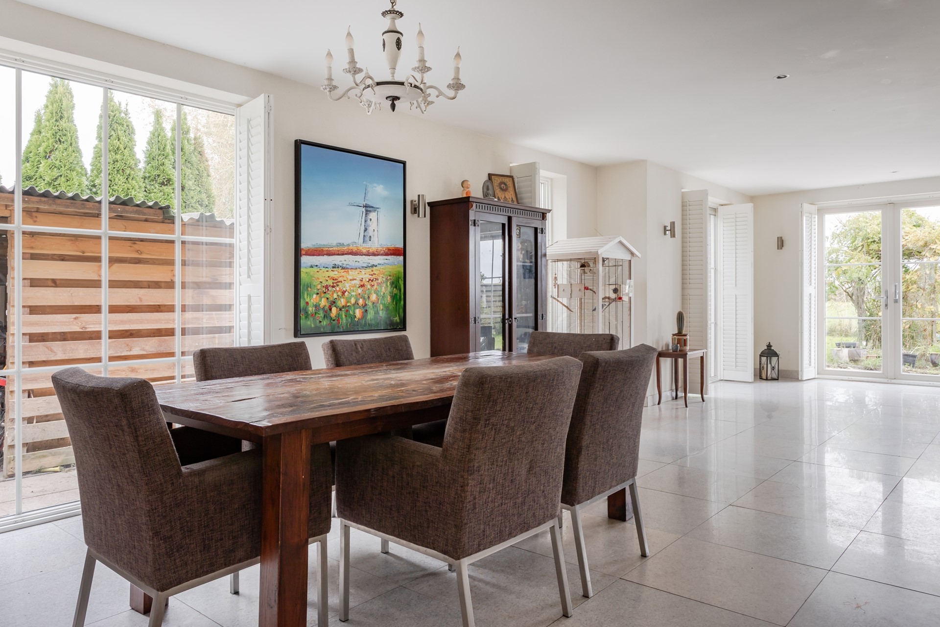 Openslaande deuren met roederamen en facet geslepen glas geven toegang tot de living.