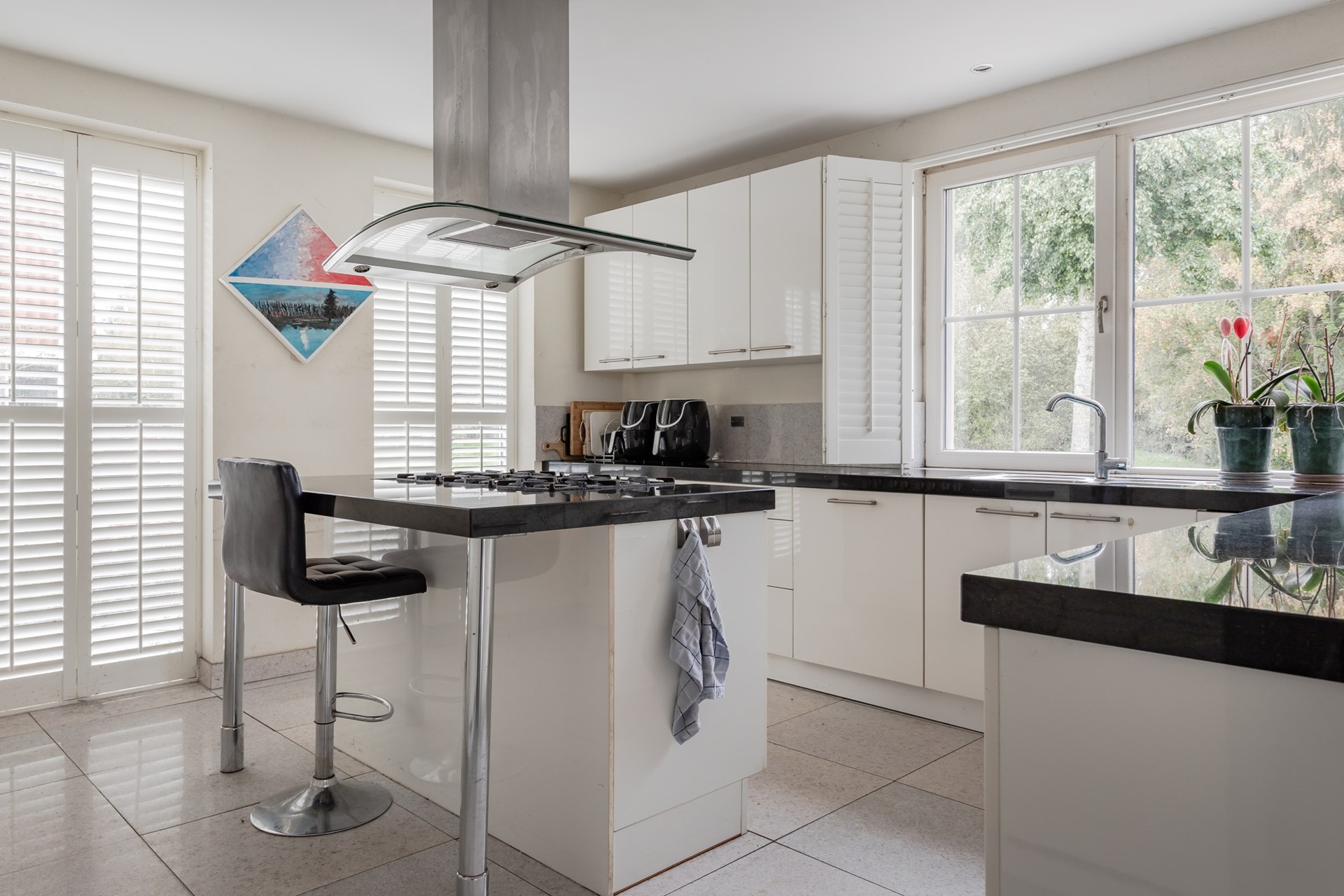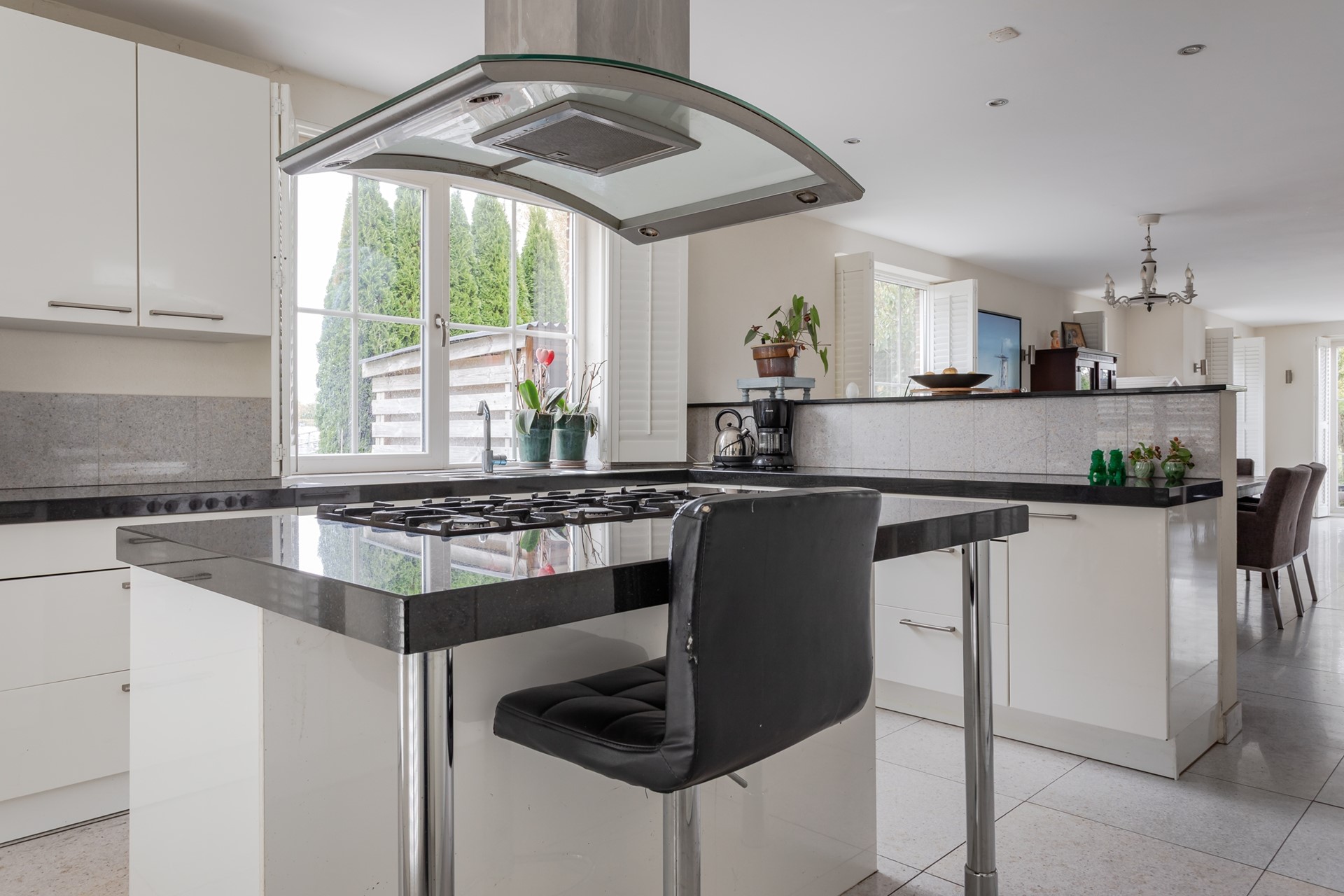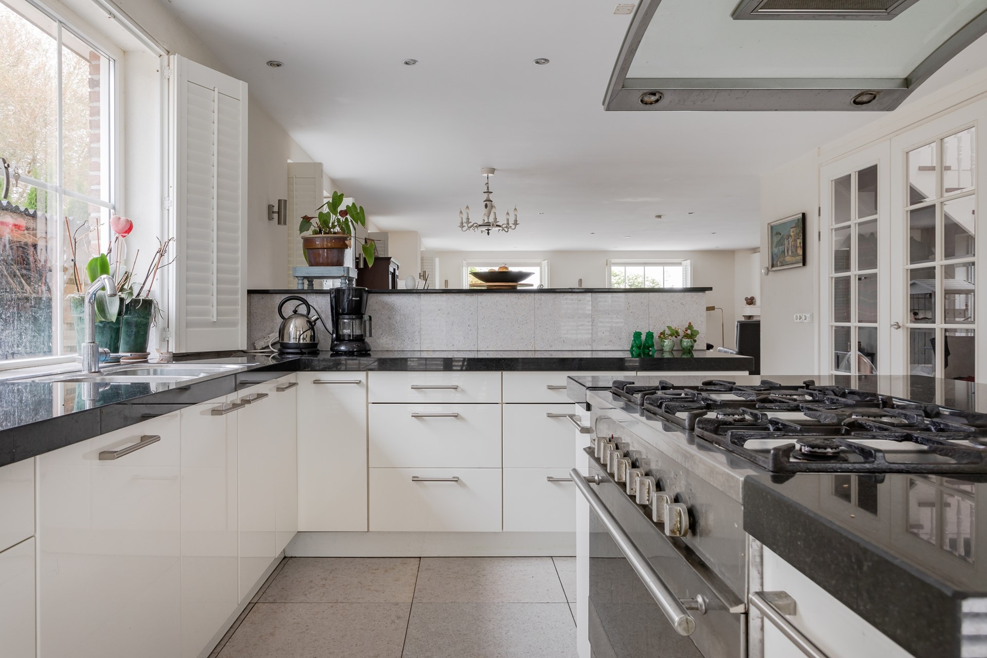 Een halve wand vormt de afscheiding tussen de living en de keuken zodat er direct contact is en natuurlijk het uitzicht over de weilanden! De keuken is in een hoekopstelling geplaatst met een natuurstenen werkblad met dito spatrand, veel laden, kastruimte, carrouselkast, dubbele spoelbak, close-in boiler en de vaatwasser en boven het werkblad een draai/kiepraam. De keuken heeft een kookeiland met 6 pits fornuis en brede oven, afzuigkap met de afvoer naar buiten, kastruimte en een eetbar. Er staat een wandkast met een groot formaat koelkast en dito separate vriezer, de combi-oven/magnetron en ook hier veel kastruimte. Ook bij de keuken zijn de ramen tot aan de vloer met shutters en een paneeldeur geeft toegang tot de bijkeuken.
