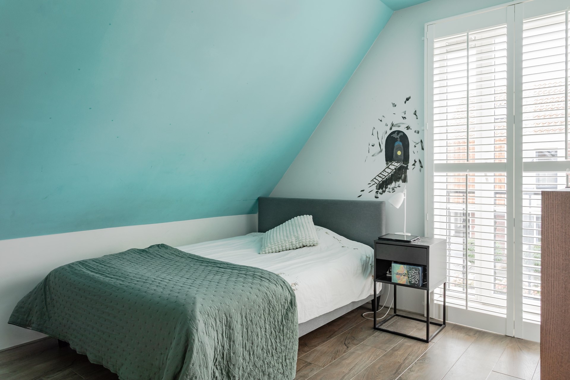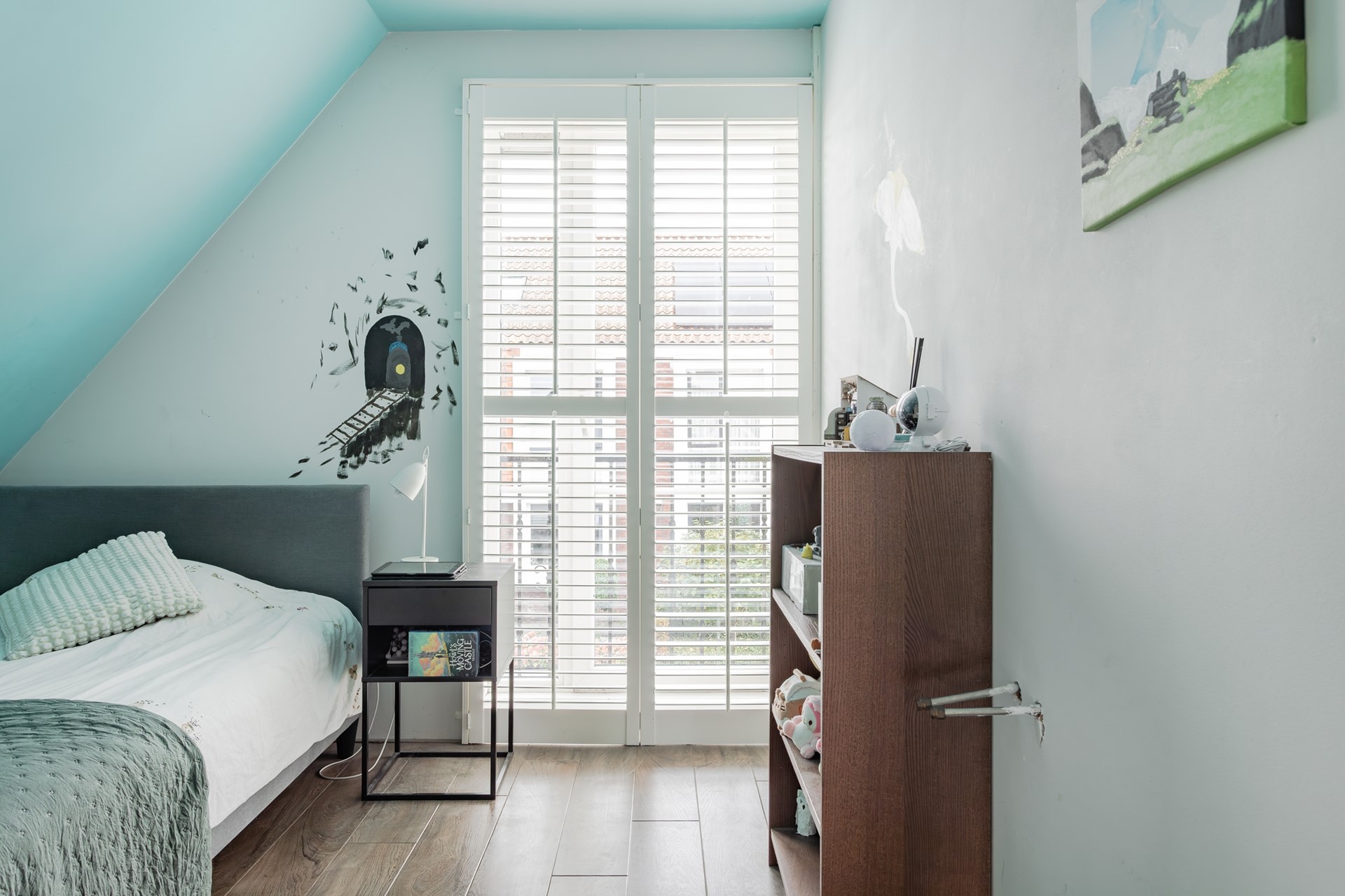 1e Slaapkamer achterzijde – speelse en leuke afmeting kamer met dubbel glas en geïntegreerde roeden in een kunststof kozijn met draai/kiep functie, natuurstenen vensterbank, shutters en uitzicht over de weilanden.