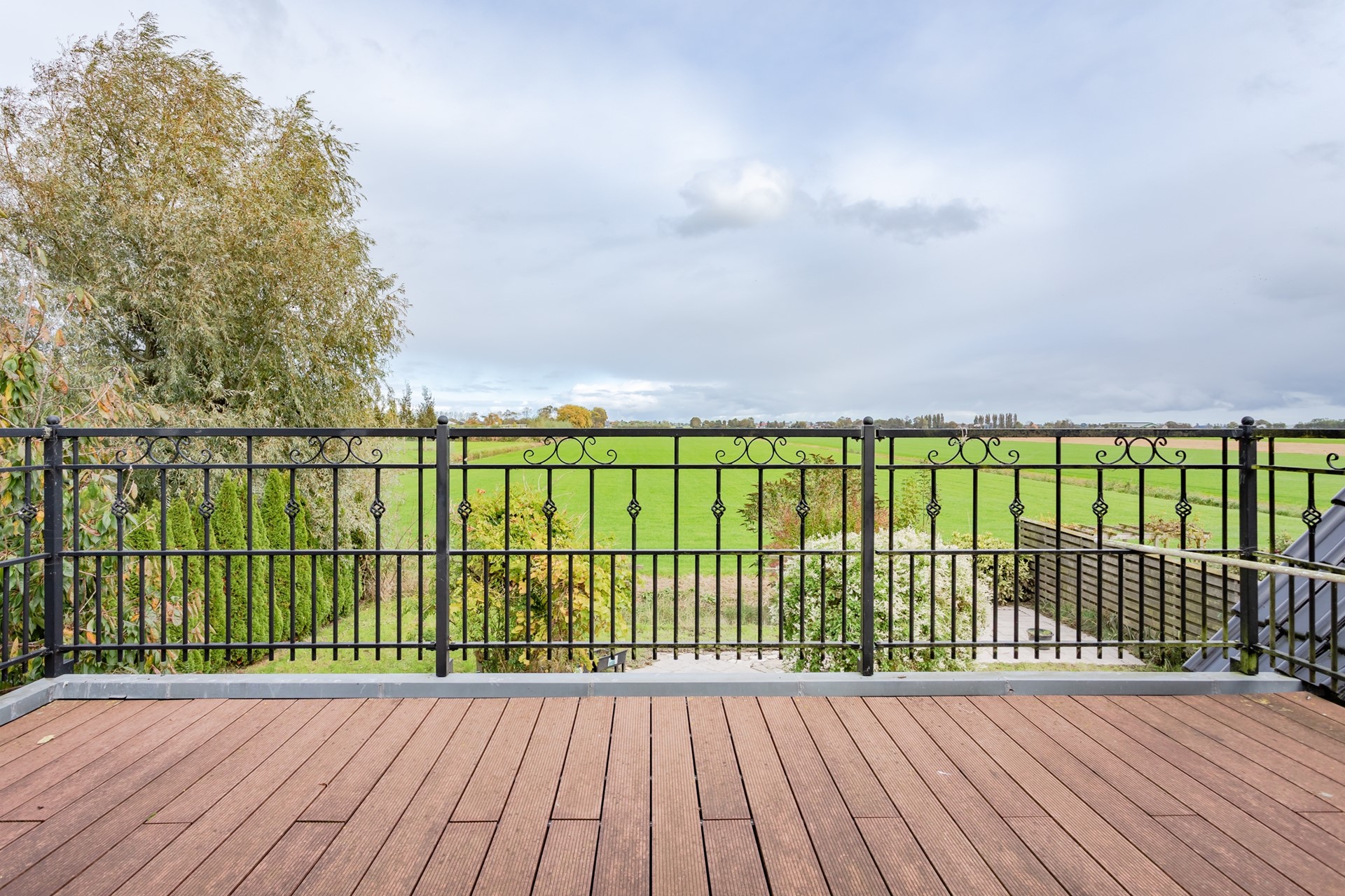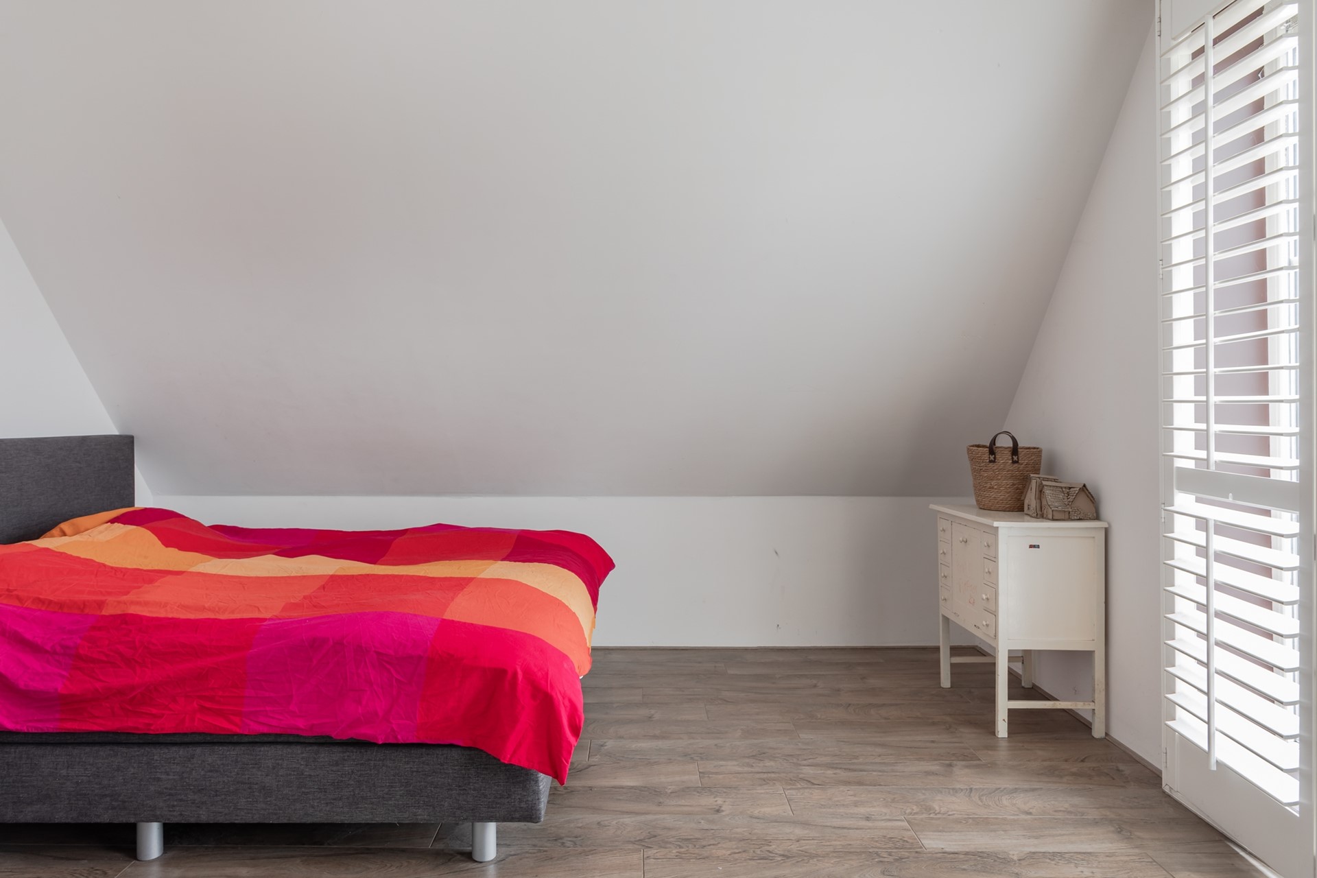 2e Slaapkamer achterzijde – ruime kamer, raam met roede en natuurstenen vensterbank en een deur naar een groot dakterras met een sierhek. Ook hier weer shutters! Het dakterras nodigt wel uit om voor het slapen gaan nog even te genieten van de zomeravond met het vrije uitzicht in alle privacy, een mooie sterrenhemel en een goed glas wijn!