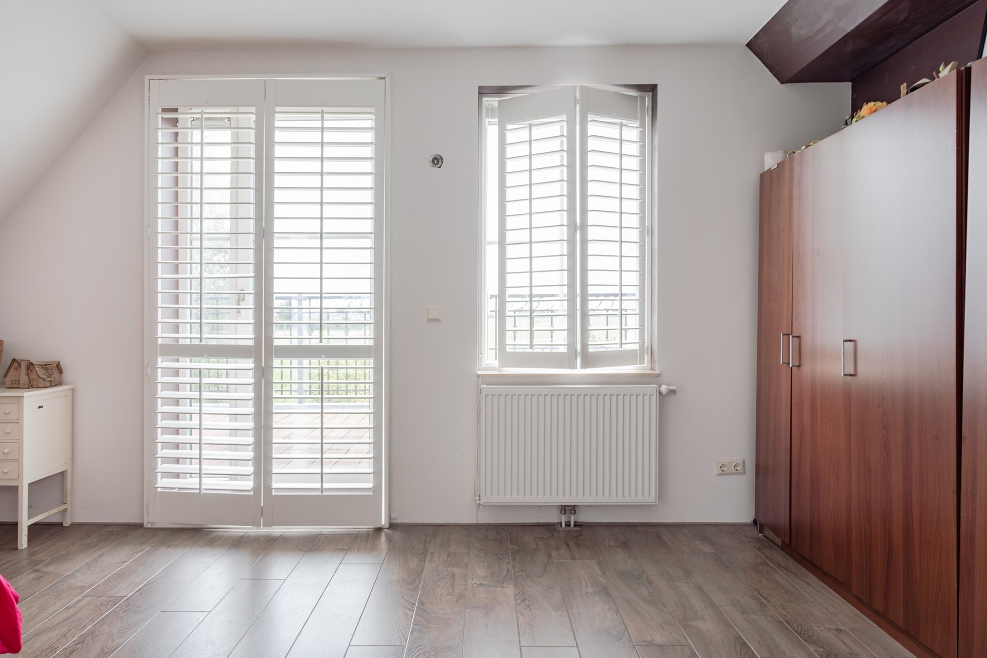 4e en 5e Slaapkamer voorzijde – 2 identieke kamers met een deur, uitgevoerd in kunststof met geïntegreerde roeden in dubbel glas en zijraam met ventilatierooster én shutters met een Frans balkon.