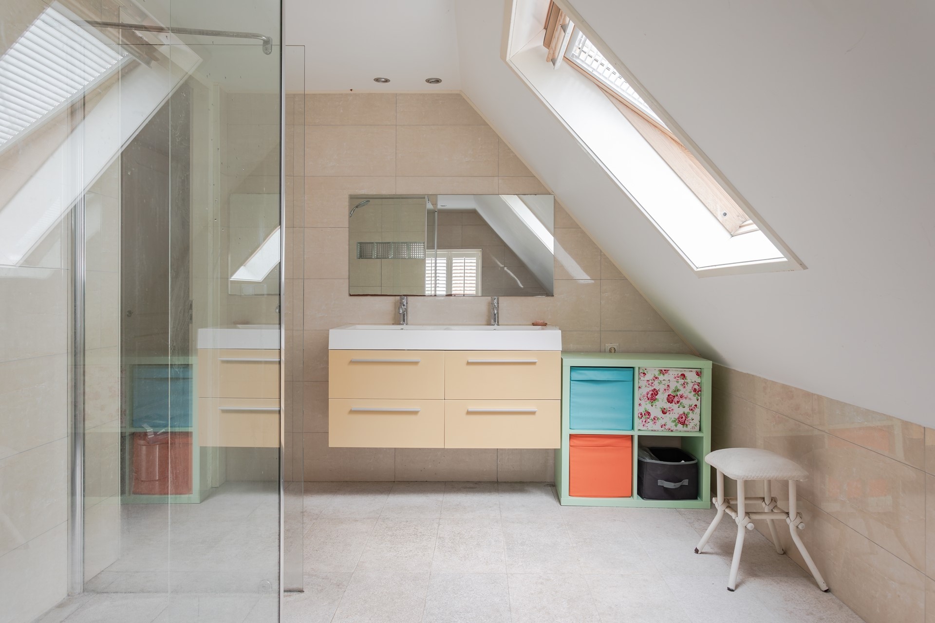 Royale badkamer met lichte vloertegels voorzien van vloerverwarming en de wanden zijn ook licht betegeld. In het gestuukte plafond zijn inbouwspots voor de verlichting. Deze speels ingerichte badkamer voorziet in een wastafelmeubel met 2 wastafels en 4 laden, een hoekbad met thermostaatkraan, handdouche en jacuzzi, 2e wandcloset, designradiator en een inloopdouche met glazen wanden, thermostaatkraan en drainafvoer. Er is een centraal afzuigsysteem en een Velux dakraam kan open voor de natuurlijke ventilatie. Aan de straatzijde is ook nog een vast raam met shutters.