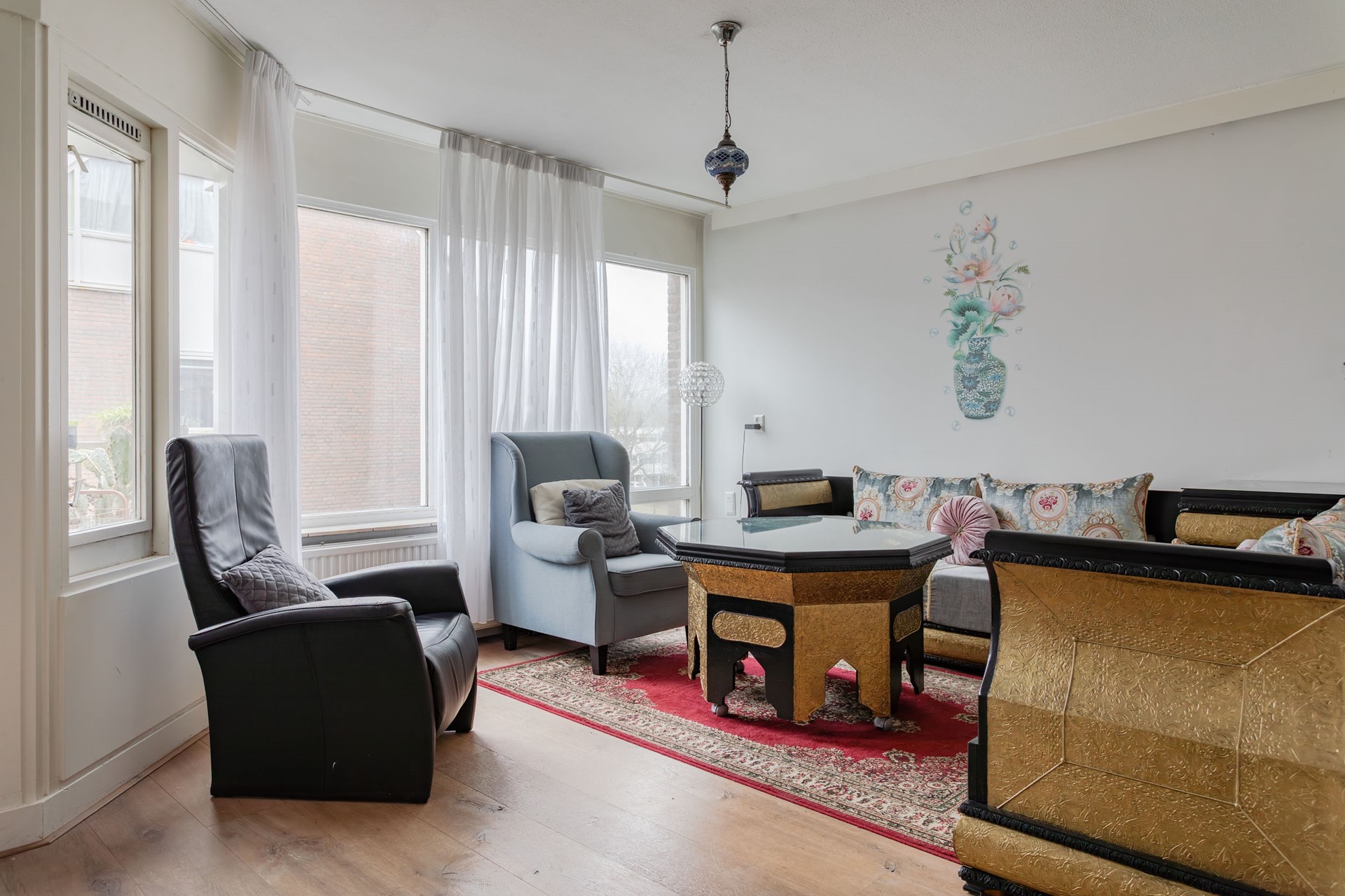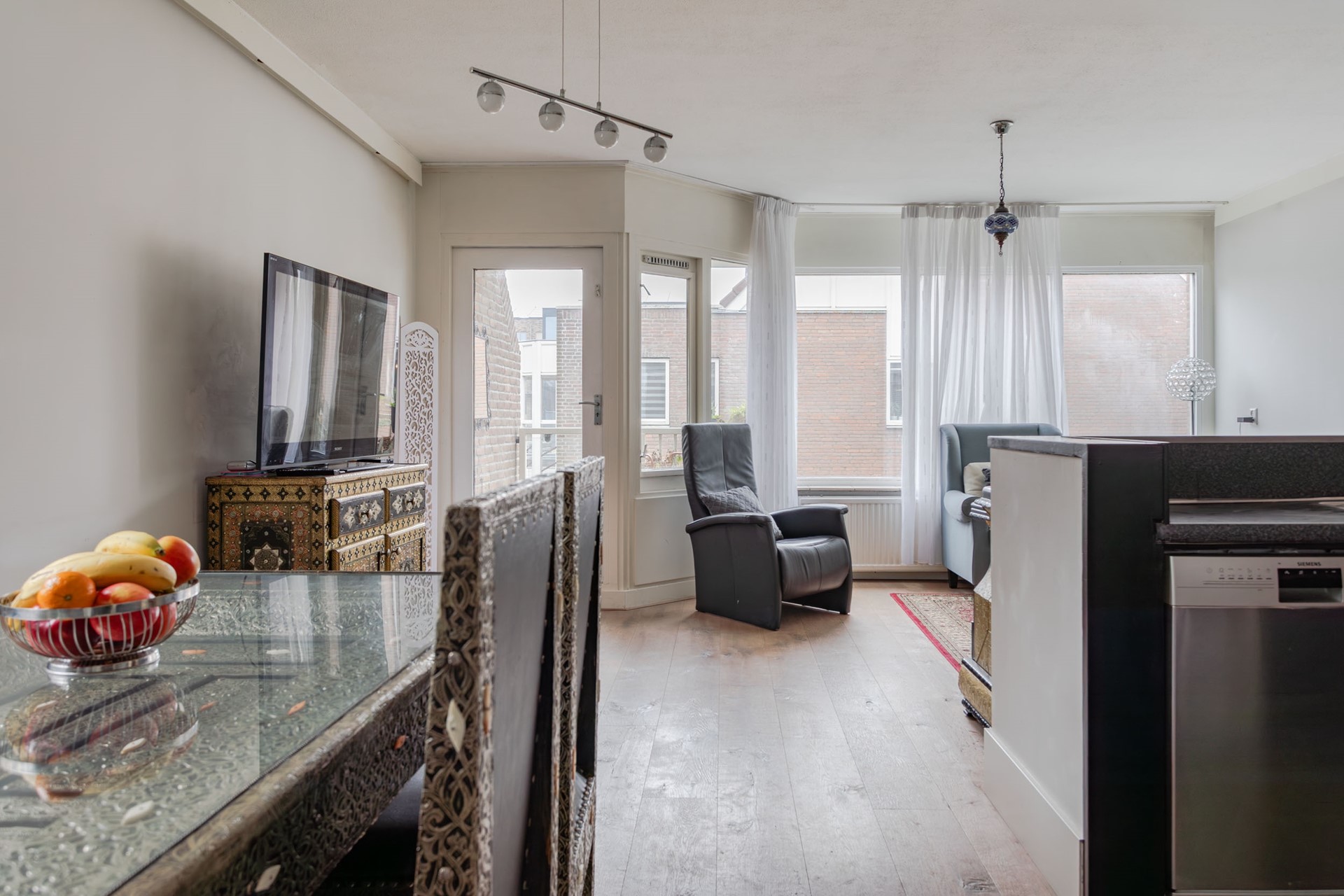 Fijne en lichte living, mede vanwege het zijraam bij de eethoek. De houten vloer is vanuit de hal doorgelegd en er zijn hoge plinten geplaatst. Alle wanden zijn strak gestuukt en bij de zithoek kan je leuk wegkijken waar een raam open kan en de deur geeft toegang tot het overdekte balkonnetje dus volop mogelijkheden om te ventileren, zelfs als het regent.