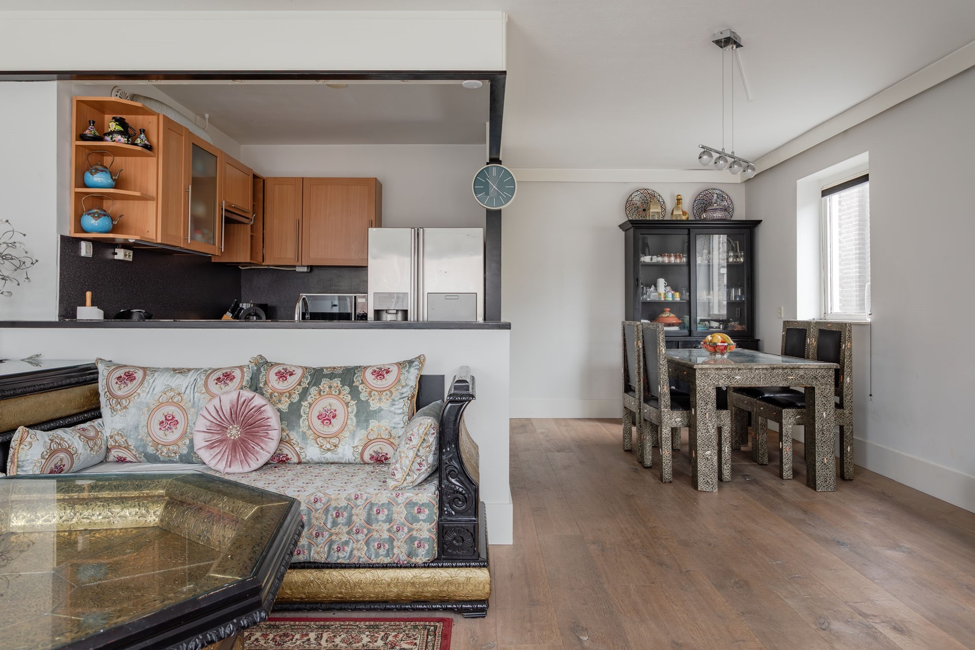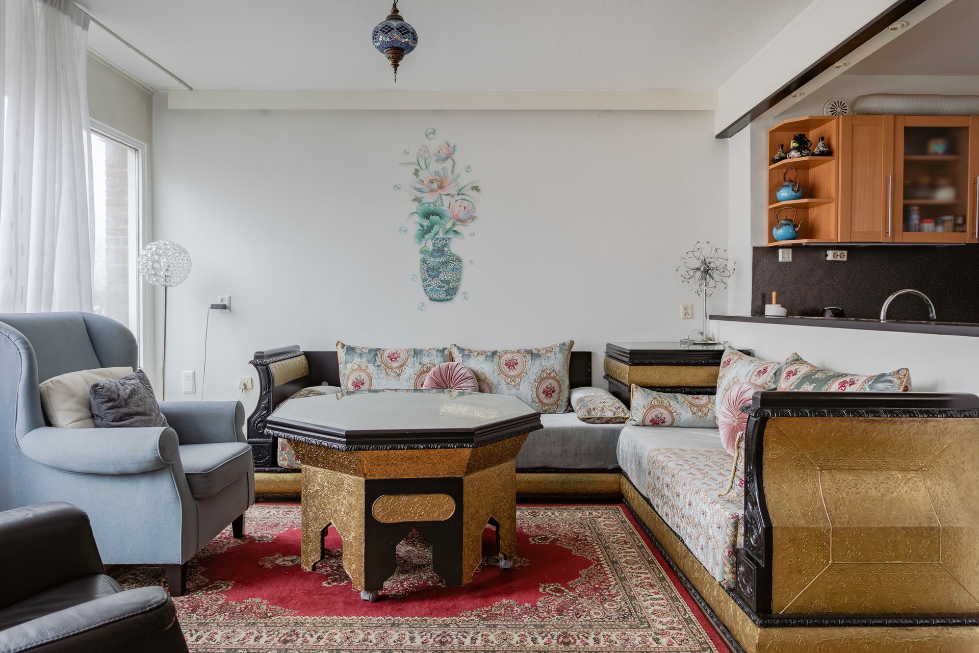 Vanwege het afscheidingswandje bij de keuken is er direct contact met de overige bewoners in de zithoek en bij de eethoek.