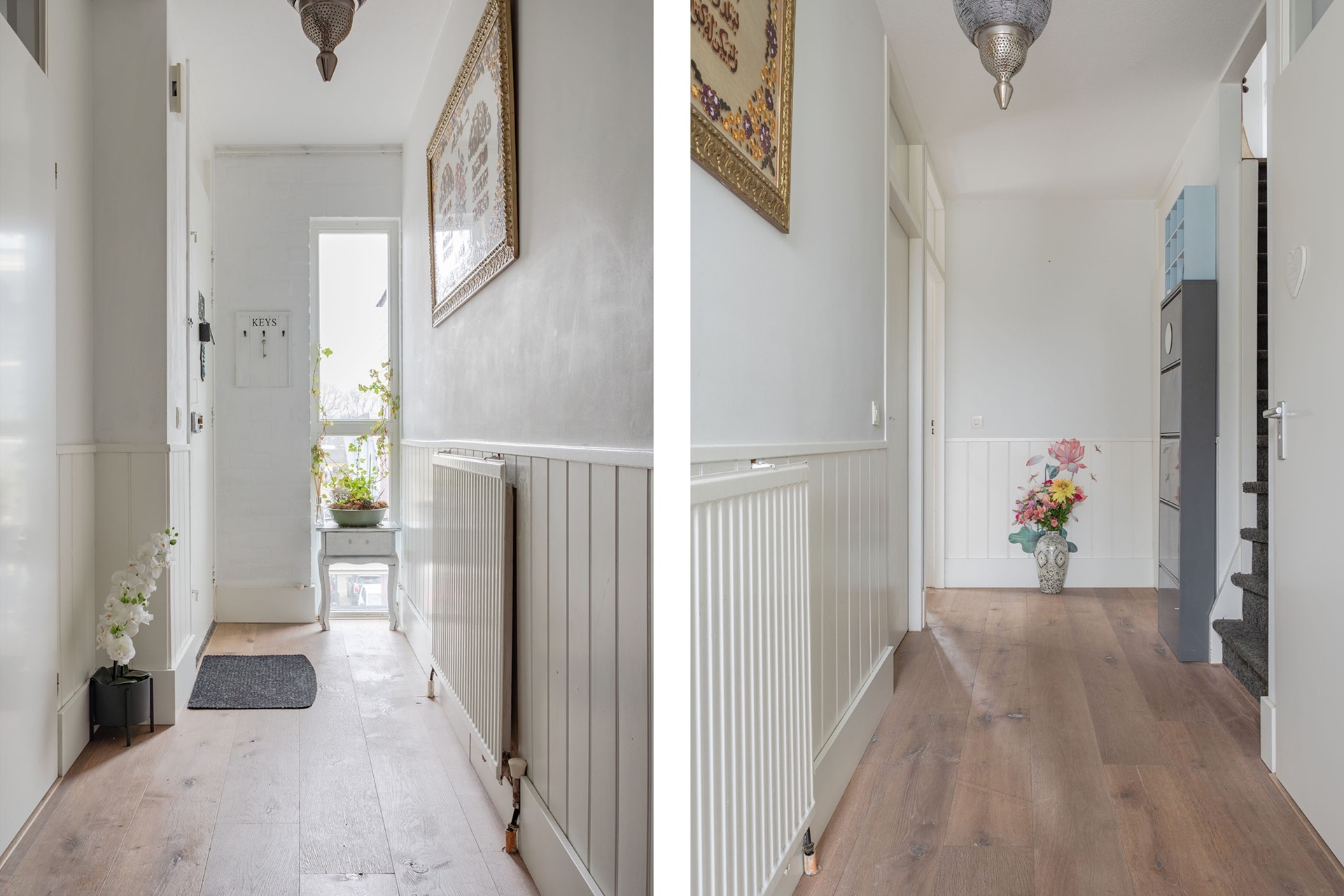 Trapportaal wat met nog een bewoner wordt gebruikt en toegang tot het appartement met achter de voordeur een hal met fijn lichtinval vanwege de raampartij met dubbel glas. De hal heeft sfeervolle lambrisering, hoge plinten, een houten vloer, radiator, de trapopgang, een trapkast met wasmachineaansluiting en het toilet met speelse wandtegels, een lichte vloer, staand toilet en een fonteintje.