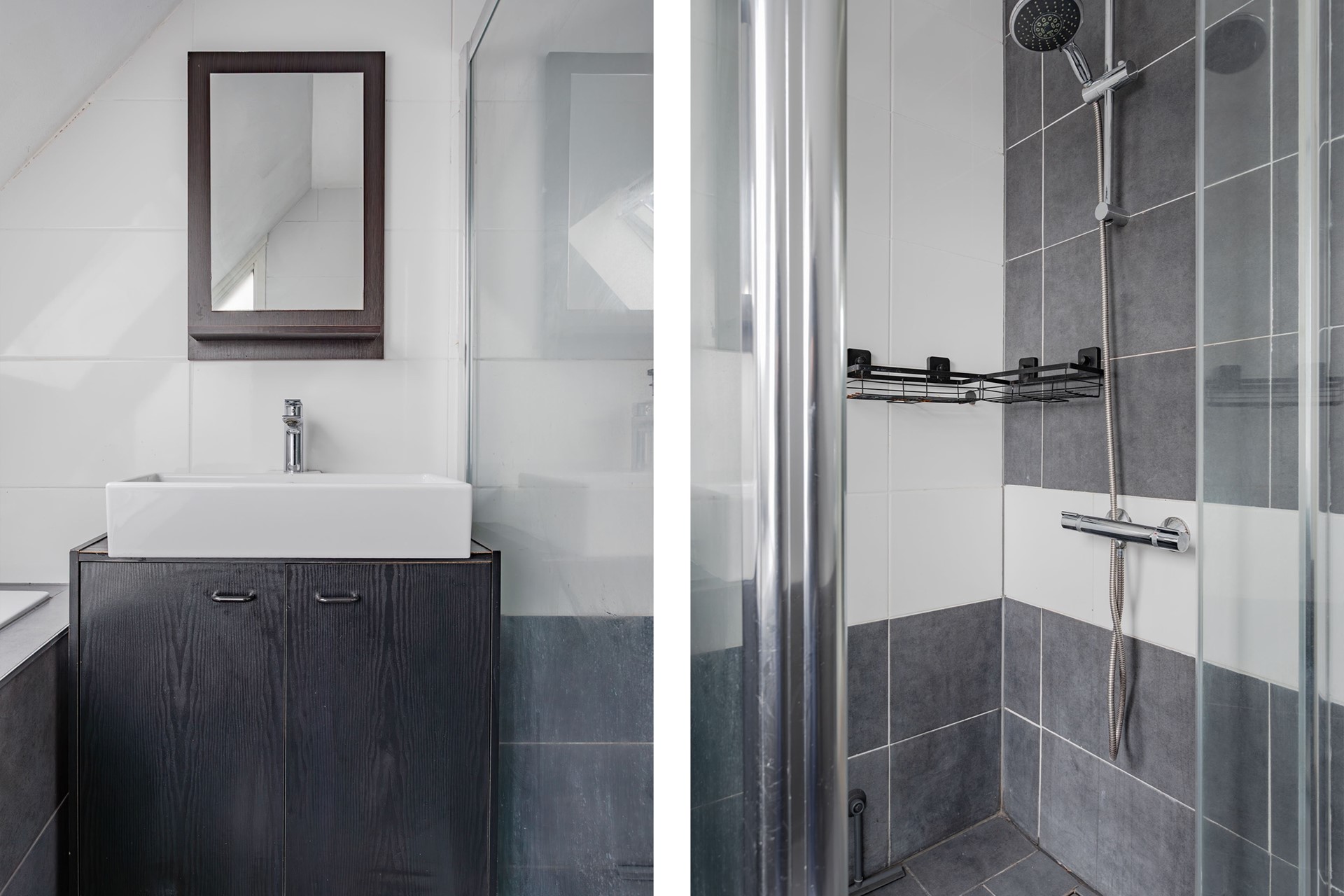 Een designdeur met melkglas geeft toegang tot de badkamer met modern betegelde wanden en dito vloer. Er is een groot bad met plateau geplaatst waar je via het brede Velux raam naar de sterren kan kijken en er is ook nog een speels raam richting het naastgelegen balkon. Vervolgens een wastafelmeubel met porseleinen wasbak en 2 kastjes, separate douchehoek met glazen deur en zijwand en een thermostaatkraan. De schuine wanden zijn gestuukt en er zit een radiatoraansluiting.