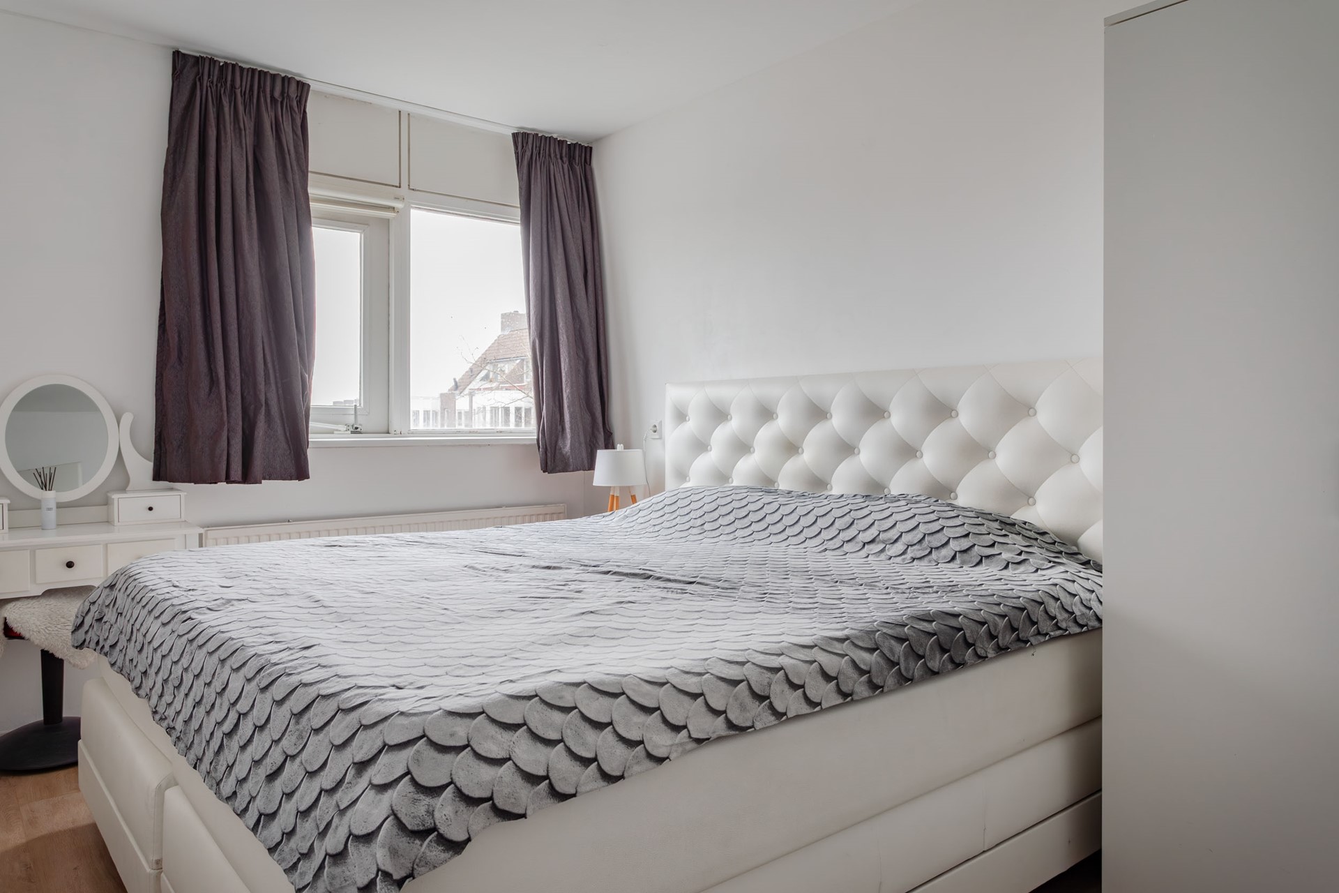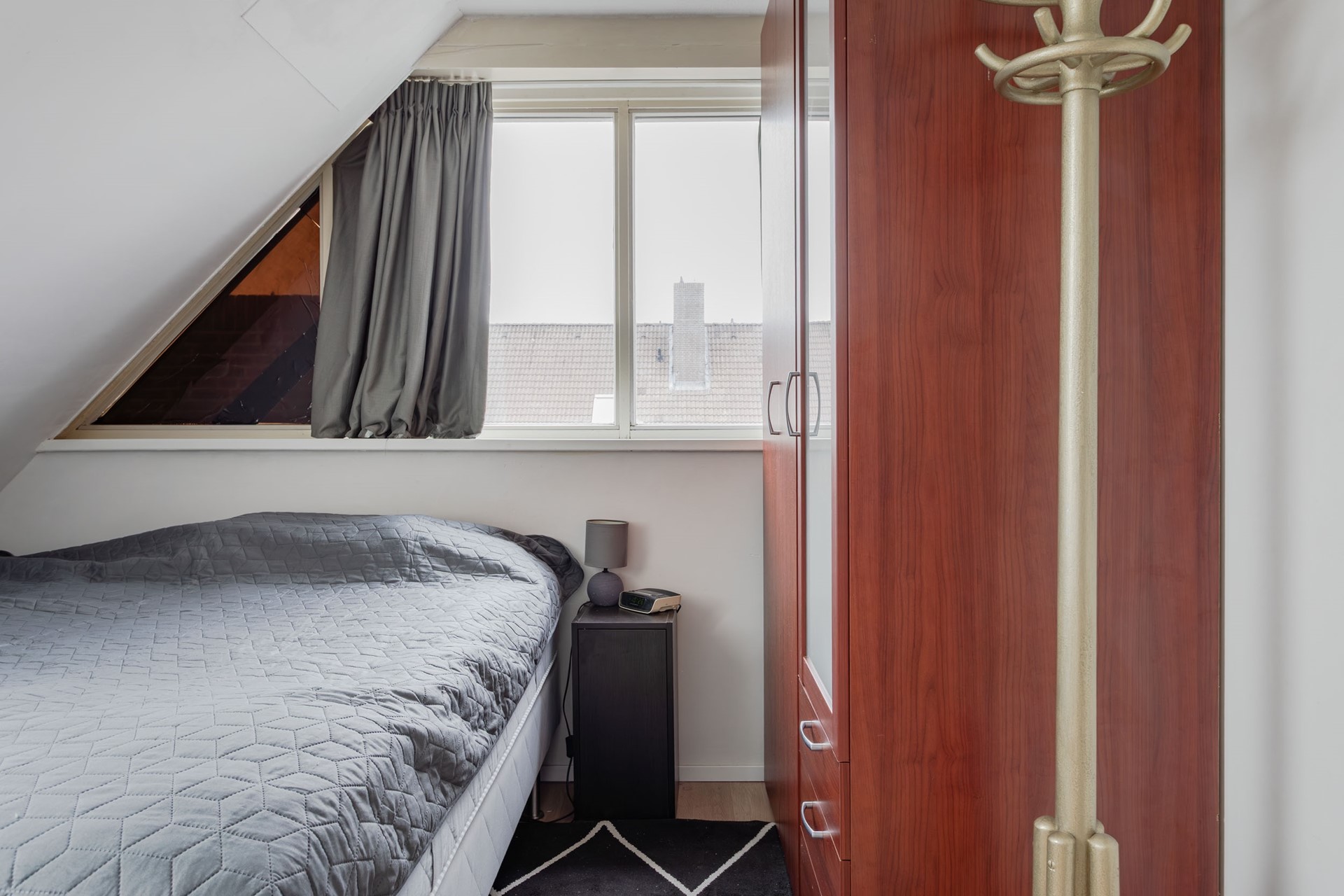 2e Slaapkamer – ruime kamer met gestuukte wanden, een brede raampartij met dubbel glas en nog een Velux dakraam zodat er goed geventileerd kan worden.
