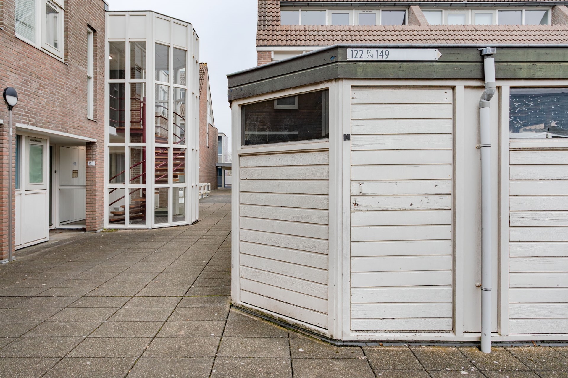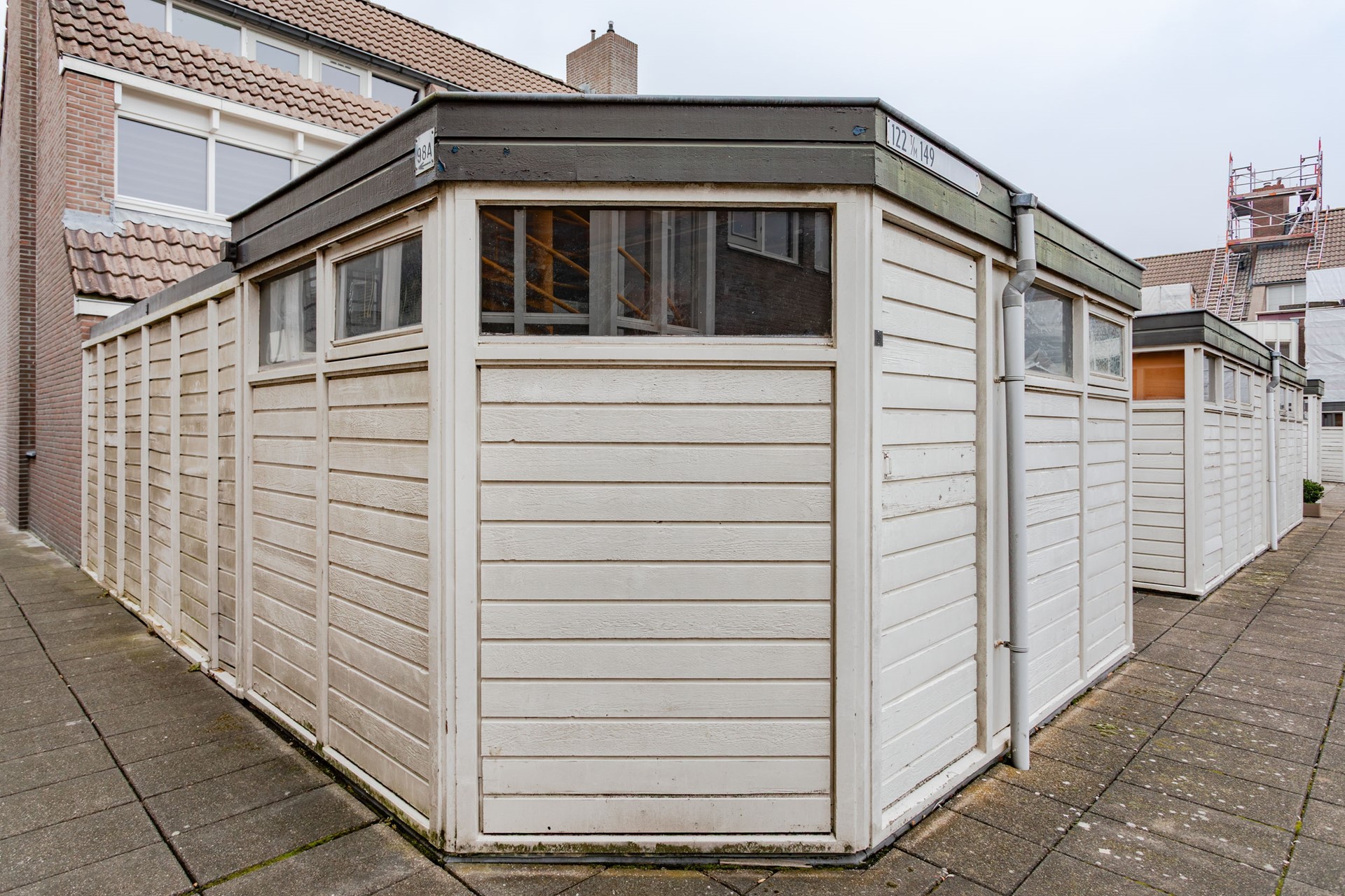 Aan het grote plein ligt een eigen houten en ruime berging met lichtinval door de bovenramen en er kan ook een raam open zodat er geventileerd kan worden.