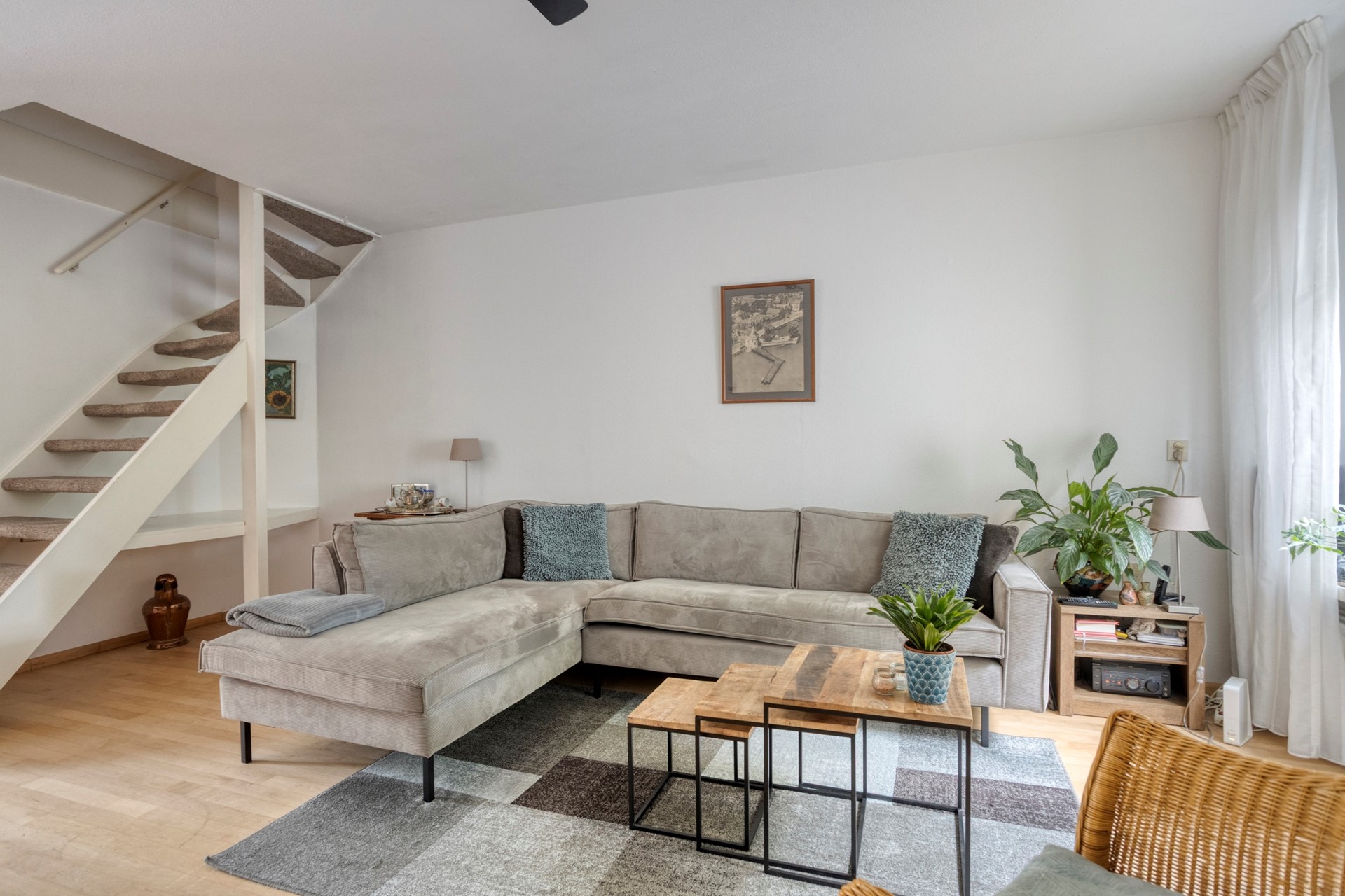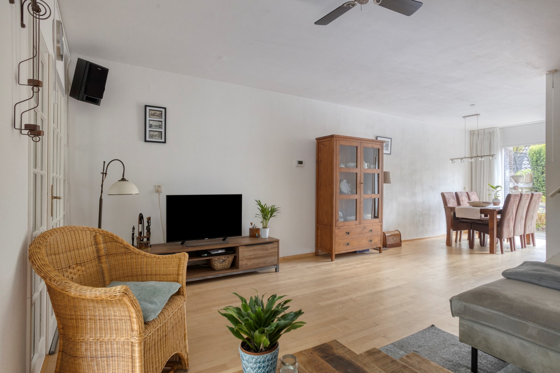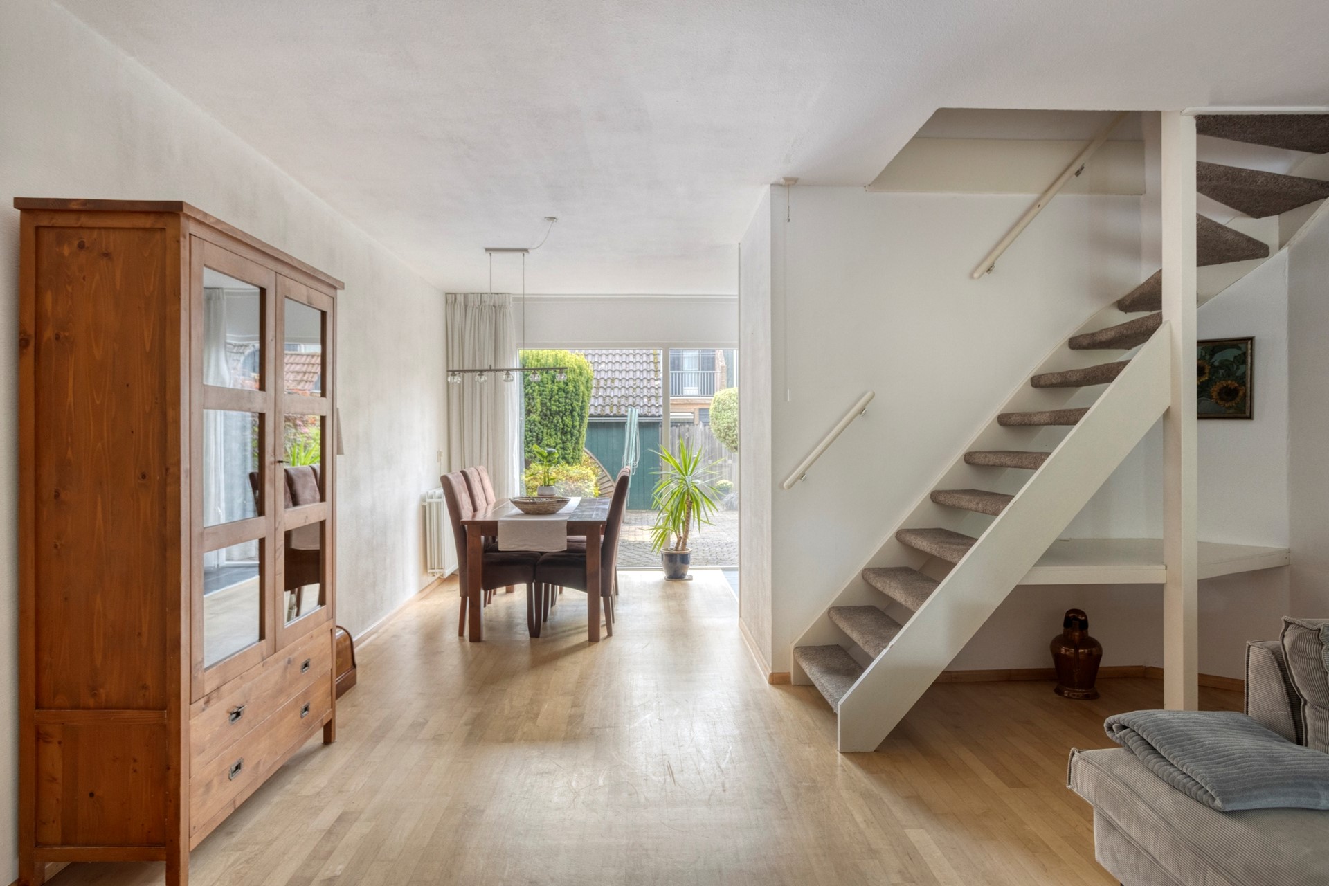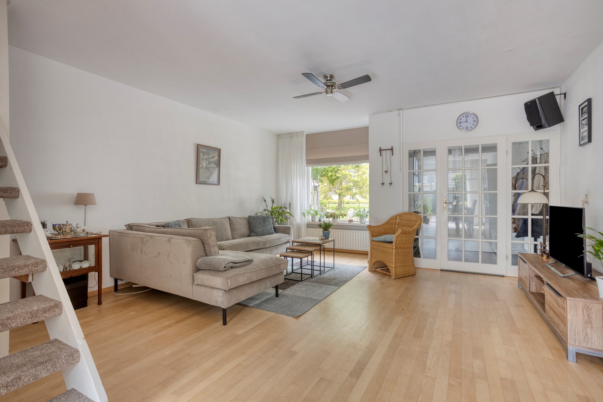 Gezellige living met massief houten parketvloer en de wanden zijn behangen. Vanaf uw bank geeft een groot raam met ventilatierooster zicht op de speelveldjes achter de sloot en heeft u vrij uitzicht. Onder de open trap is een plateau geplaatst voor de computer of een speelhoekje voor de kleintjes.