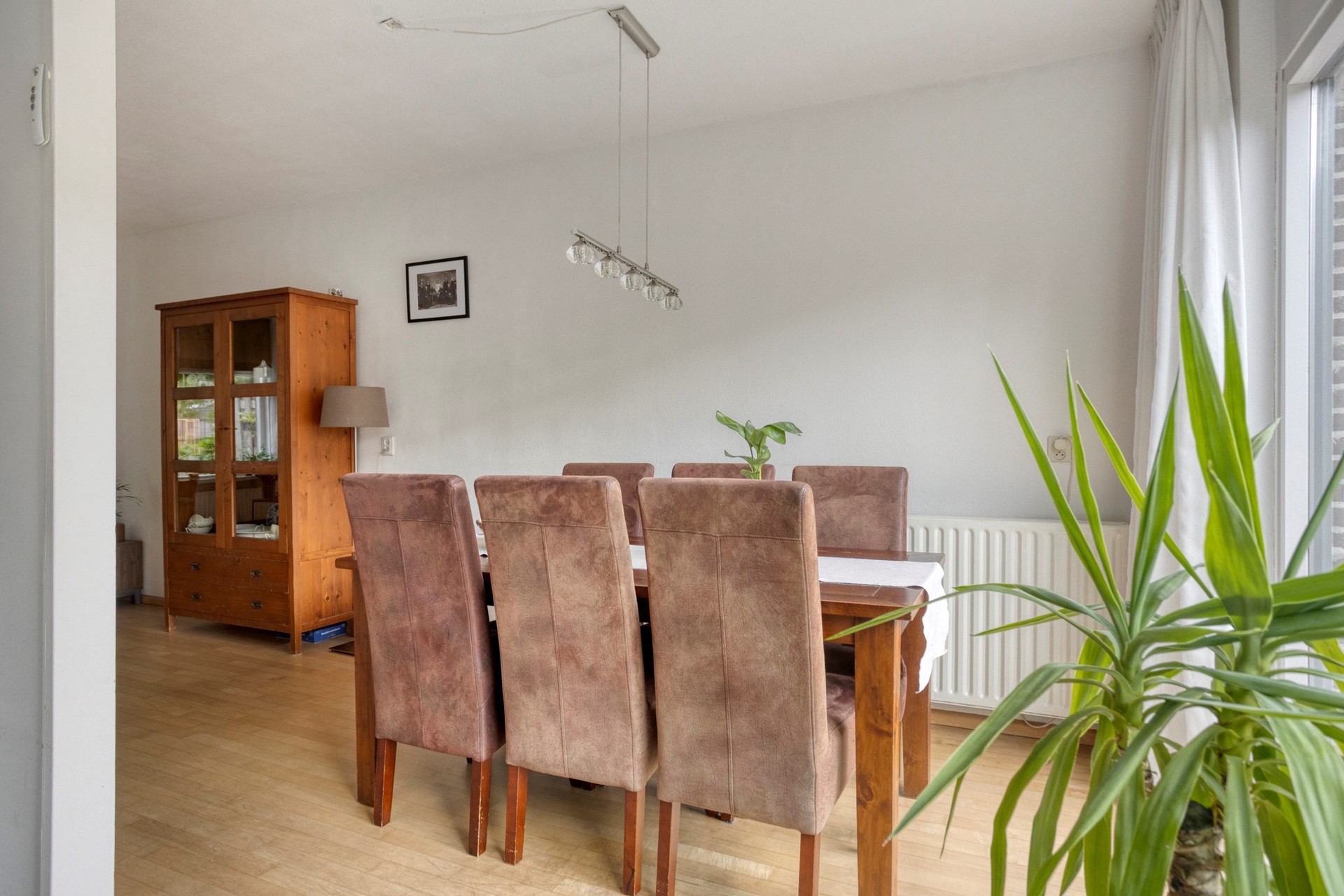 Bij de eethoek geven grote raampartijen tot aan de vloer zicht op de tuin dus heel fijn lichtinval. En als het heel erg zonnig is kan het elektrisch te bedienen zonnescherm worden uitgezet.