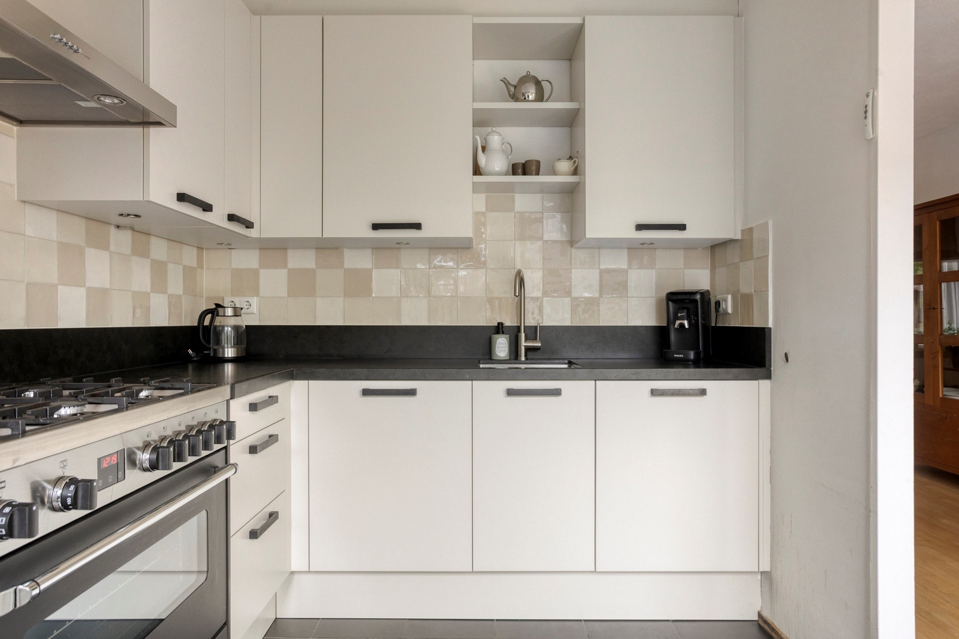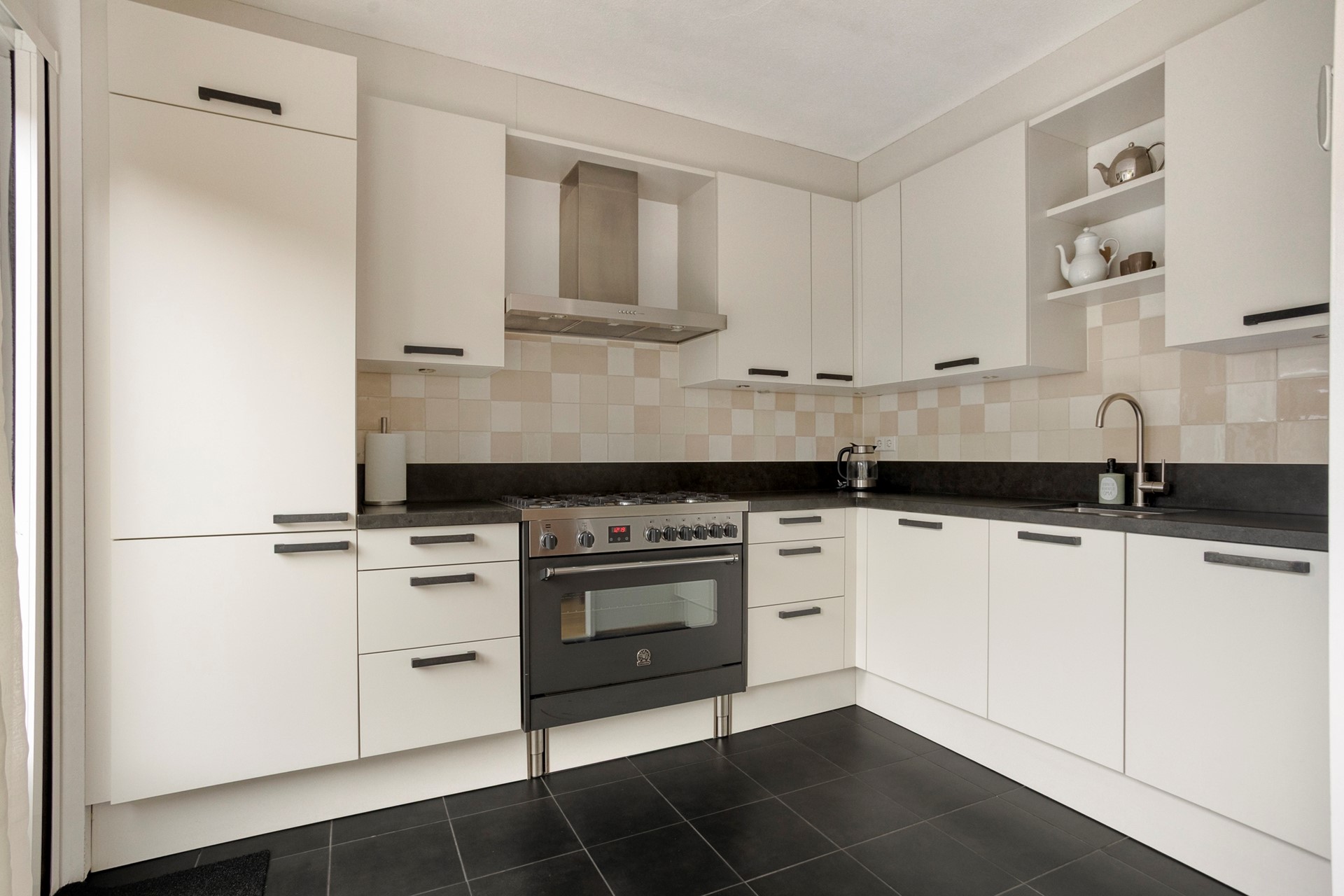 Moderne keuken in lichte kleurstelling met een hoog granieten werkblad voorzien van een waterkering. Op de vloer liggen donkere vloertegels en achter het werkblad zijn lichte wandtegels geplaatst. De keuken voorziet in veel laden, een Le Mans uitschuifsysteem, bovenkastjes met bladverlichting en diverse inbouwapparatuur, zoals: een koel/vriescombinatie, fornuis met 6 gaspitten en een brede oven, rvs-afzuigkap met de afvoer naar buiten en een vaatwasser.