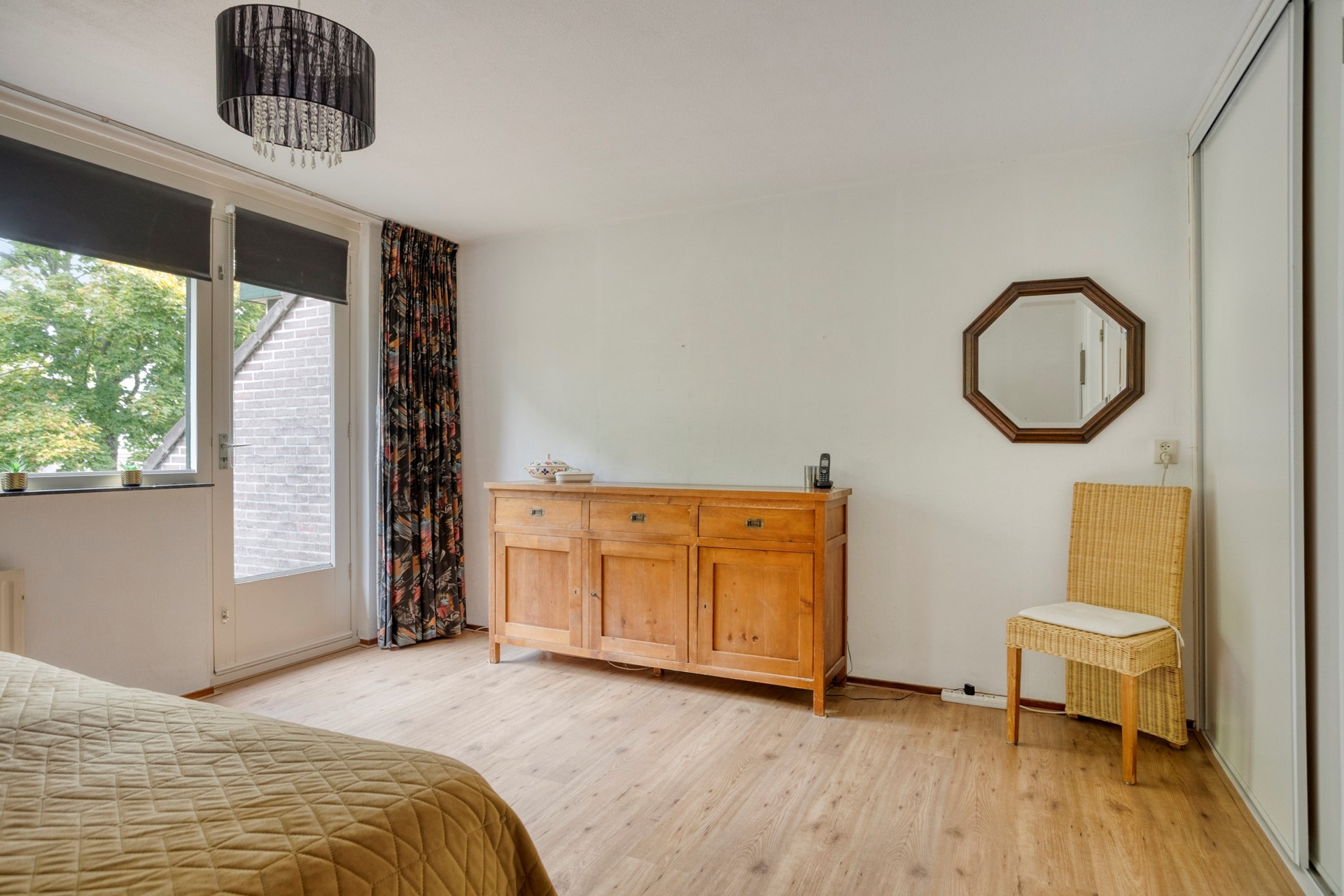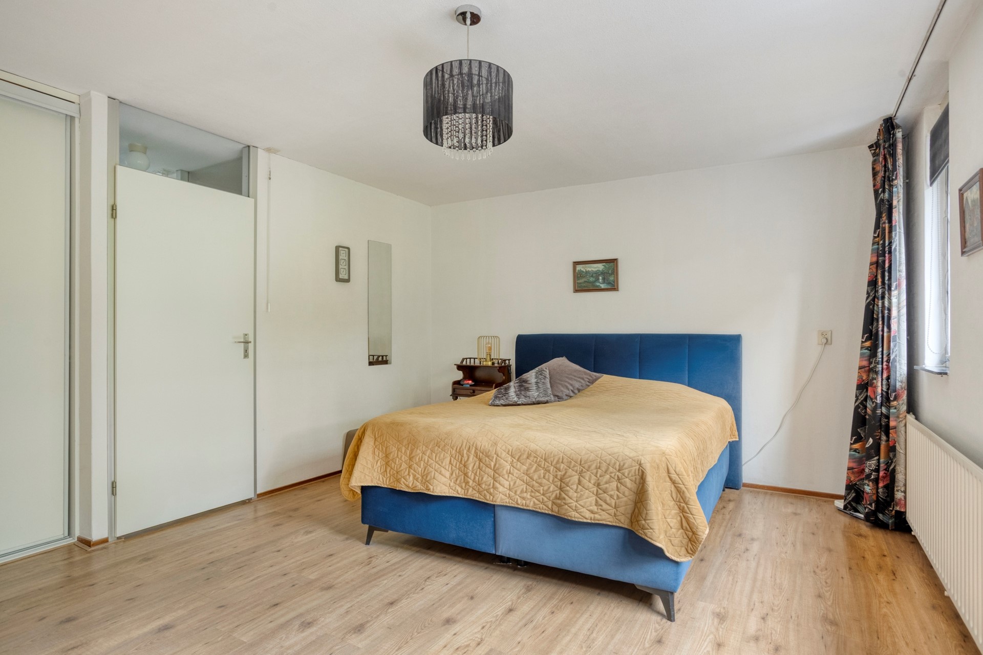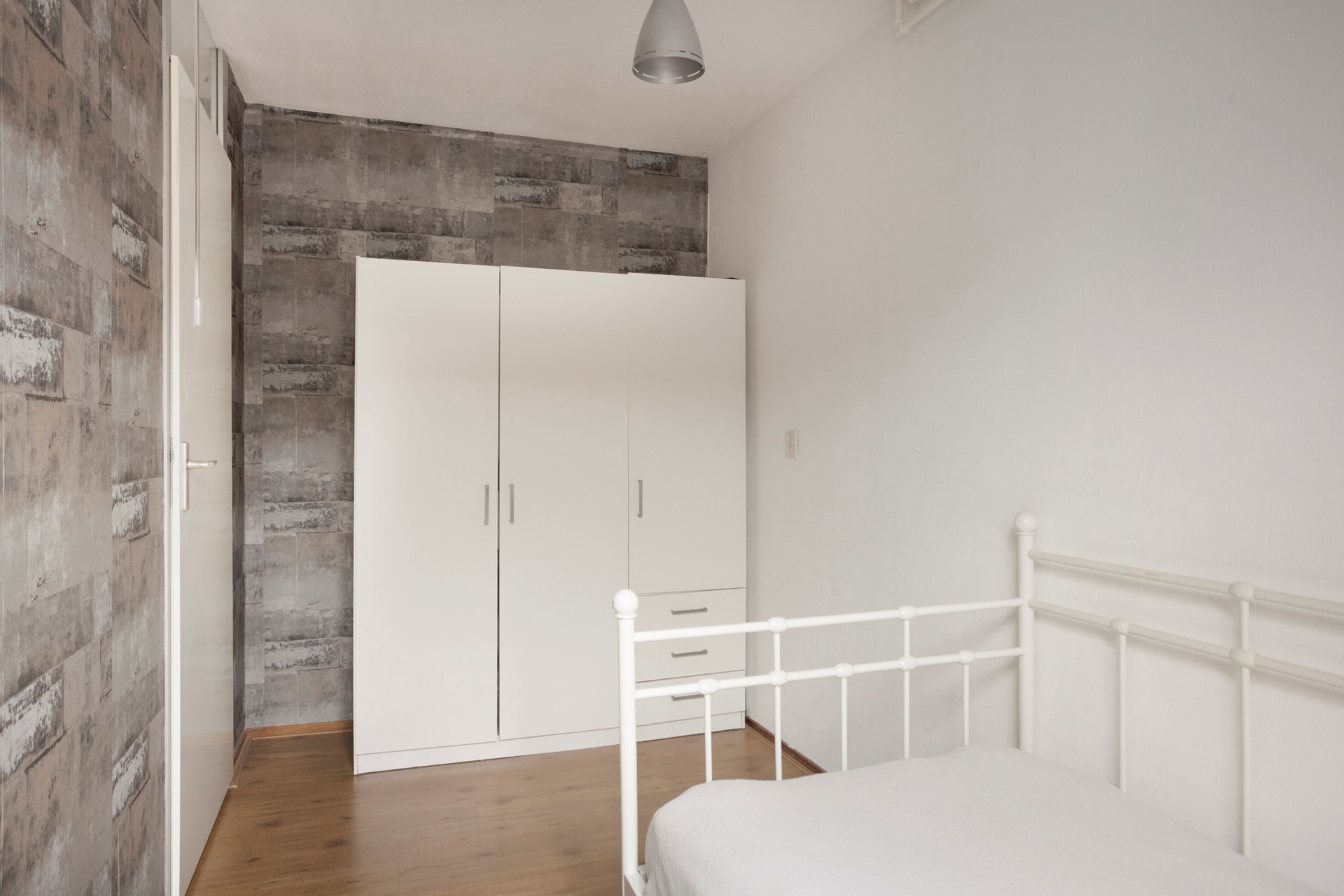 1e Slaapkamer voorzijde – riante slaapkamer over de gehele breedte van de woning met een vaste kastenwand, het raam kan open en een deur geeft toegang tot het balkonnetje met zicht op veel groen en de speelveldjes. Alleen deze kamer heeft nog enkel glas in de houten kozijnen en mocht het nodig zijn dan kunnen hier 2 kamers worden gerealiseerd.