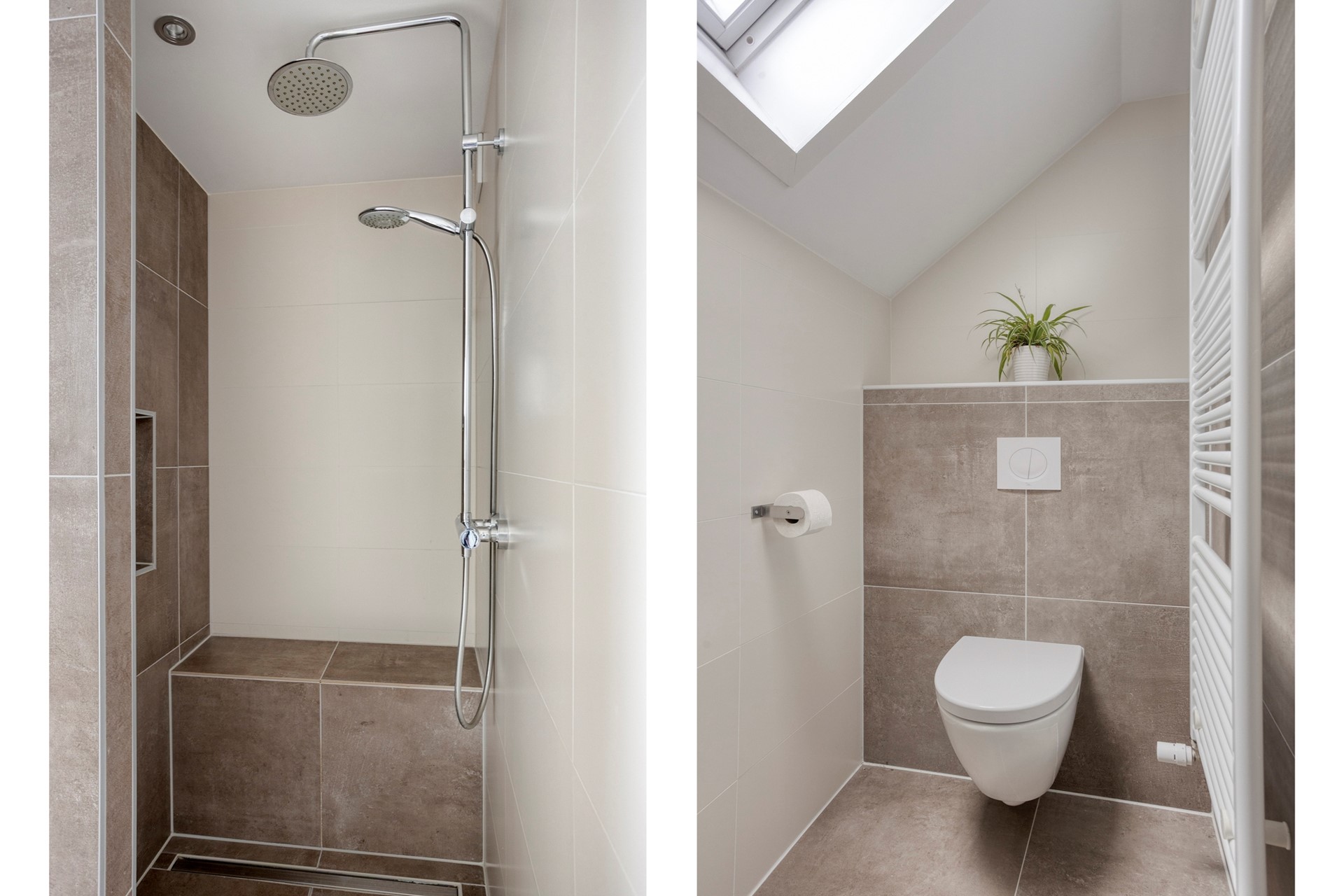 De badkamer met modern betegelde wanden en dito vloer voorziet in een 2e wandcloset, designradiator, wastafelmeubel met zijplateau’s, 2 laden, een spiegelkastje met verlichting en tot slot een douchehoek met thermostaatkraan, hand- en regendouche, drainafvoer, koofje voor de shampoo en een zitplateau. Hoe lekker is dat … na een lange werkdag even zitten tijdens het douchen! Voor de ventilatie zit er een centraal afzuigsysteem en het Velux dakraam kan open voor de natuurlijke ventilatie. Het plafond is gestuukt en is voorzien van inbouwspots. Voor de wasmachine is een betegelde ombouw gemaakt met een eveneens betegeld plateau.