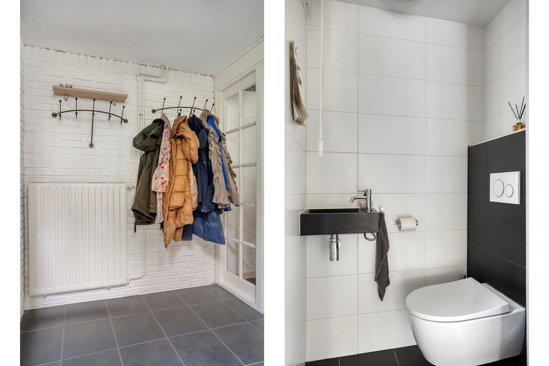 De toiletruimte heeft licht betegelde wanden en de donkere vloer is vanuit de hal doorgelegd. U treft hier een wandcloset, Belgisch hardstenen fonteintje en natuurlijke ventilatie. Een roededeur met zijramen geeft toegang tot de living.