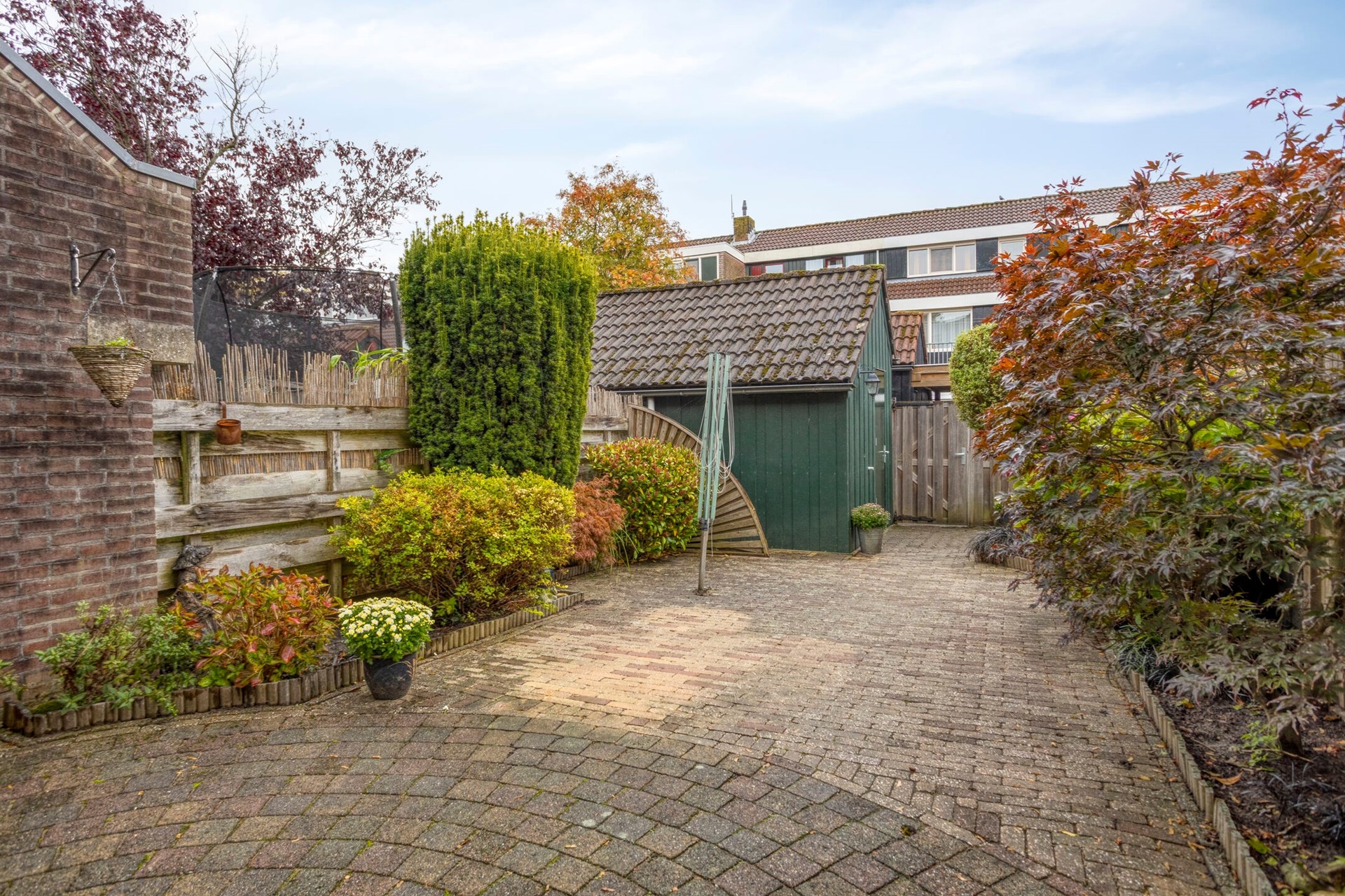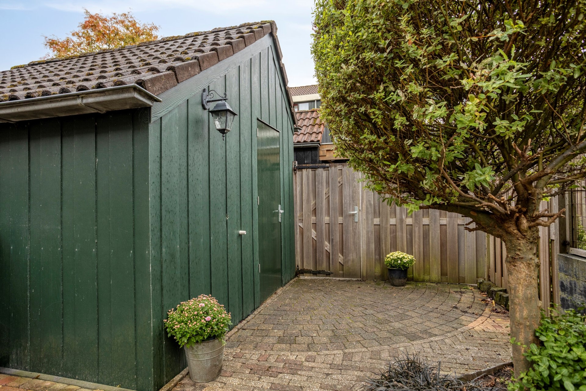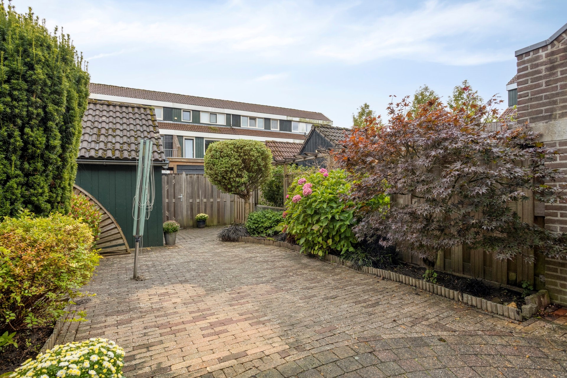 De zonnig gelegen tuin op het zuidoosten is grotendeels bestraat en in de zomer is het echt genieten. Wordt het te warm… dan kan het zonnescherm worden uitgezet! Er is een achterom richting de parkeerplaats en de ruime schuur met een pannen puntdak is bekleed met kunststof.