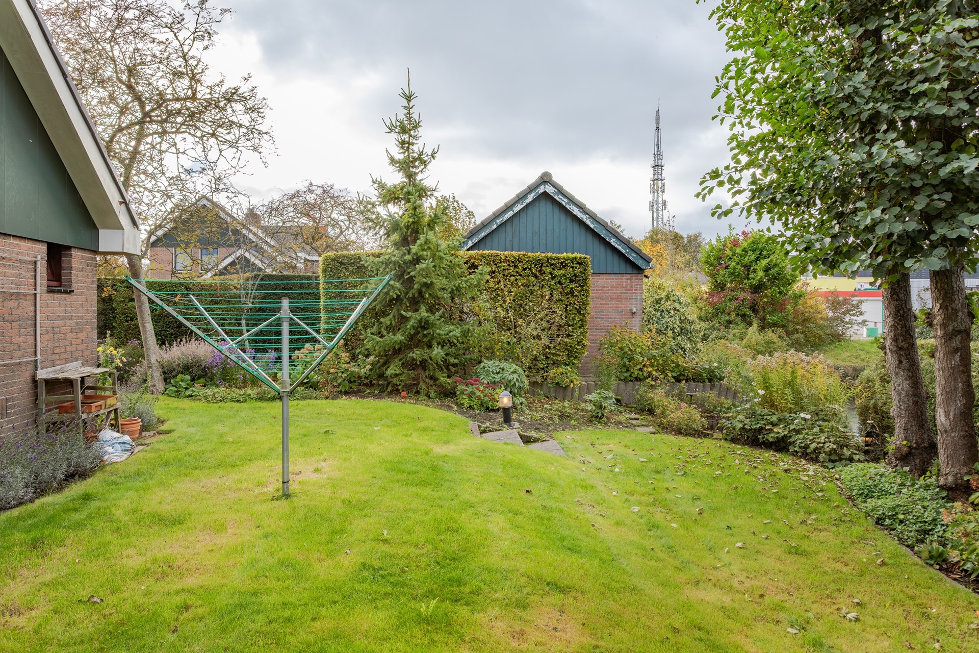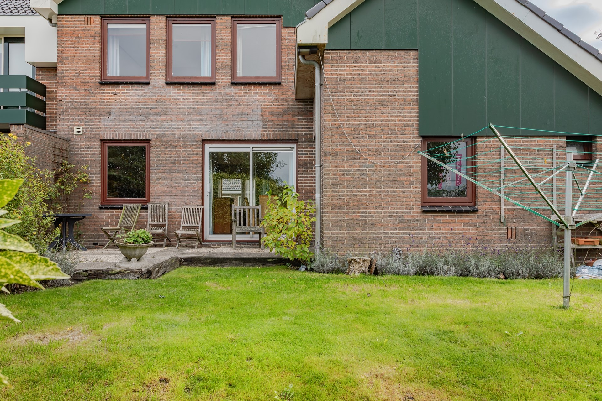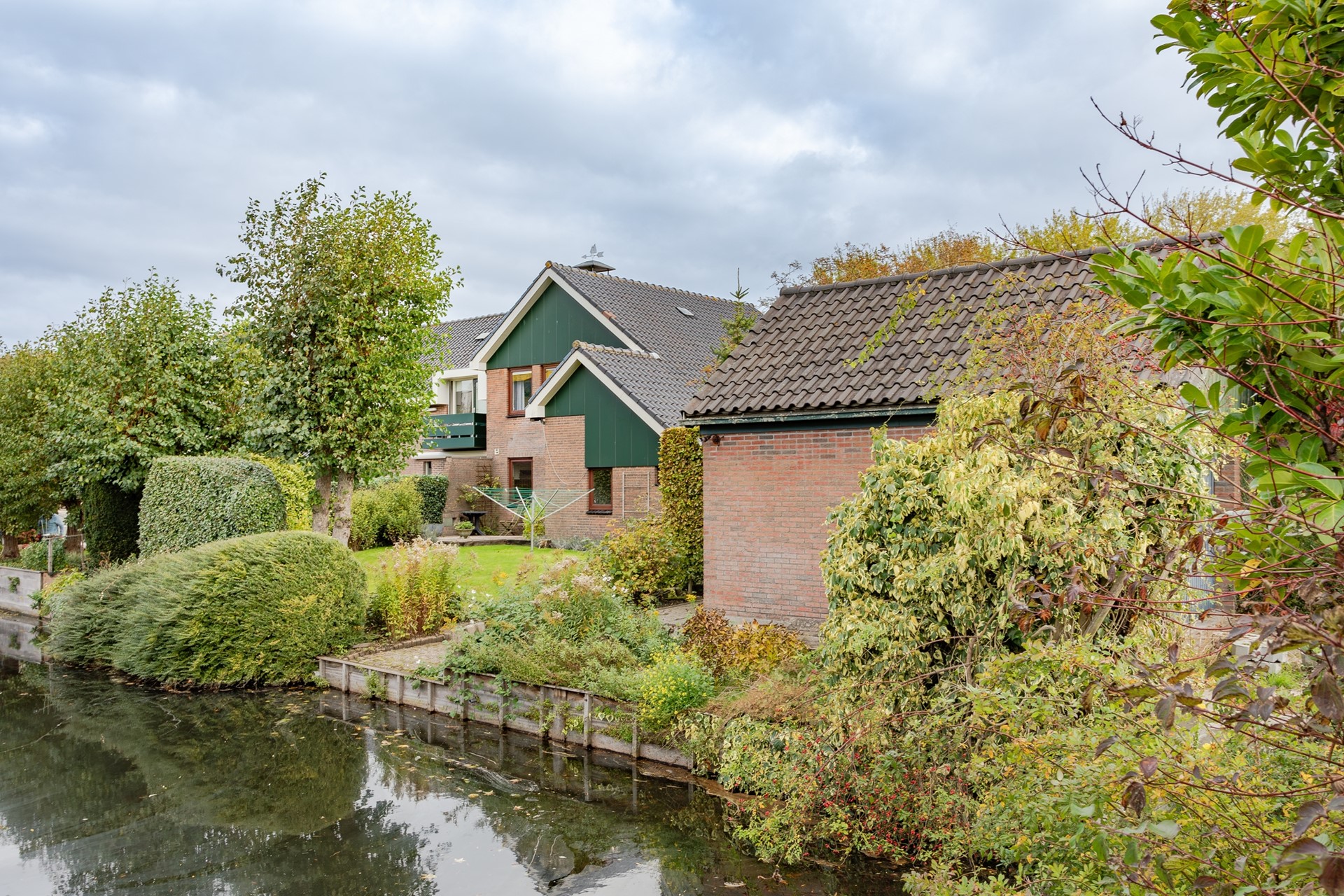 Naast de fraai aangelegde voortuin is er een fijn en heel zonnig zijterras naast de tuinkamer en een brede achtertuin met terras, grasveld en struiken waar u volop van de middag- én avondzon kan genieten. Met de achtertuin op het zuidwesten heeft u echt de ideale tuinligging! De achtertuin grenst aan een brede sloot.