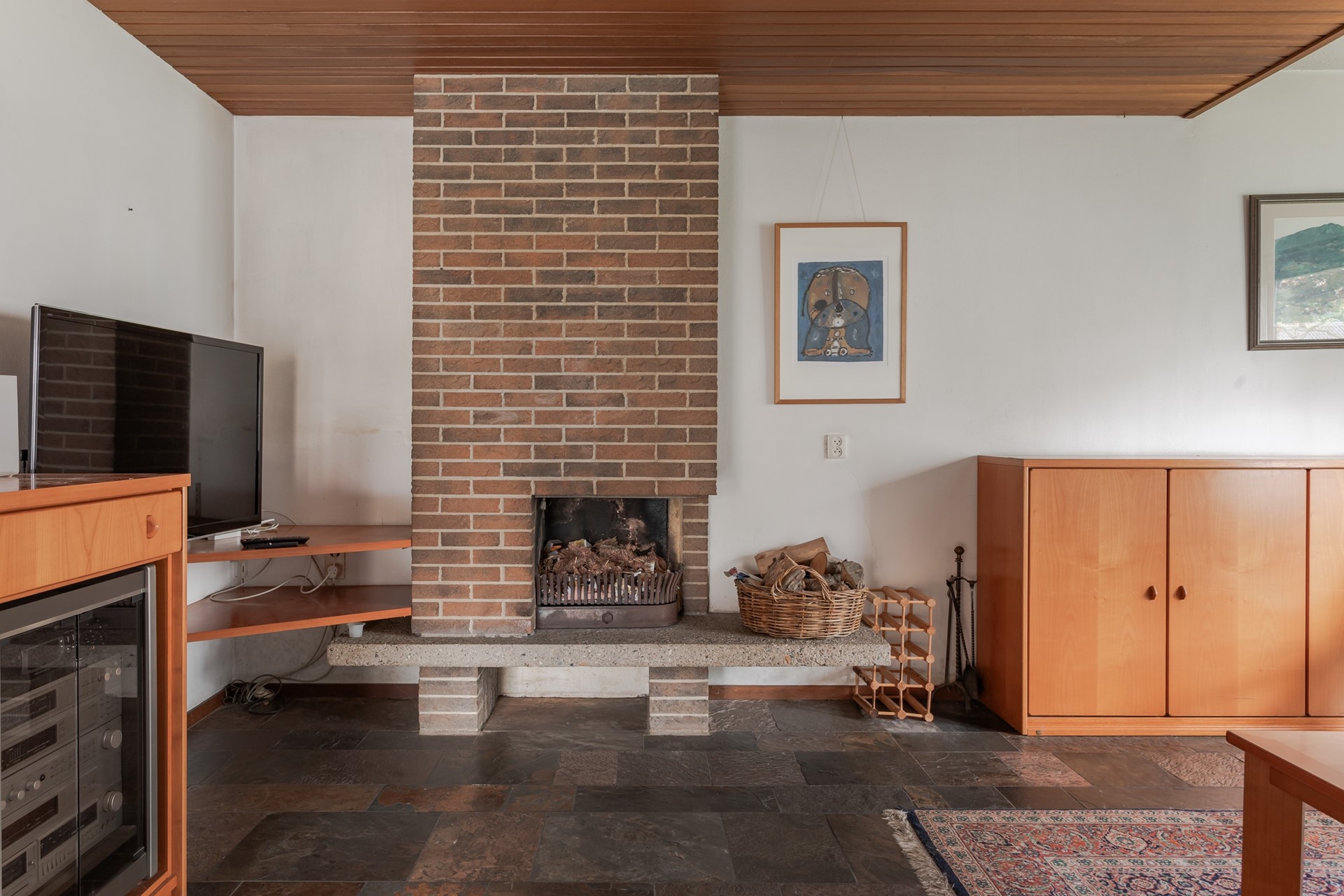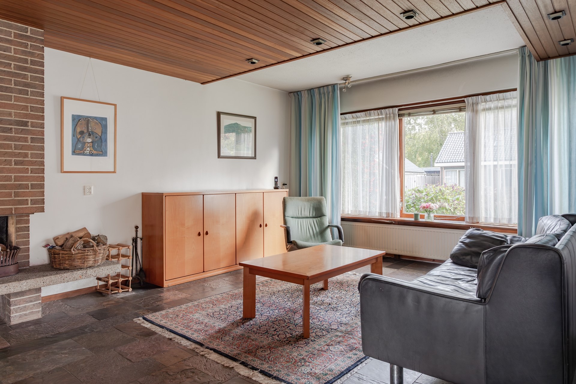 De straatgerichte living heeft een deels verlaagd houten plafond met inbouwspots, een gemetselde schouw met open haard en betonnen plateau, een brede raampartij met dubbel glas in een houten kozijn en een uitzetraam zodat er goed geventileerd kan worden. De wanden zijn gestuukt en bij de eethoek naast de keuken geeft een schuifpui toegang tot de zonnig gelegen tuin.