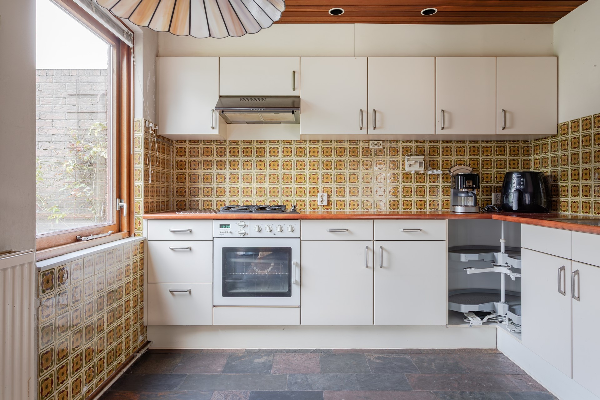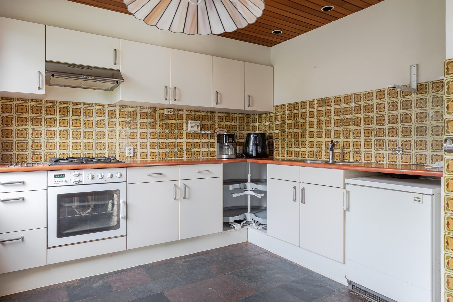 Halfopen keuken met een schuifpui voorzien van dubbel glas bij de eethoek en een convectorput. Een groot tuingericht raam kan open en ook hier is het plafond verlaagd met inbouwspots voor de verlichting. De keuken is in een hoek geplaatst en is gedateerd. Er is wel veel werkblad, retro wandtegels, veel kastruimte, een carrouselkast zonder deurtjes, bovenkastjes, een dubbele spoelbak, 4 pits gaskomfoor, een oven en een afzuigkap. Als er toch een nieuwe keuken geplaatst gaat worden is het qua ruimte mogelijk om een kookeiland te installeren.