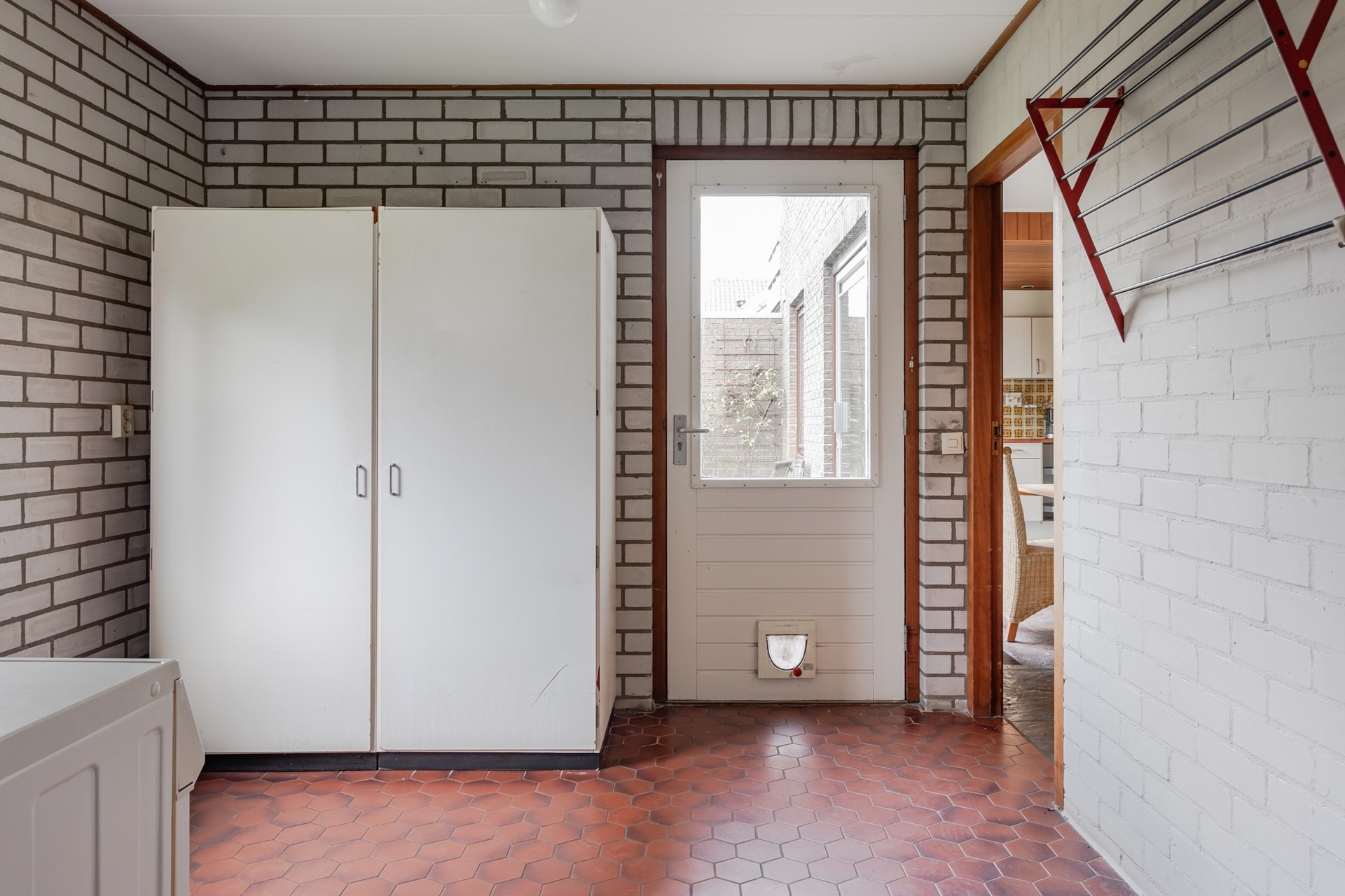 Aansluitend aan de keuken is een ruime bijkeuken met gemetselde spouwmuren, zeshoekige terracotta vloertegels, een grote radiator, uitzetraam en een tuindeur, beiden met enkel glas. De wasmachine- en droger opstelling is hier en het toilet met retro wandtegels, de vloer is doorgelegd en de ruimte voorziet in een staande toiletpot, aansluiting voor een fonteintje, een radiator en een klapraampje voor de natuurlijke ventilatie.