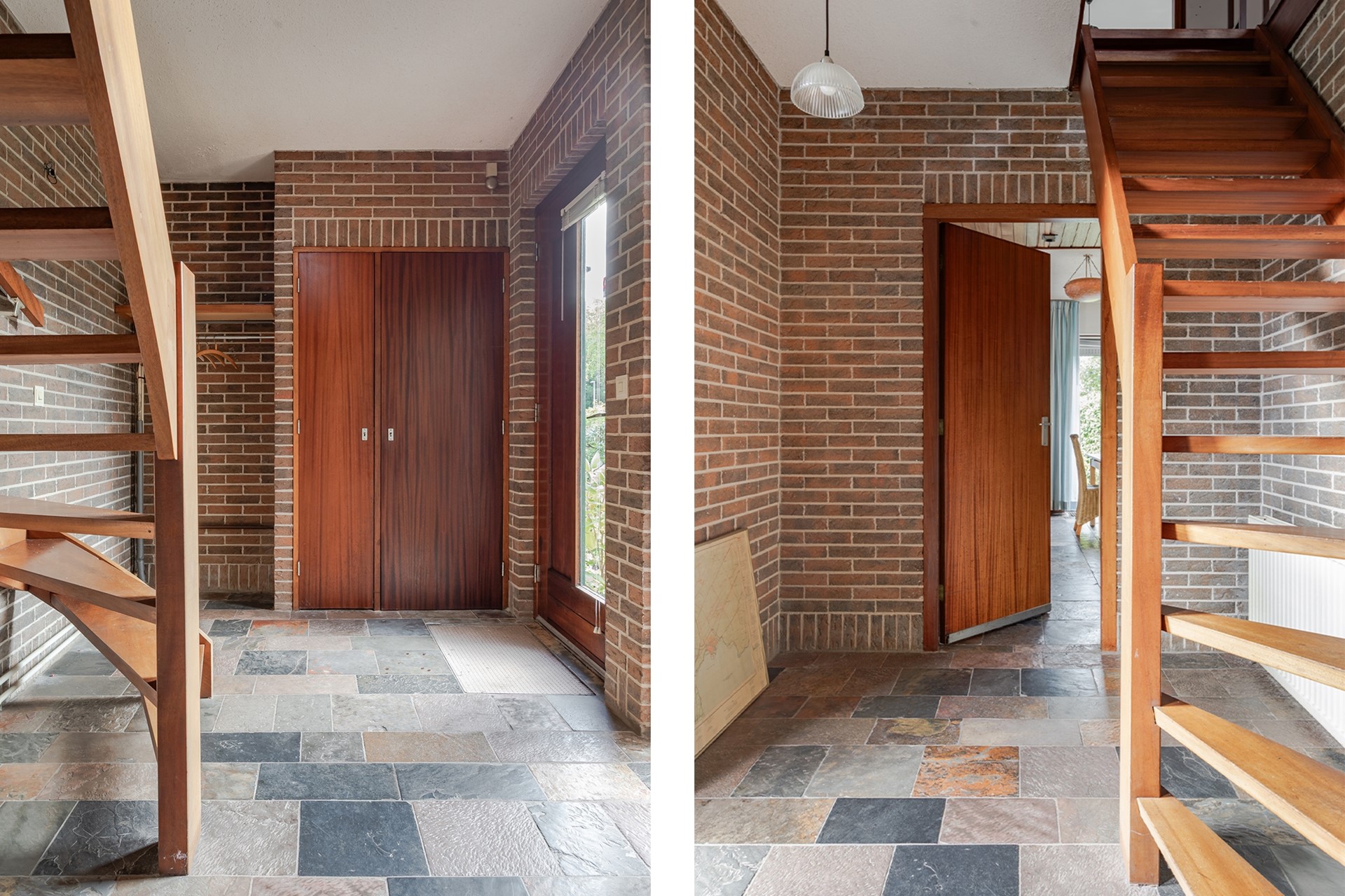 Het pad in de met zorg aangelegde en grote voortuin brengt u naar de voordeur met een zijraam. Achter de voordeur is de hal waar de wanden zijn uitgevoerd in schoon metselwerk en op de vloer liggen kleurrijke plavuizen die zijn doorgelegd in de living. Er is een garderobehoek, de meterkast met een schoenenkast en de trapopgang naar de slaapverdieping.