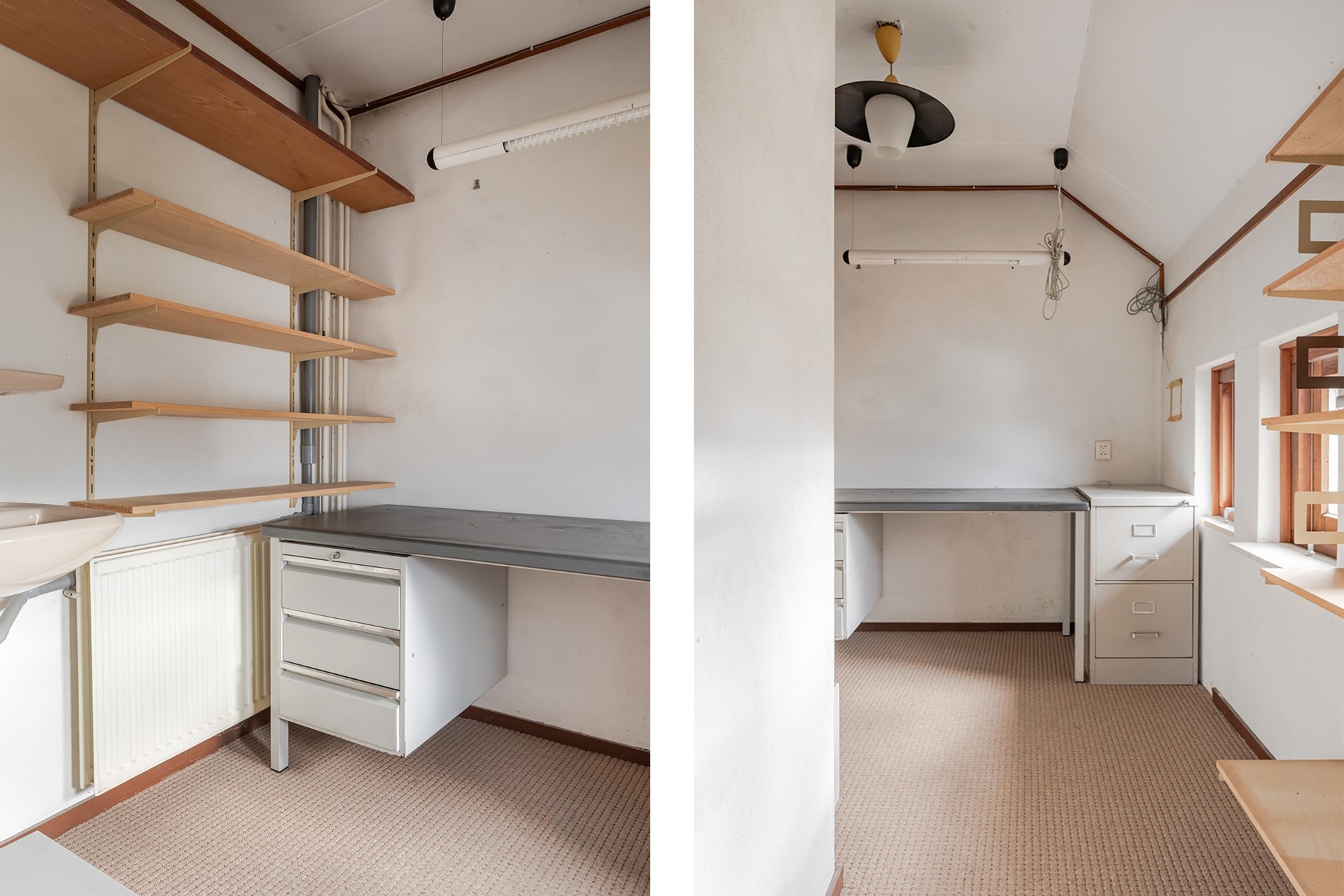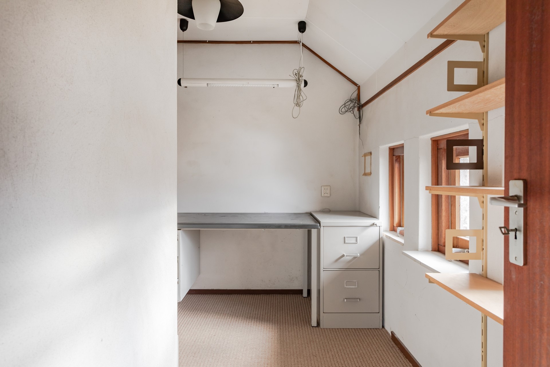 1e Kamer – een leuk formaat kamer wat altijd als kantoor is gebruikt maar ook uiterst geschikt is als kleedkamer. De wanden zijn gestuukt en er zijn 3 kleine uitzetraampjes in een hardhouten kozijn met enkel glas.