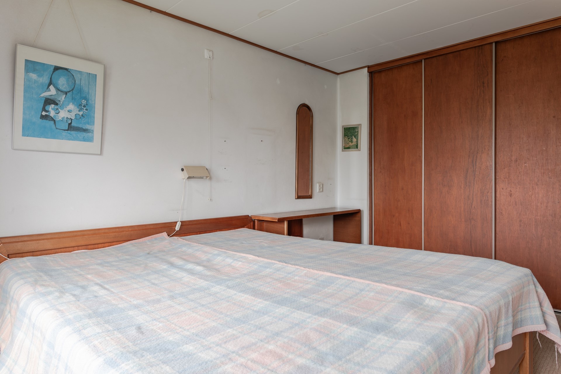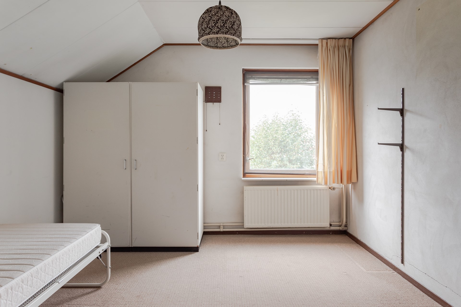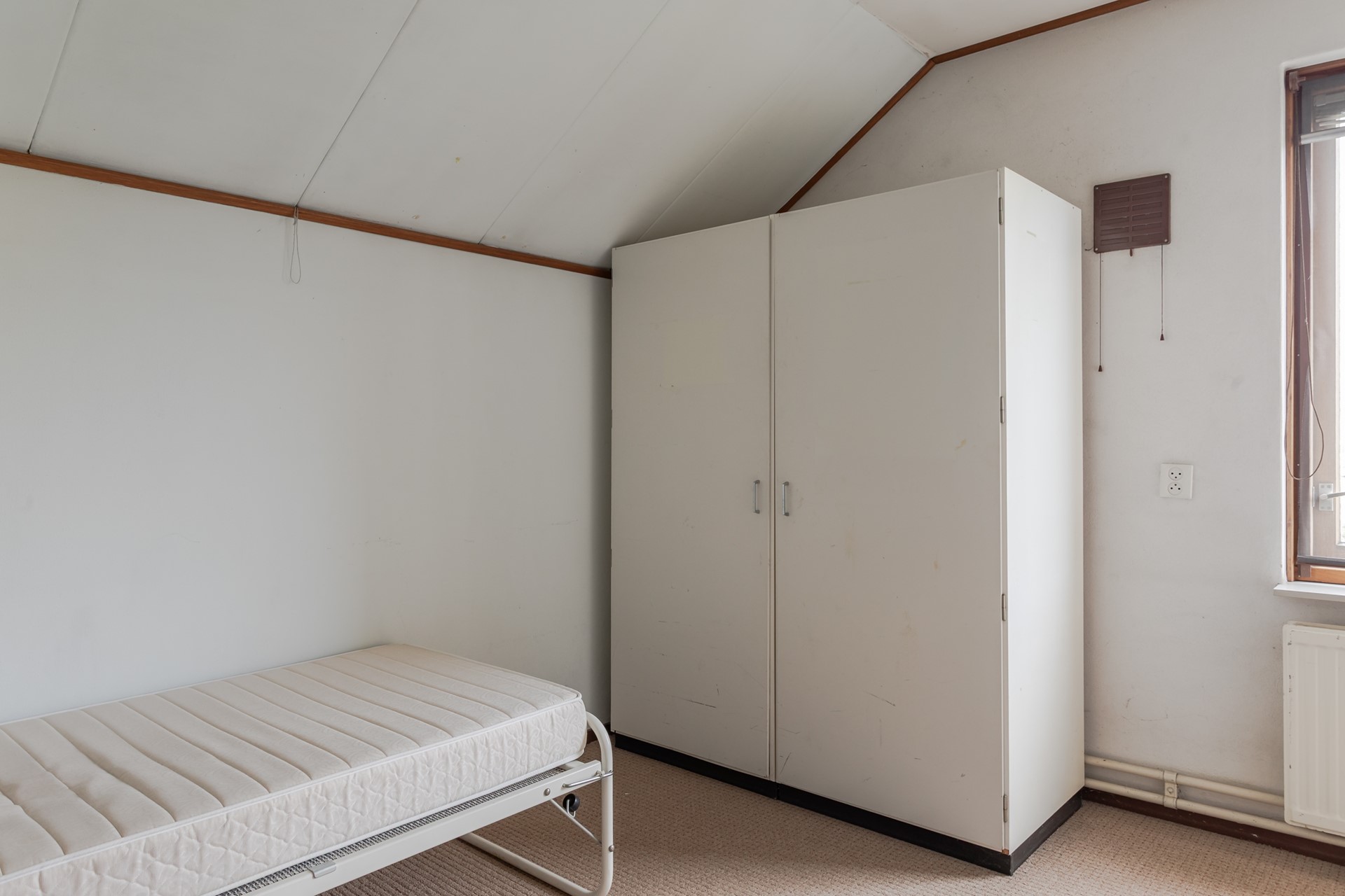 3e Slaapkamer achterzijde – royale kamer met recht opgetrokken en gestuukte wanden. Er zijn 2 uitzetramen met enkel glas en een vaste kledingkast.
