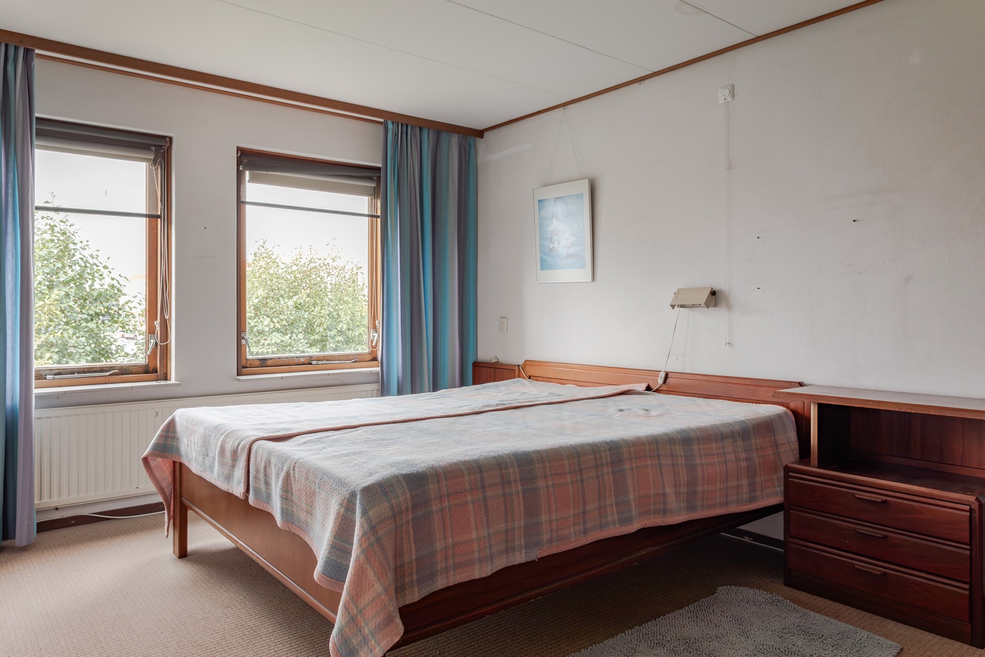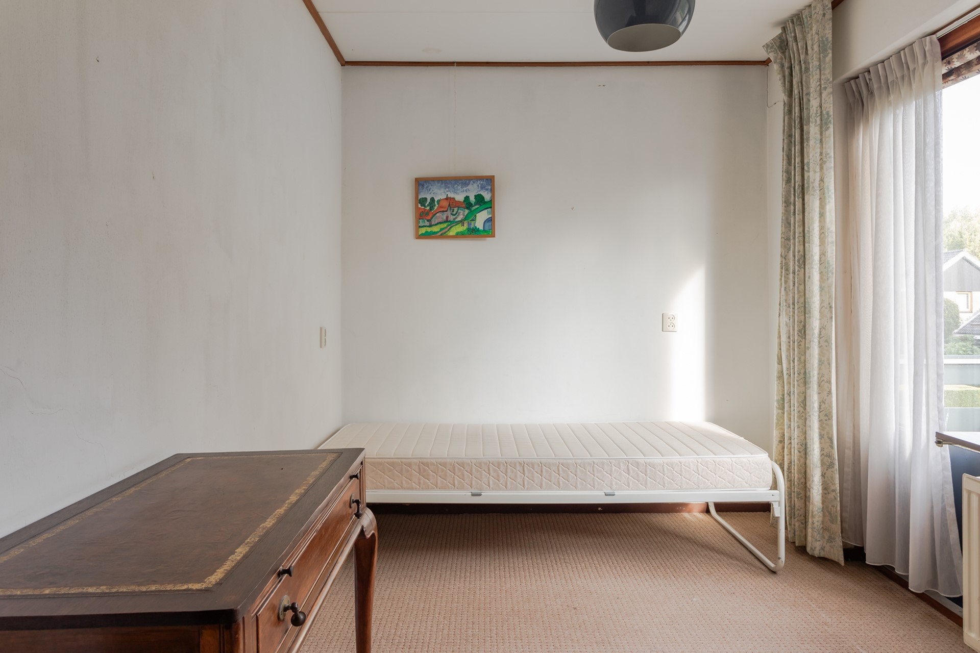 2e Slaapkamer achterzijde – ruime kamer met gestuukte wanden, groot uitzetraam met enkel glas, ventilatierooster in de spouwmuur en een wastafel.