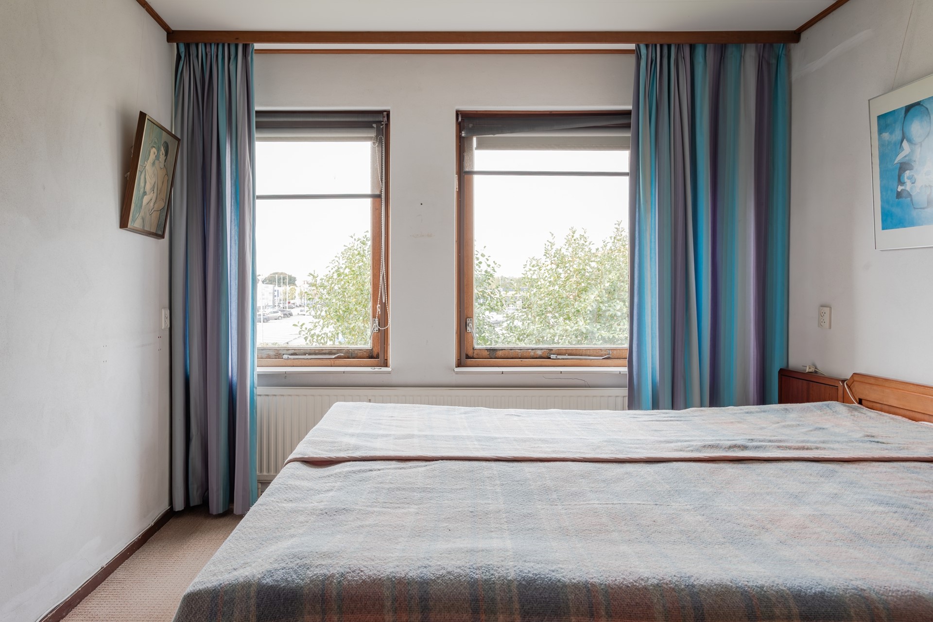 4e Slaapkamer voorzijde – ruime kamer met recht opgetrokken en gestuukte wanden, groot raam en een deur naar het balkon, ook beiden met enkel glas.