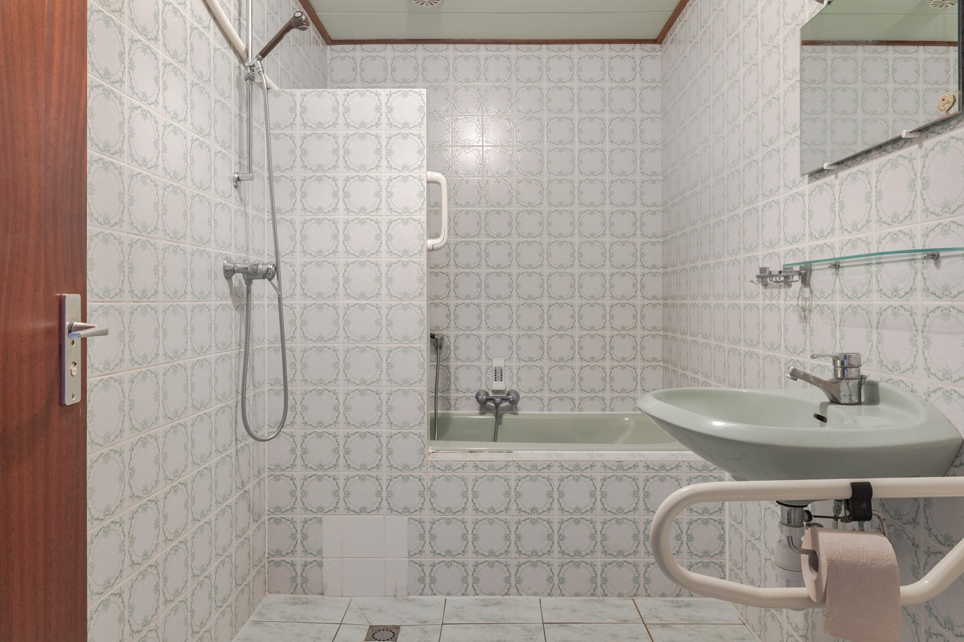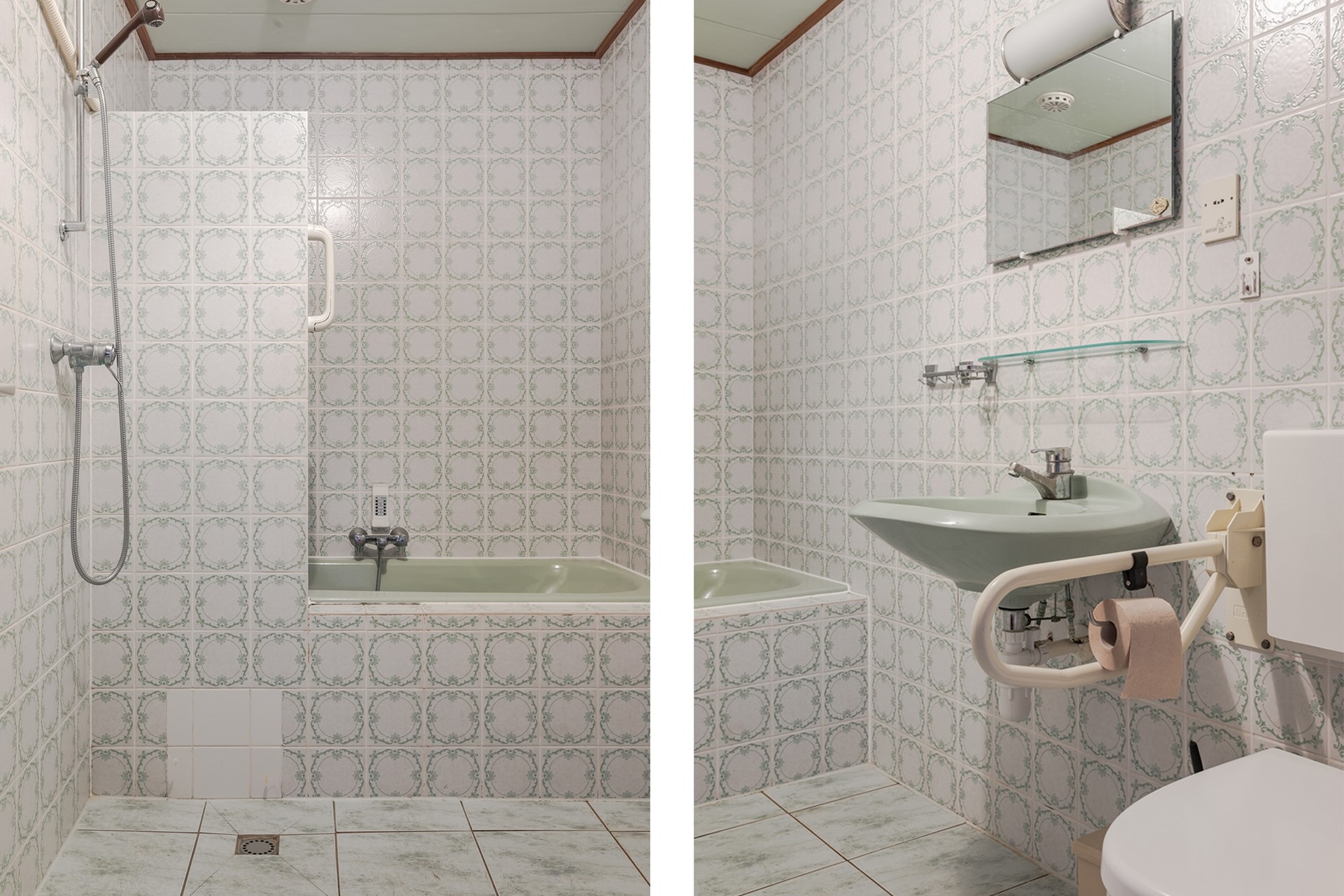 Ruime inpandige badkamer met retro wandtegels en lichte vloer. Je stapt echt de jaren 70 in!! De badkamer voorziet in een ligbad met mengkraan en handdouche, douchehoek met mengkraan, wastafel, radiator en een 2e toilet.