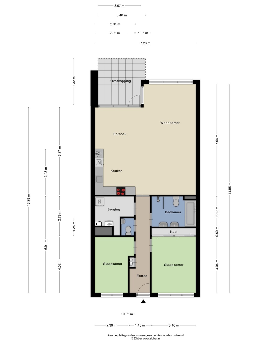 In de zonnige tuin kunt u heerlijk zitten met een groot gezelschap, want inclusief de overkapping heeft de tuin links een lengte van 5.95 meter en rechts 4.18 meter, over de volle breedte van het appartement, 7.31 meter. Zoals al eerder gezegd, mooi uitzicht over de tuin van de résidence! Het terras is volledig betegeld met links en rechts op de hoeken een leuke houten plantenbak. Op het rechter gedeelte is op de gevel een elektrisch bedienbaar zonnescherm gemonteerd, ideaal tijdens (te) zomerse dagen!