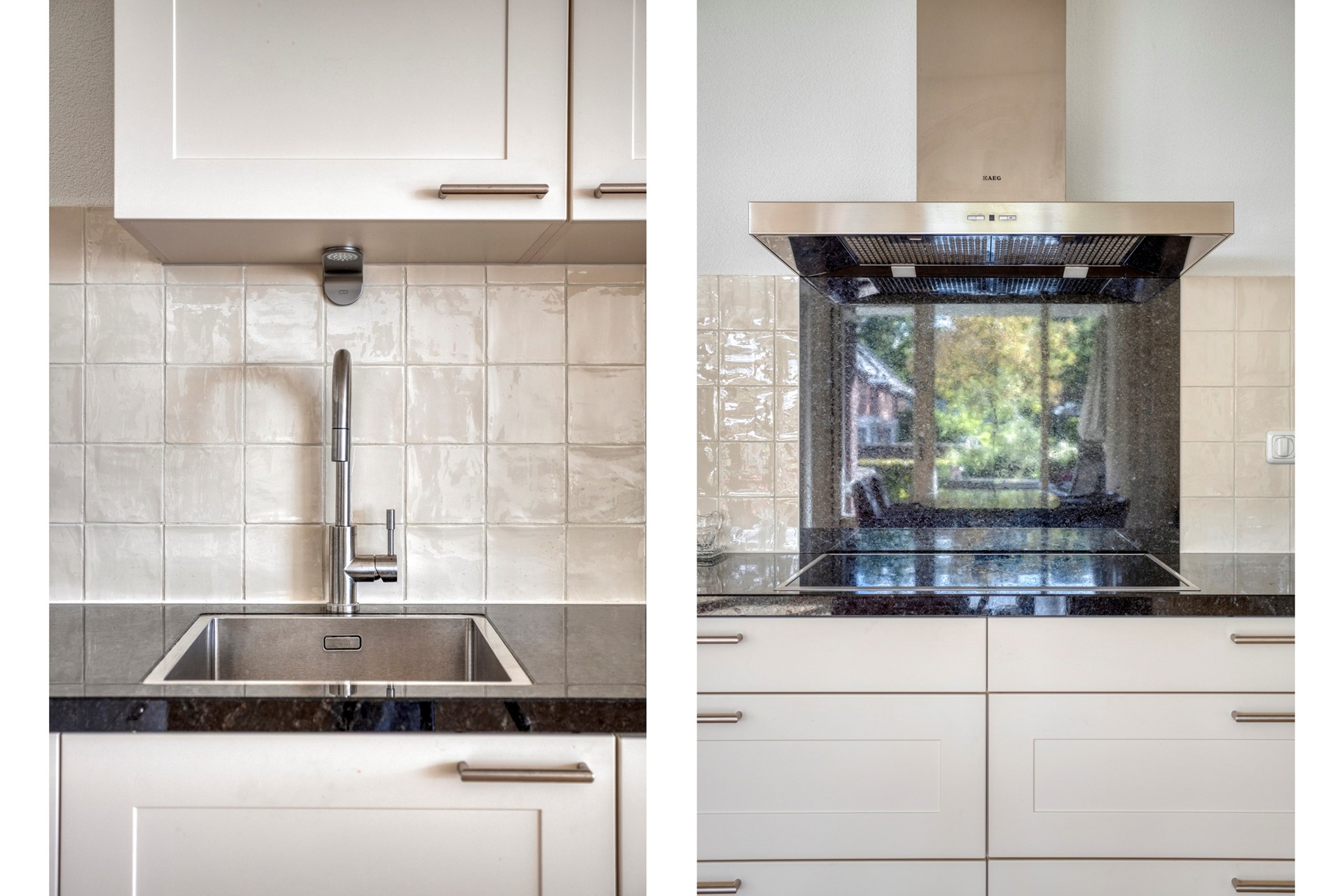 De moderne hoekkeuken is in 2016 vernieuwd en ziet er erg netjes uit. Strakke crèmewitte onder- en bovenkasten en laden en op de wand een hoogglans tegeltje in landelijke stijl, een tintje donkerder. U beschikt over de volgende AEG en Bosch inbouwapparatuur: koelvries-combinatie, vaatwasser (2024 nog vernieuwd), combi oven-magnetron en een vierpits inductiekookplaat met afzuigkap. Het geheel is afgewerkt met een donker natuurstenen werkblad.