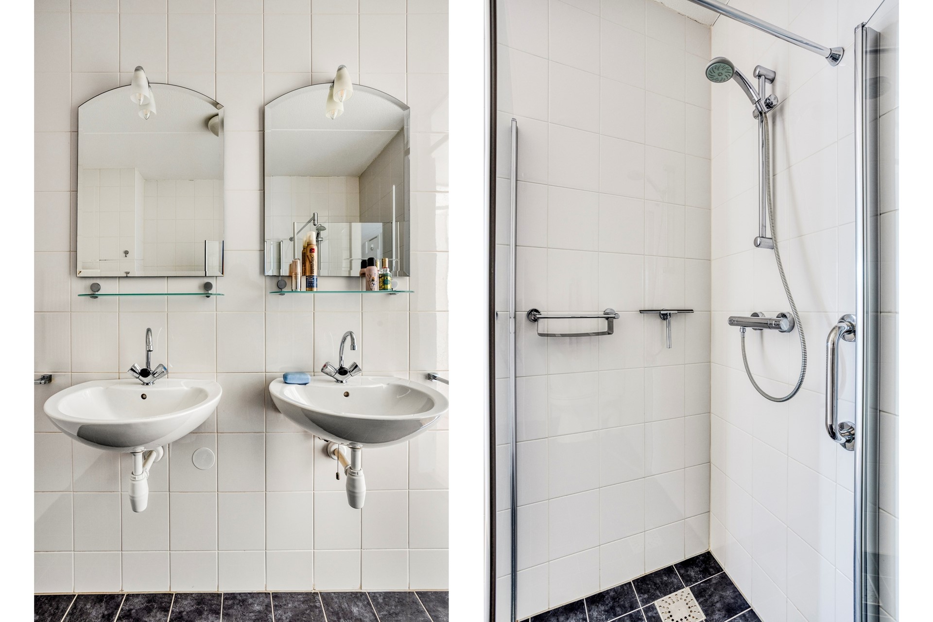 Zeer complete en tijdloze badkamer met dubbele wastafel, dubbel planchet en twee spiegels, een ligbad, toilet, en een inloopdouche voorzien van een glazen deur. Geheel betegeld tot aan het plafond, met op de wand een neutrale witte tegel, en op de vloer een donkergrijze tint. De separate gasten-toiletruimte heeft dezelfde wand- en vloertegels als de badkamer.