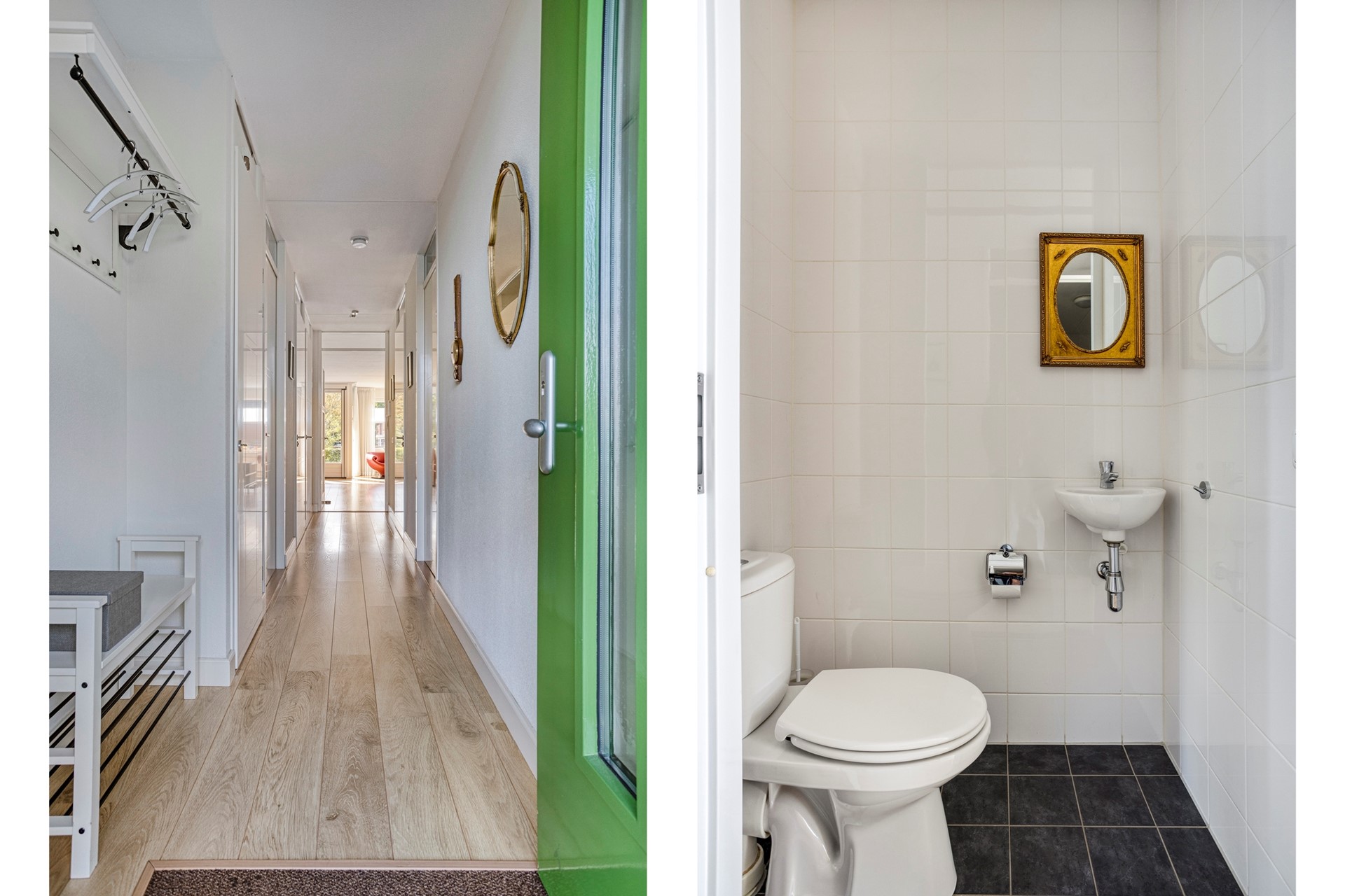 Via de voordeur loopt u de lange hal in met aan weerszijden in totaal zeven deuren naar alle ruimtes. Alle binnendeuren zijn van het merk Svedex; stijlvolle, afgelakte paneeldeuren, die niet geschilderd hoeven te worden. We gaan eerst rechtdoor, naar de living…