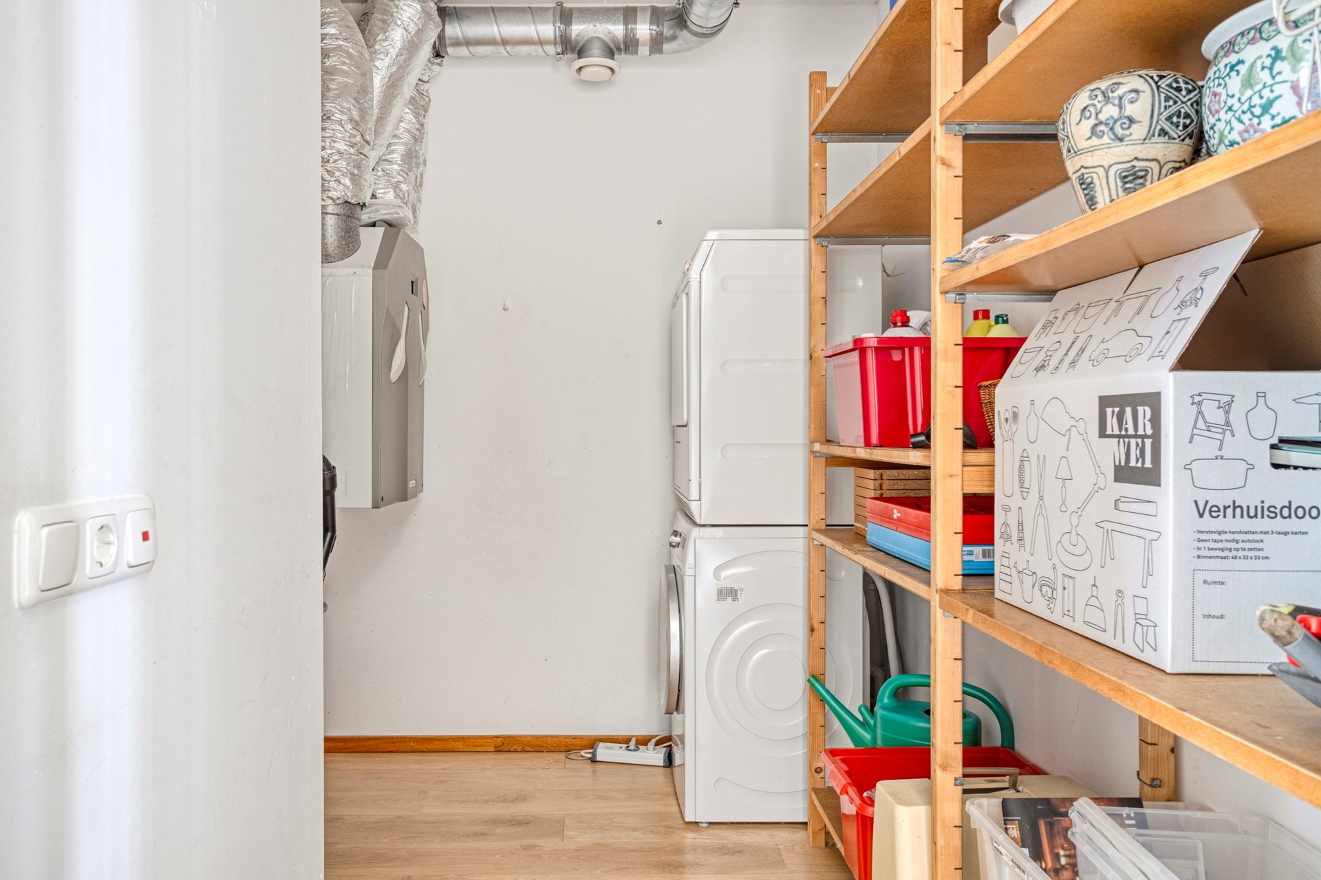 Multifunctionele ruimte waarin uw wasmachine en droger een plek kan krijgen, de CV-ketel(2017), MV-box en WTW-unit opgesteld is, waarna er nog steeds voldoende ruimte is voor diverse spullen op de grond en langs de wand in stellingkasten.
