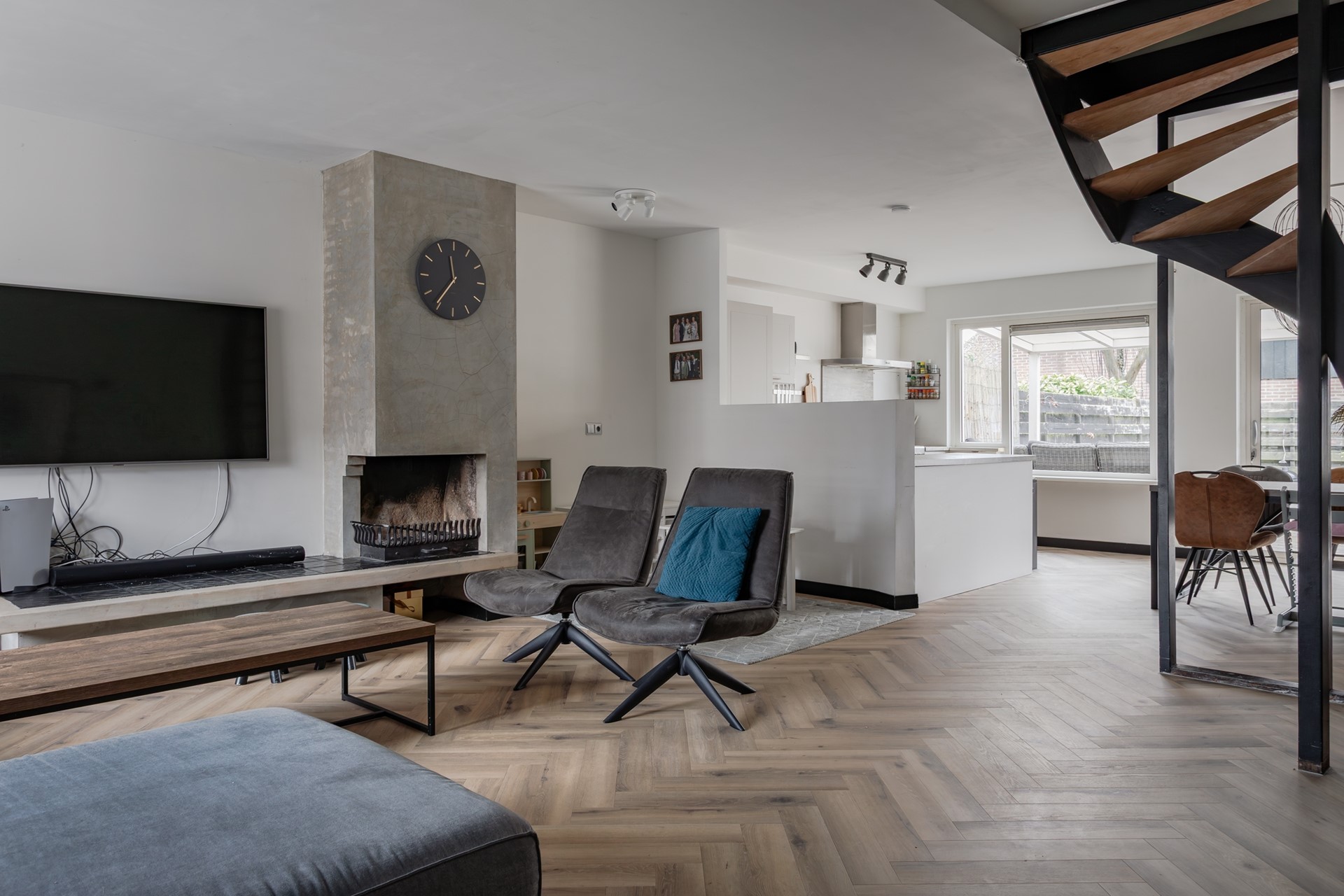 Fijn hoor, zo’n ruime living! De royale zithoek nodigt uit om een grote bank te plaatsen met zicht op de open haard met plateau, wat een gezellige warmte geeft op de koude winteravonden. Op de vloer is pvc in visgraat gelegd met vloerverwarming voor een hele behagelijke warmte, mede vanwege de chips vloerisolatie in de kruipruimte. De wanden en het plafond zijn strak gestuukt en het voorraam is uitgevoerd in een kunststof kozijn met HR++ glas en een ventilatierooster.
