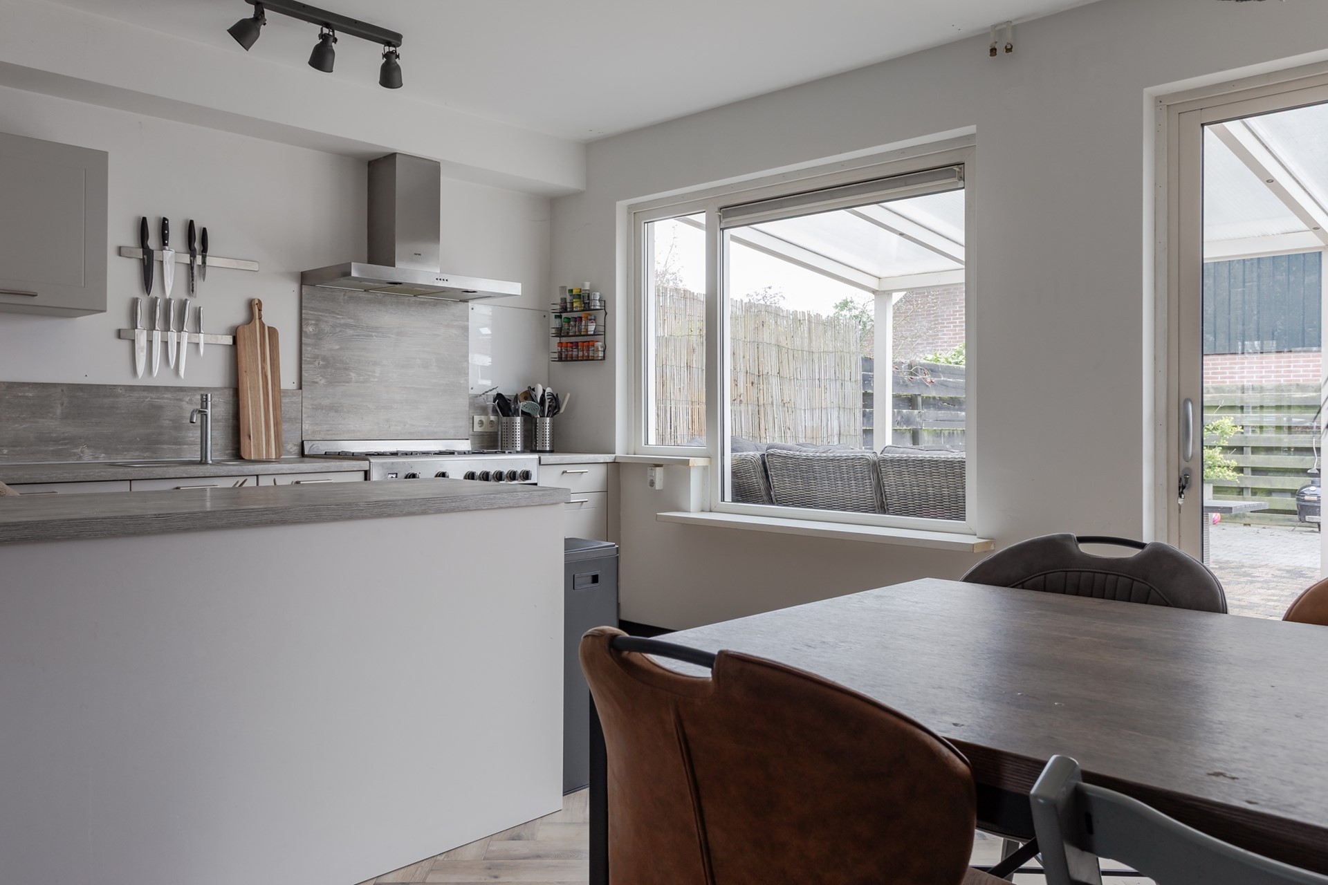 Achter de open trap naar de slaapverdieping is de eethoek naast de keuken met grote raampartij en een schuifpui naar de zonnig gelegen tuin. Het kozijn is uitgevoerd in kunststof met HR++ glas. In de wand bij de eettafel is een sfeervolle elektrische haard ingebouwd.
