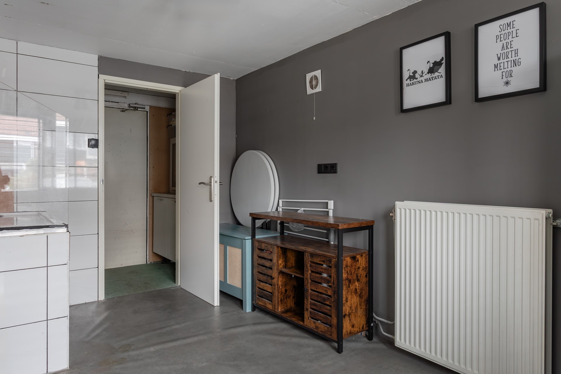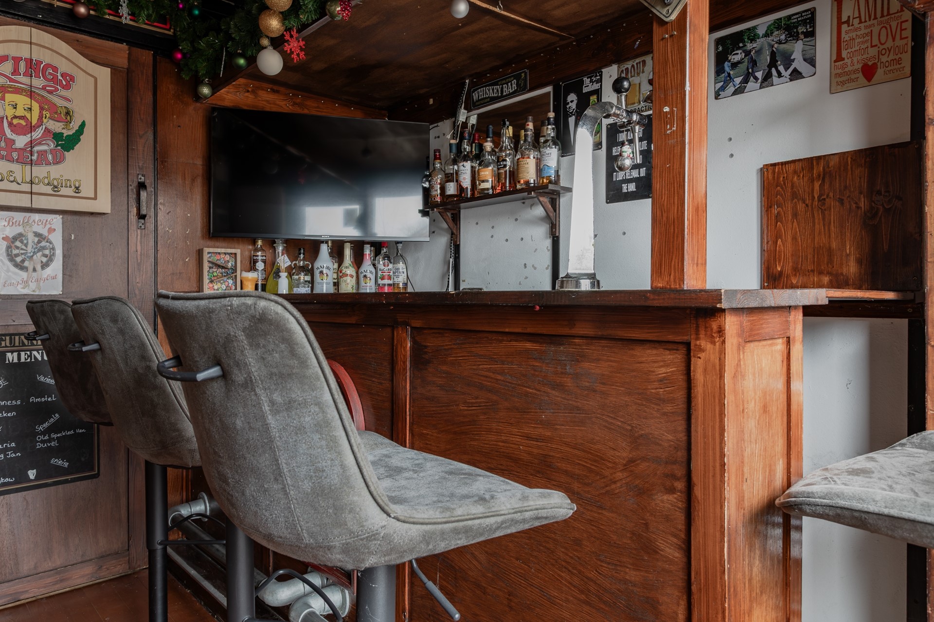 Via een tussenhalletje, wat overigens een fijne bergruimte is, stapt u een heuse “pub” in, compleet met bar en barstoelen, tapkraan en de daarbij behorende gezelligheid. Er ligt een houten vloer, het hoogoplopende plafond geeft een fijne sfeer aan de ruimte en er is een buitendeur met zijraam, beiden met dubbel glas. Echt de ideale plek voor als u tieners heeft, van een feestje houdt of uw eigen wekelijkse “vrijmibo” wil vieren! Radiator aanwezig.